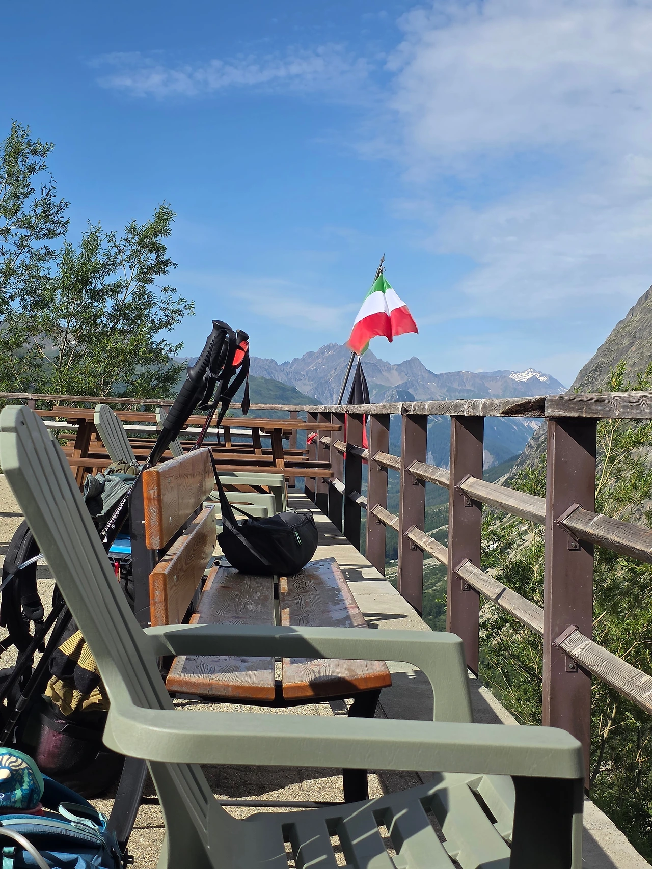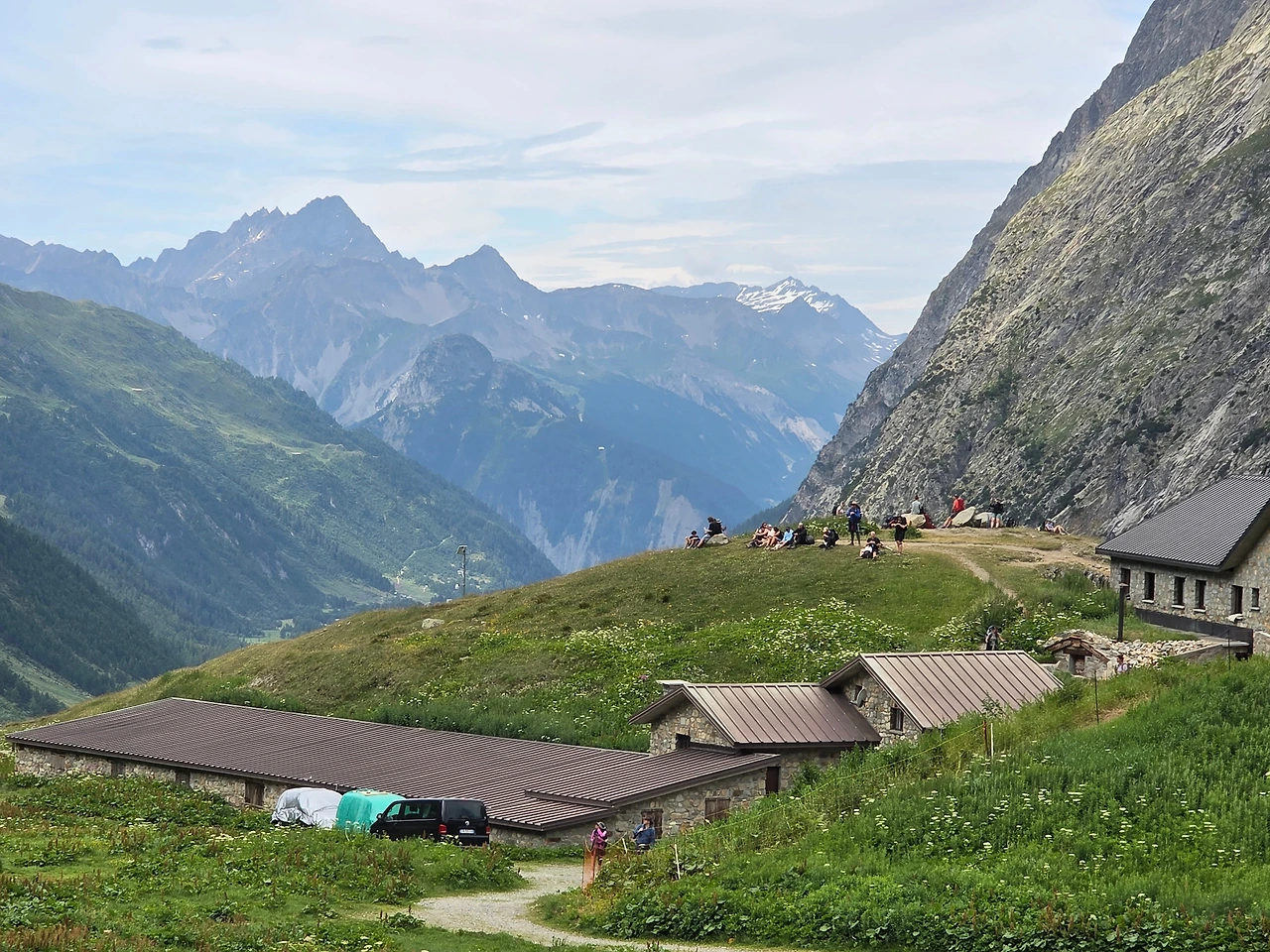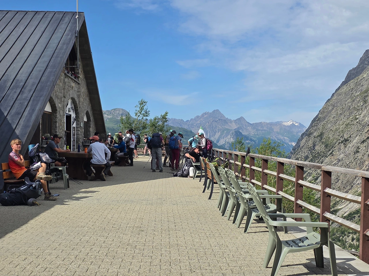 산장에 느긋이 앉아 경치를 관조하는 시간을 갖는다. 걸으면서 느끼는 것과는 다른 풍경이 눈에 들어온다. 만년설을 이고 있는 산과 황량한 산 분위기와는 다르게 녹색으로 뒤덮인 봉우리가 색다른 경관을 선사한다. 이곳까지 자동차가 다닌다는 것이 신기하다. 걷는 것도 벅찬 일인데 멀리 암벽등반 하는 이들도 있다. 사람들의 끝없는 모험심이 참으로 놀랍다