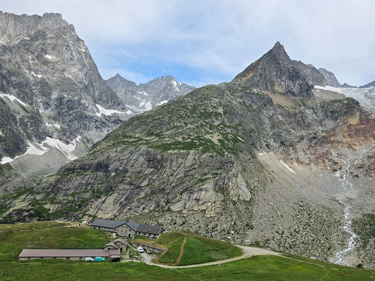 트래킹 하는 이들이 머물다 가는 엘레나 산장이 보인다. 곤한 몸을 쉴 수 있고 식사도 제공되는 반가운 곳이다. 이곳에서 묵을 수도 있지만 그런 기회를 잡기란 쉽지 않은 사안이다. 몽블랑트레킹이 전 세계인들에게 인기가 많아서 무려 1년 전에 예약을 해야 겨우 숙박이 가능하다. 우리에게는 그림의 떡일 뿐이다.