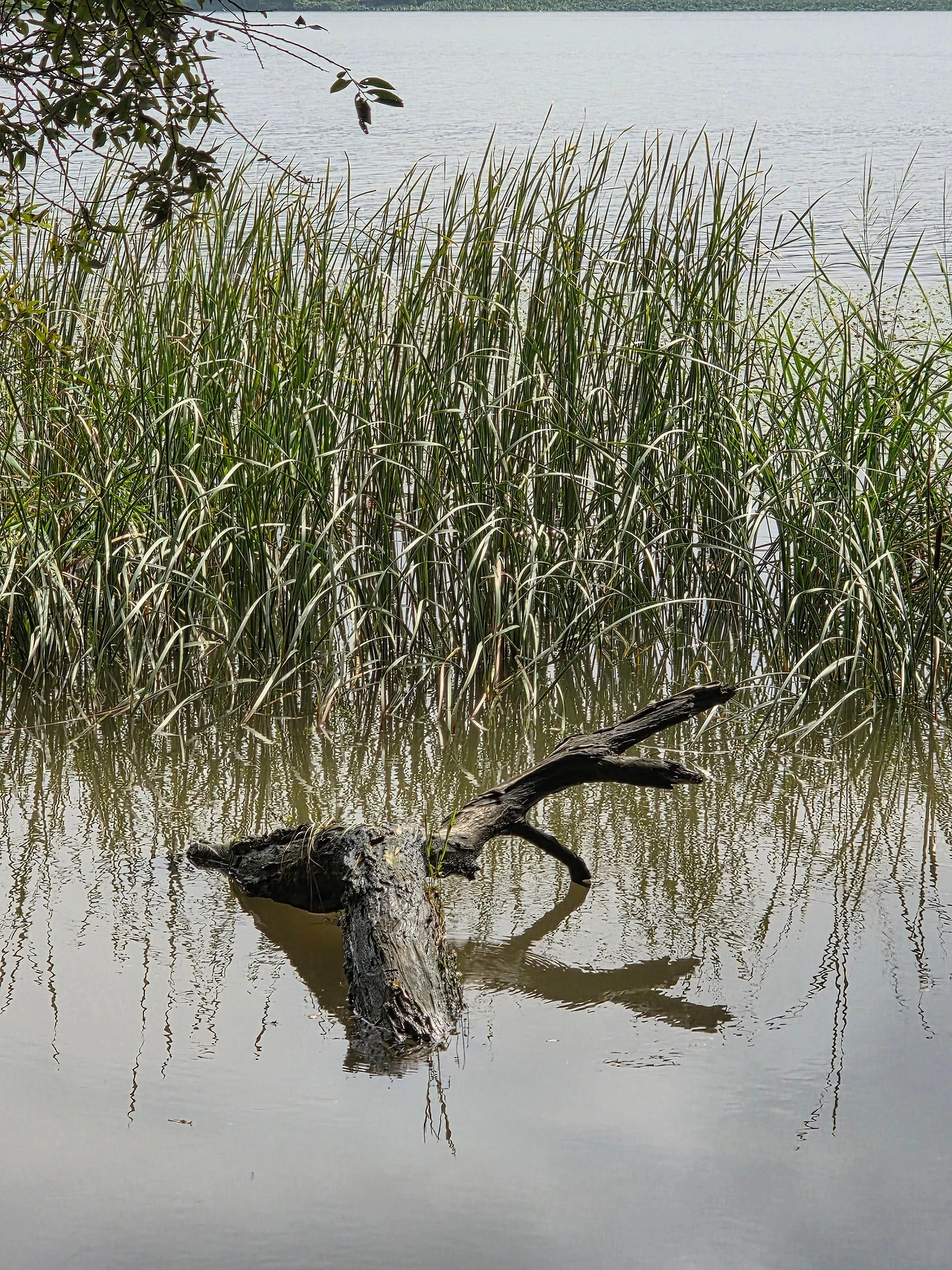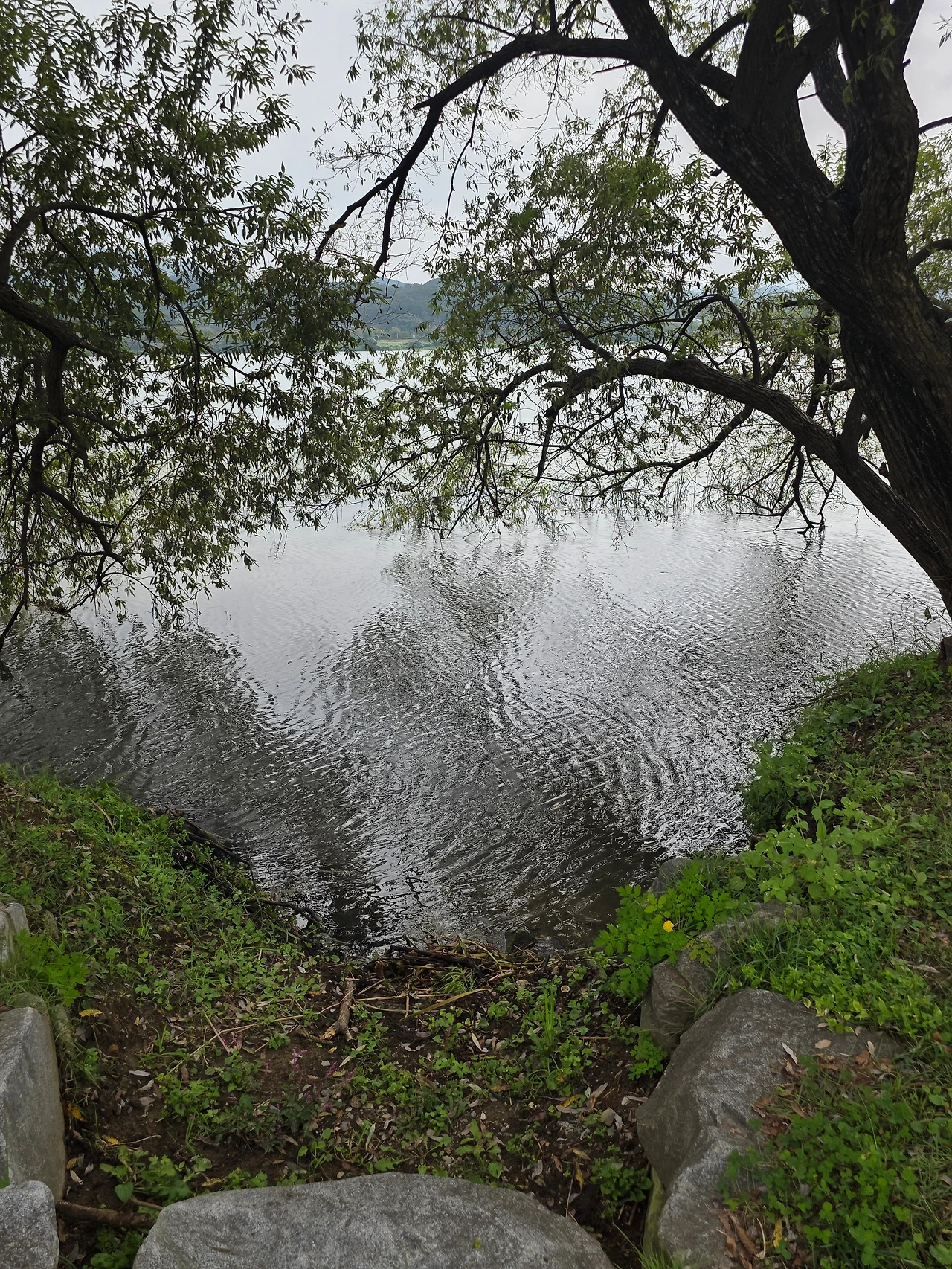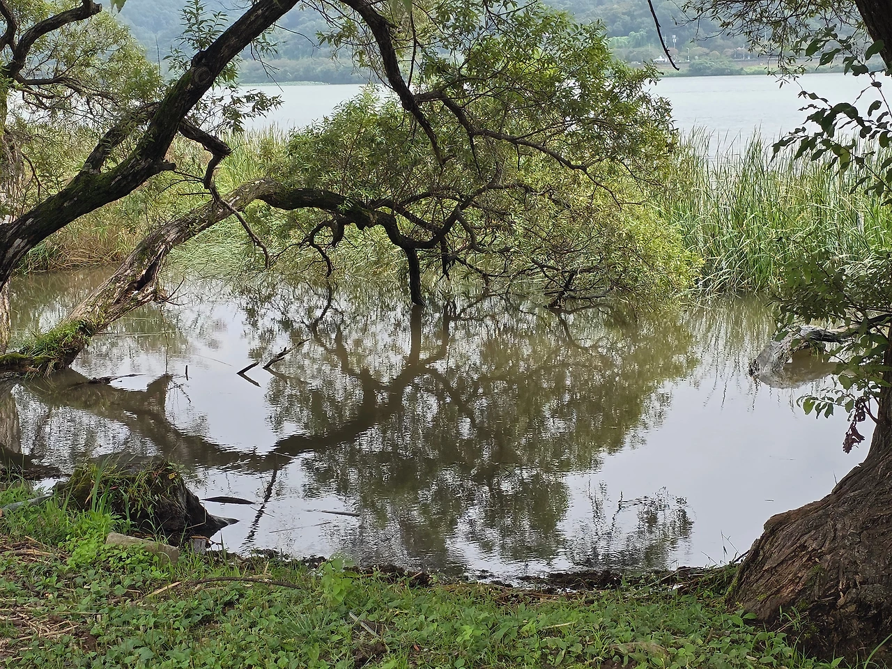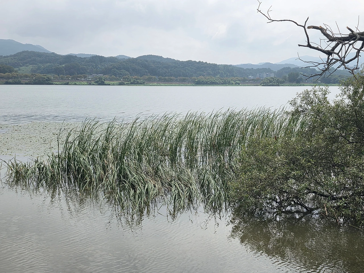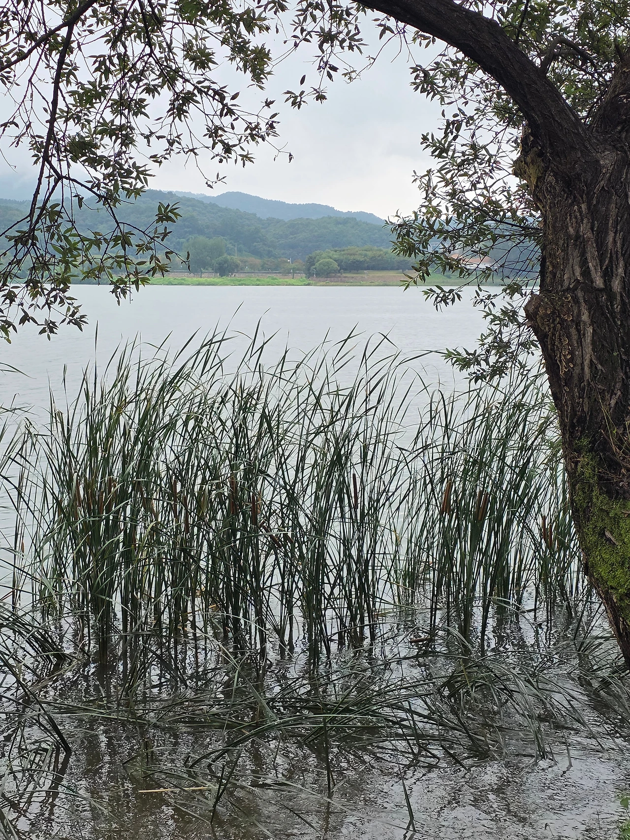 강안에는 부들이 병사들처럼 도열해 있고 꽤 굵은 버드나무들이 가지를 강물에 드리운 모습이 수도승이 명상에 드는 것 같다. 보는 것만으로도 마음이 차분해진다. 자연과 물이 어우러진 곳이 빚어내는 마법이다. 물에 잠긴 고목 그루터기조차도 마음을 숙연하게 한다.