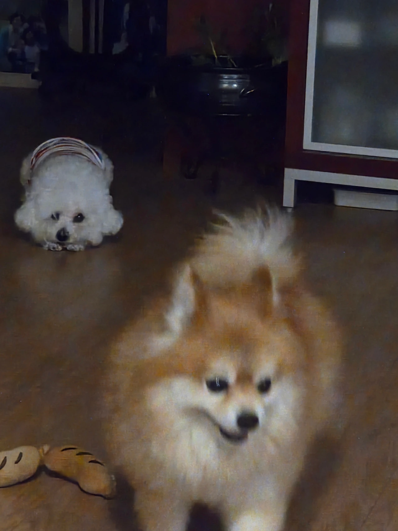 사고를 치고 나서 언제 그랬냐는 표정으로 포미는 앉아서 고양이 마냥 털을 고른다. 아내가 포미더러 행동과 생김새가 꼭 고양이 같다고 하니 고양이라는 소리에 곁에 앉아있던 쁨이가 으르렁 거리며 벌떡 일어선다. 평소에 쁨이는 고양이라는 단어를 듣게 되면 즉각 으르렁 거리는 재미있는 습관이 있다.