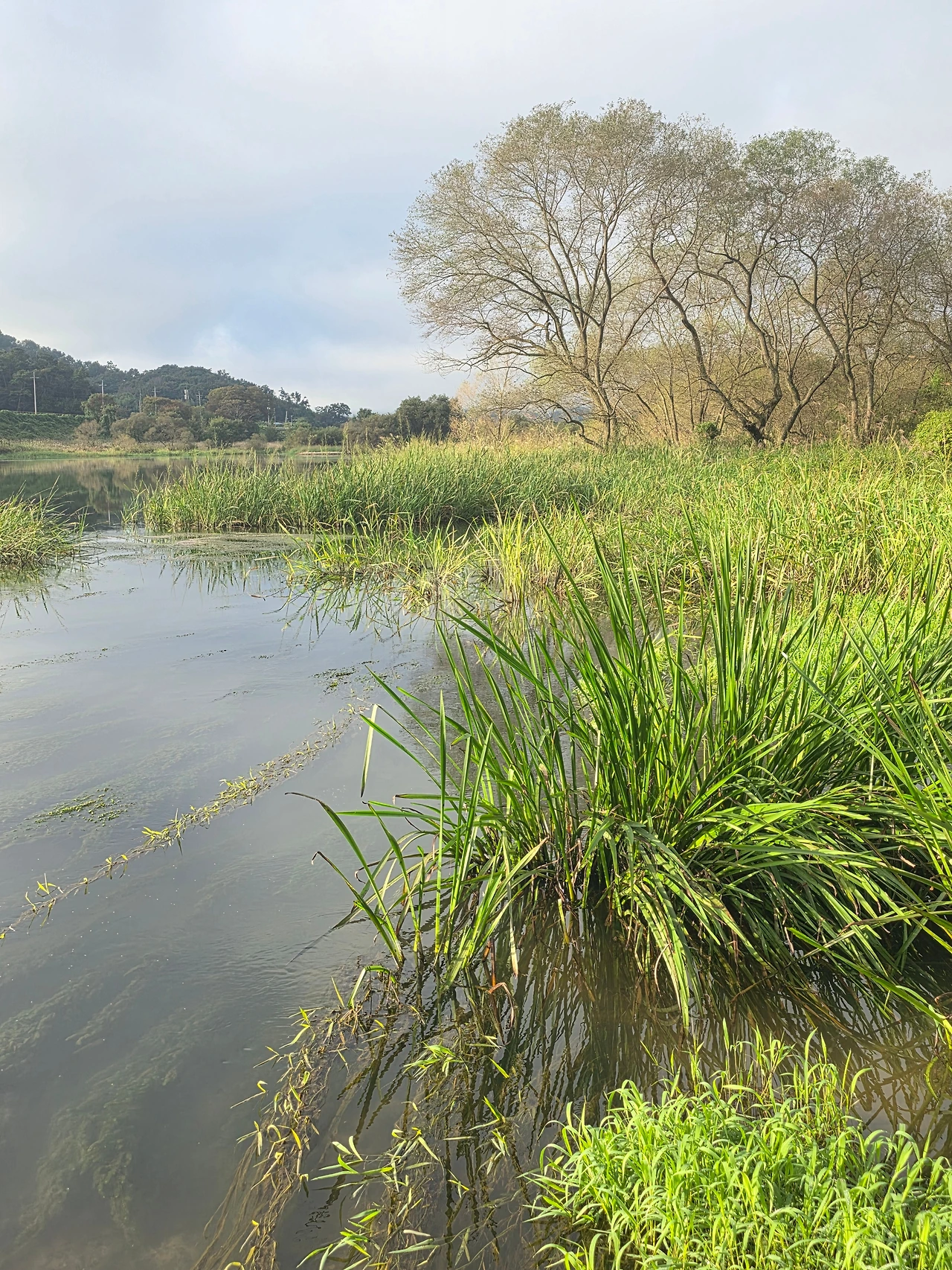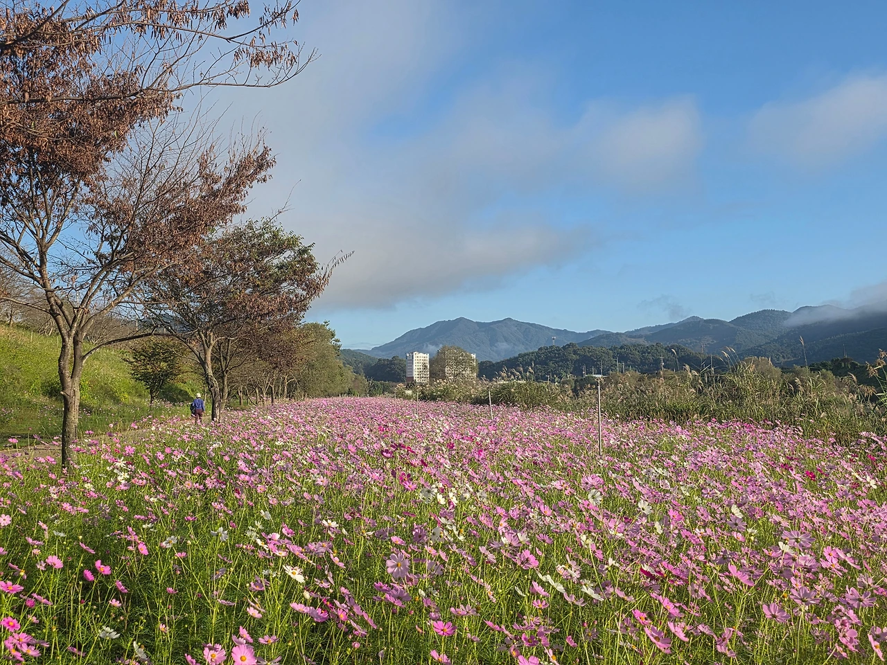 높은 산을 오르느라 많이 지친 상태라 말 그대로 슬로러닝을 했다. 살살 뛰니 그다지 힘이 들지는 않았다. 코스모스가 꽃이 반겨주는 강변길은 아름다웠다.