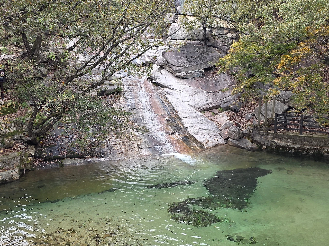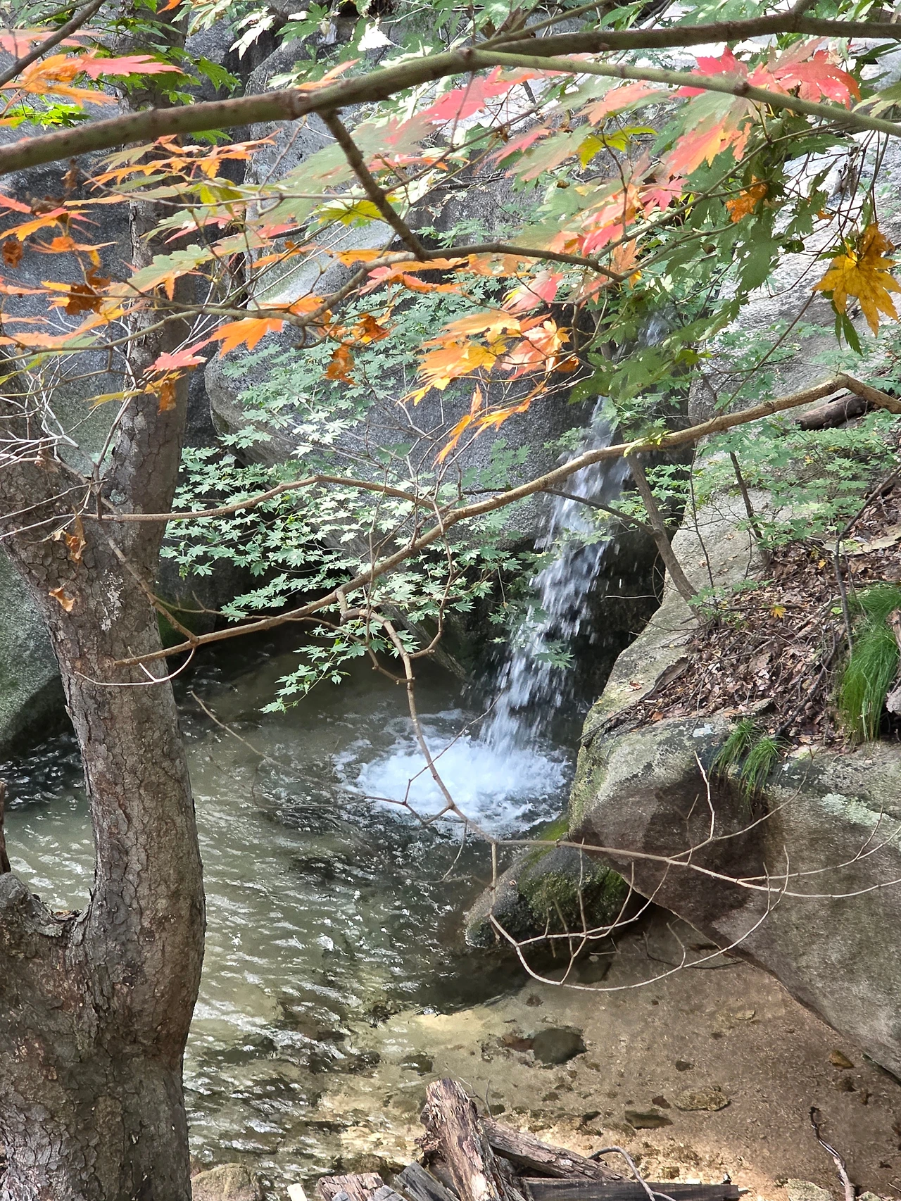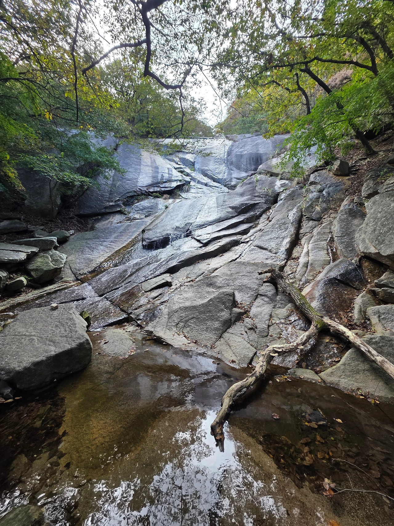 하산하는 길에 만난 계곡과 길은 고즈넉하고 정취가 가득했다. 특히 다듬은 긴 돌로 조성된 계단길은 우리의 마음을 사로잡았다. 경사가 급해서 위험한 길이라는 팻말이 있었지만 그 길을 택해서 내려올 만한 충분한 가치가 있는 길이었다. 계곡은 깊었고 계곡이 깎아지른 바위를 흘러내린 물은 비단결 같다. 하산 길에는 이런 폭포들이 이어진다.