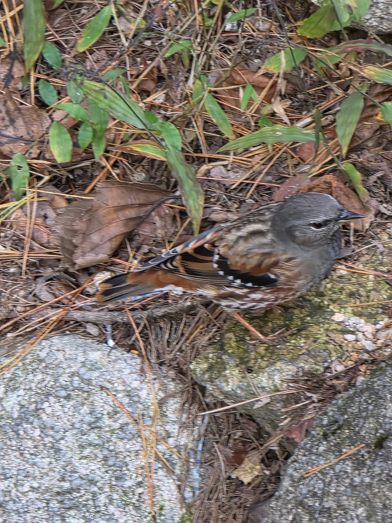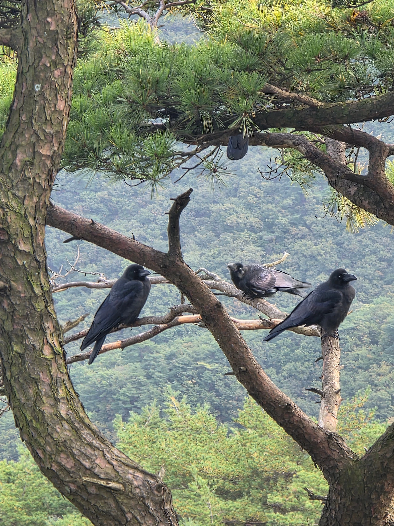 정상에 올라 발아래를 내려다보며 마시는 커피 한 잔은 산을 오르는 또 다른 맛이다. 이곳 산마루에는 새들도 많다. 큰 까마귀를 위시하여 쇠박새, 멧새가 소나무 사이를 포르르 난다. 특히 멧새는 사람도 두려워하지 않고 열심히 먹이 사냥을 하는 모습이 너무 귀엽다.