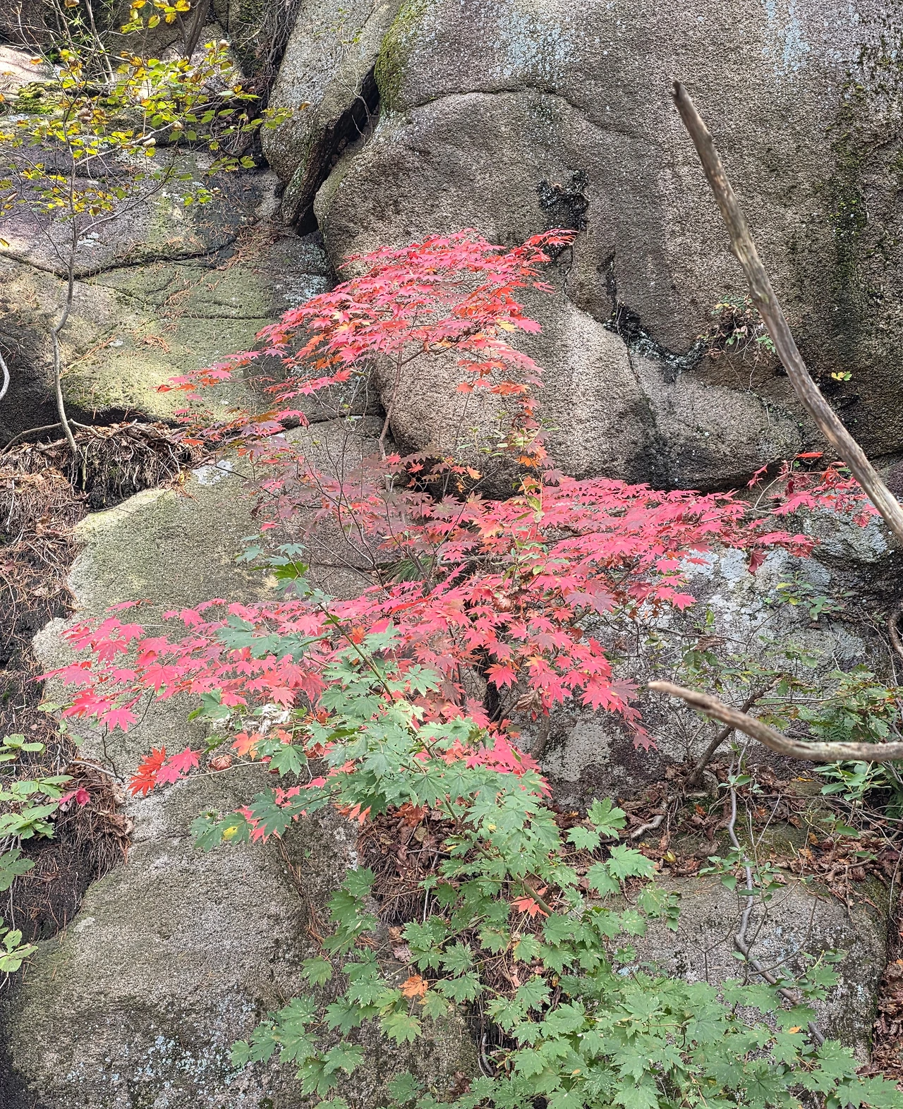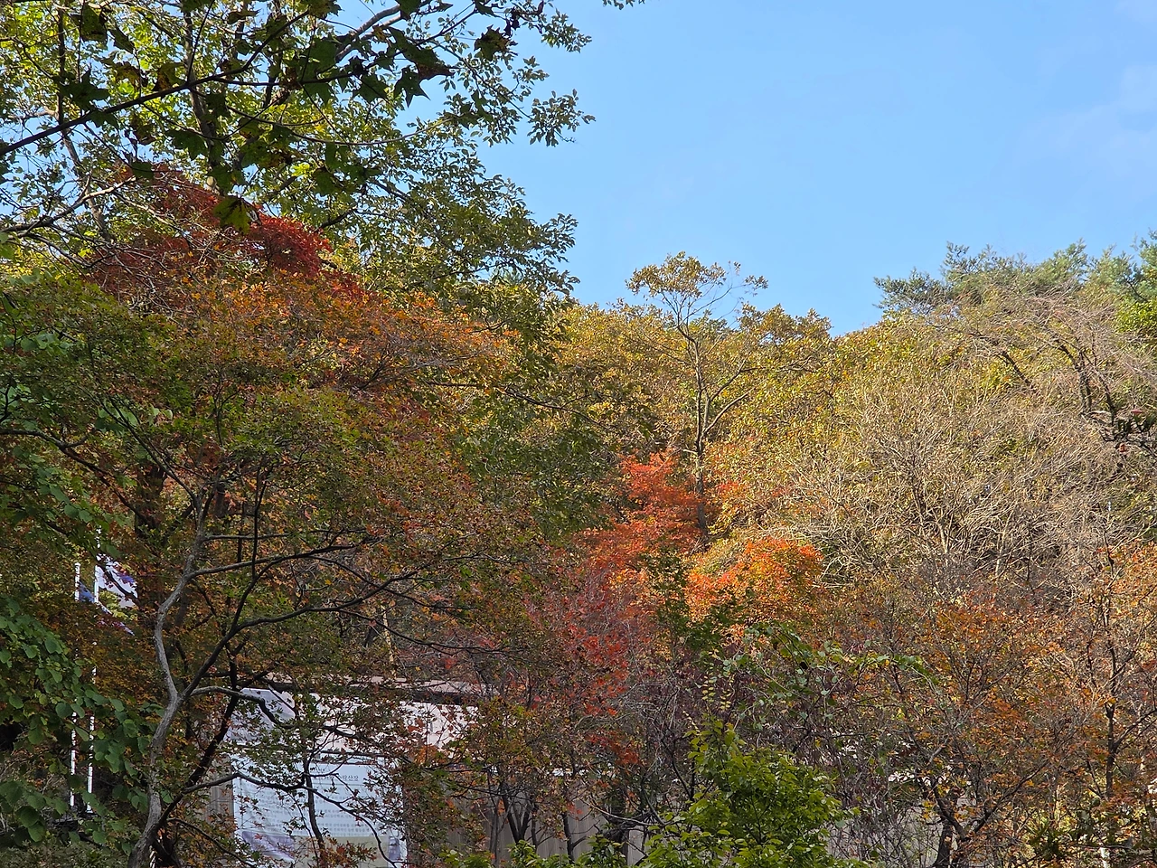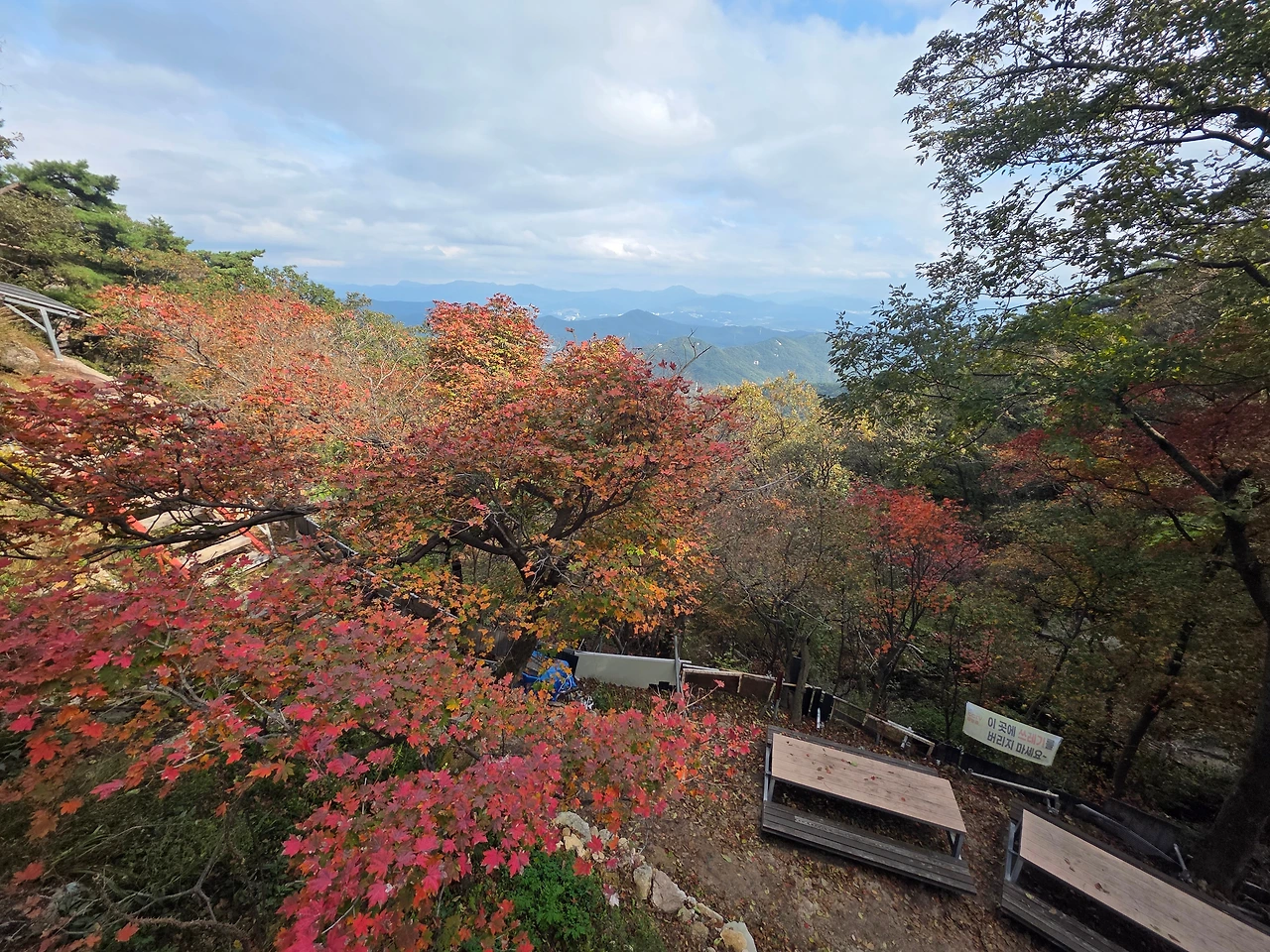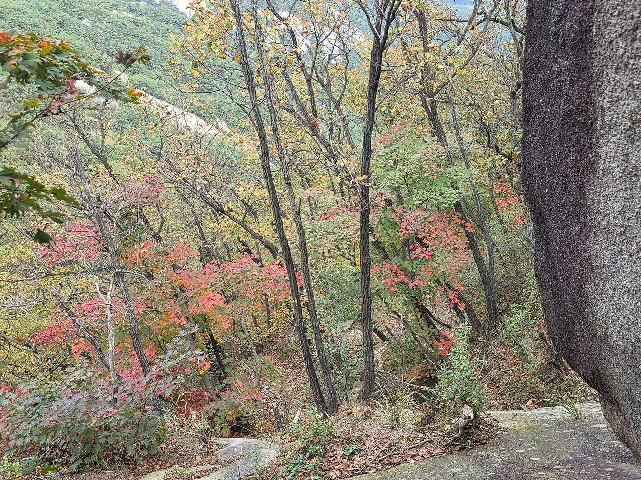 산 초입에는 나무들이 여전히 푸르지만 산정 주위에는 단풍이 진하게 들었다. 기대하지 않은 붉은 단풍을 만나니 반갑다. 가을을 입기 시작한 산의 자태가 꽃단장을 마친 새색시 같다.
