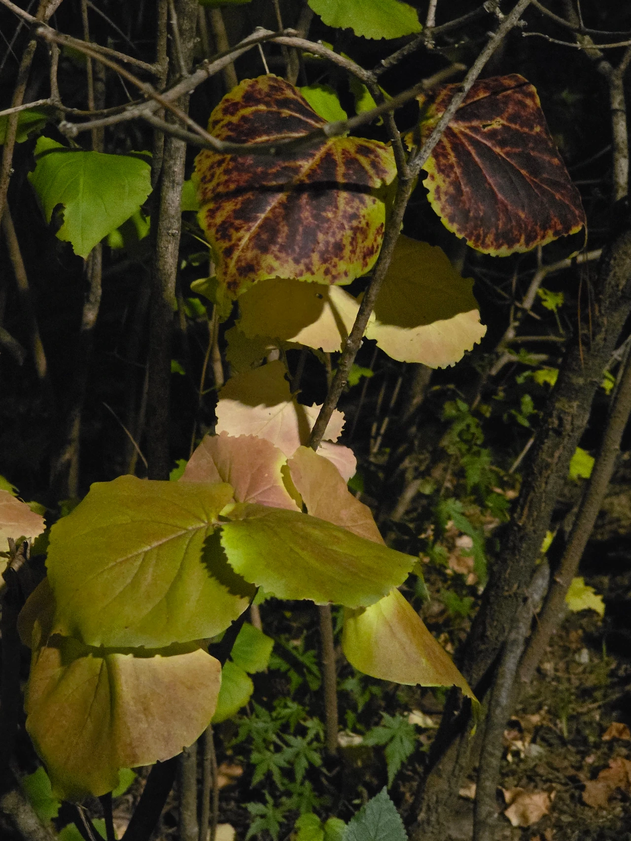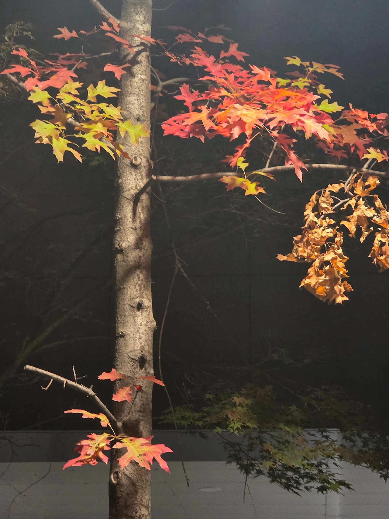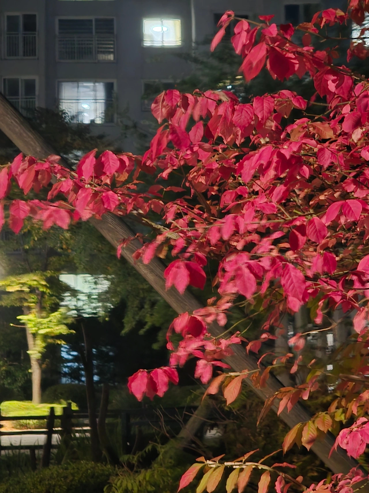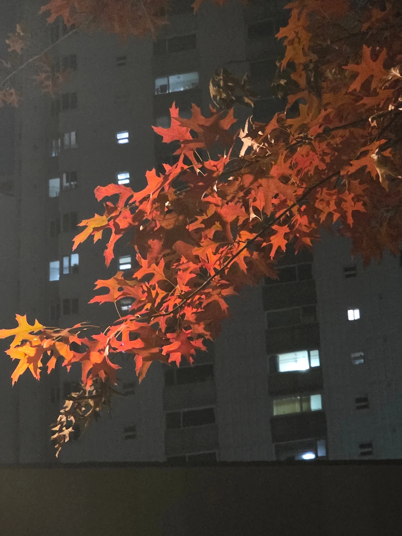 깊은 밤 가로등 불빛에 비친 대왕참나무의 단풍은 진홍빛깔이다. 고요한 밤 분위기에 붉게 물든 잎은 고혹적이다.
