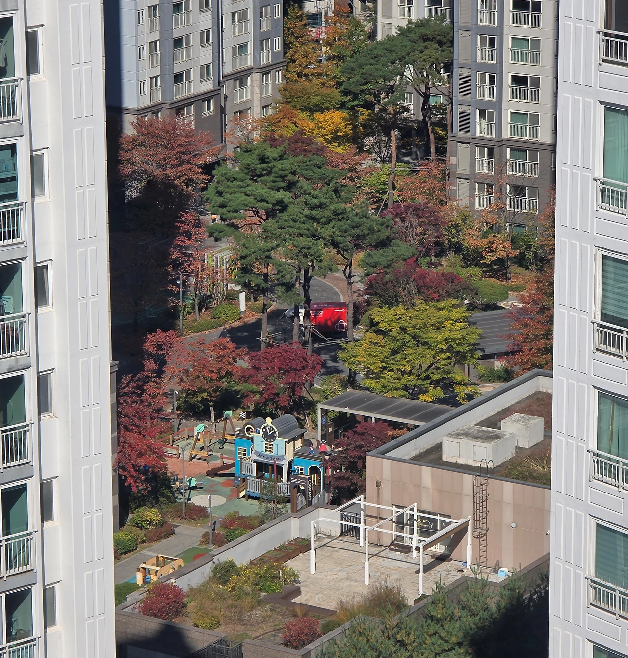 아파트 주변에도 대왕단풍나무가 절정이다. 붉은색부터 갈색까지 다채롭다. 고층에서 내려다보는 풍광도 길거리에서 만나는 경치도 멋지다. 의외로 진짜 단풍나무의 변신은 눈에 잘 띄지 않는다.
