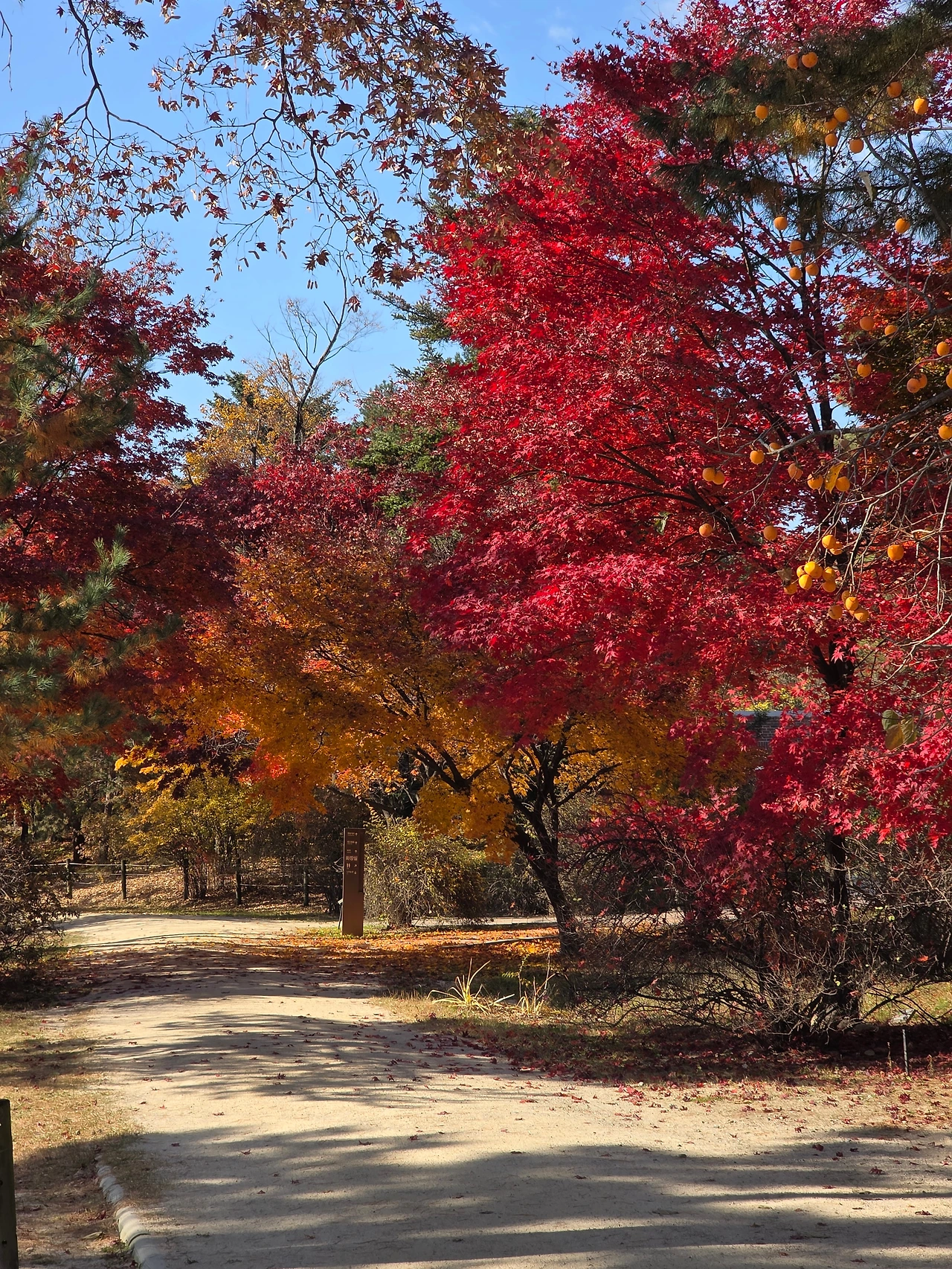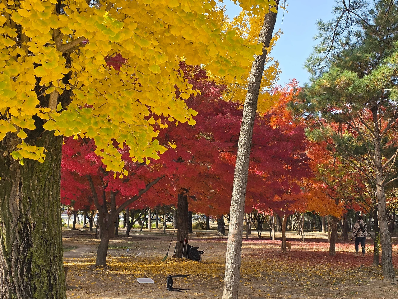 단풍나무도 제 몫을 단단히 해내고 있다. 선홍색과 주황색 그리고 여전히 푸른 잎들이 한데 어울려 원색의 향연을 펼치고 있다. 이미 잎을 떨군 단풍은 바닥에 붉은 물을 들였다. 눈을 두는 곳마다 단풍이 강렬하다. 진한 감성의 가을이 곳곳에 펼쳐졌다.
