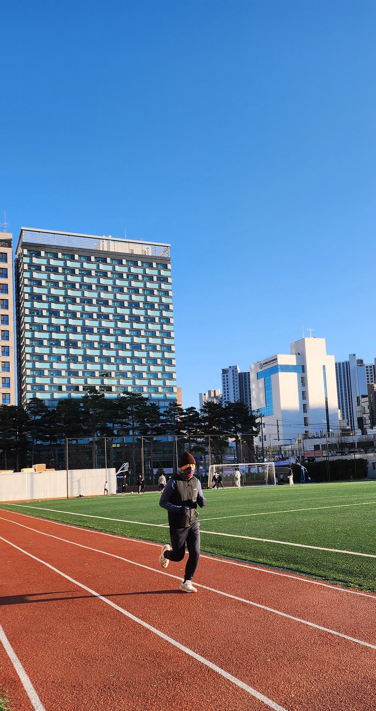 첫날이니 달리기를 하기로 한다. 당연히 아내도 함께다. 인근에 사는 마라톤 동호회 회원들에게도 뛰자고 톡을 날린다. 그렇게 외대운동장 달리기 번개모임이 성사되었다. 춥기는 하지만 햇살은 따스하고 날은 티 없이 맑아 달리기에 그만인 날씨다.