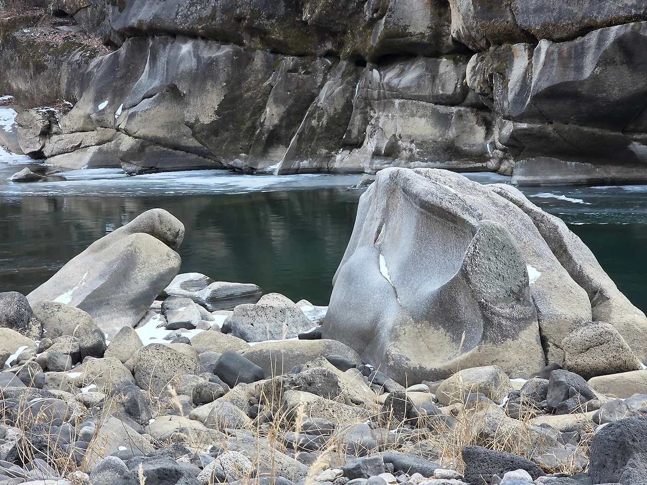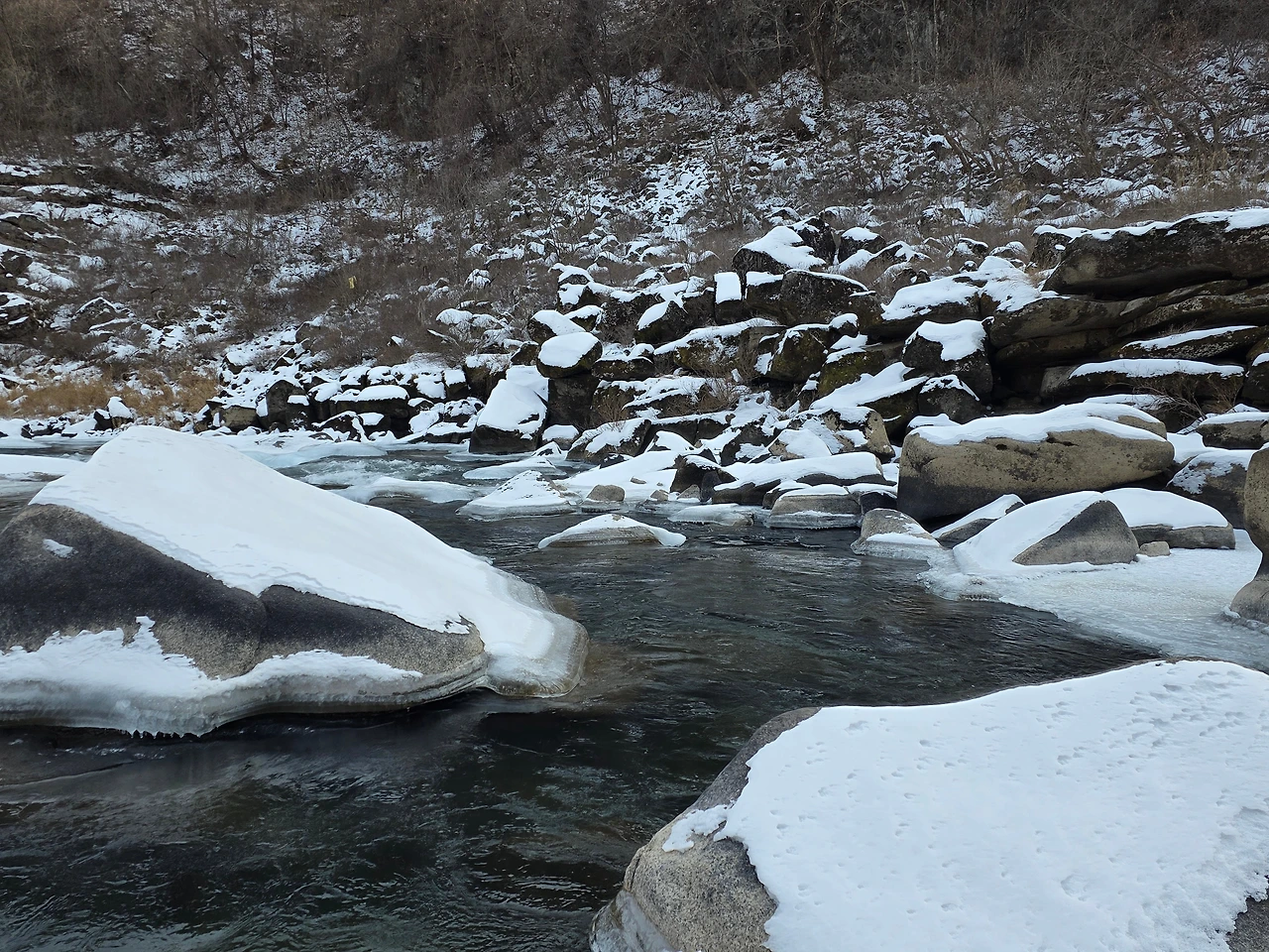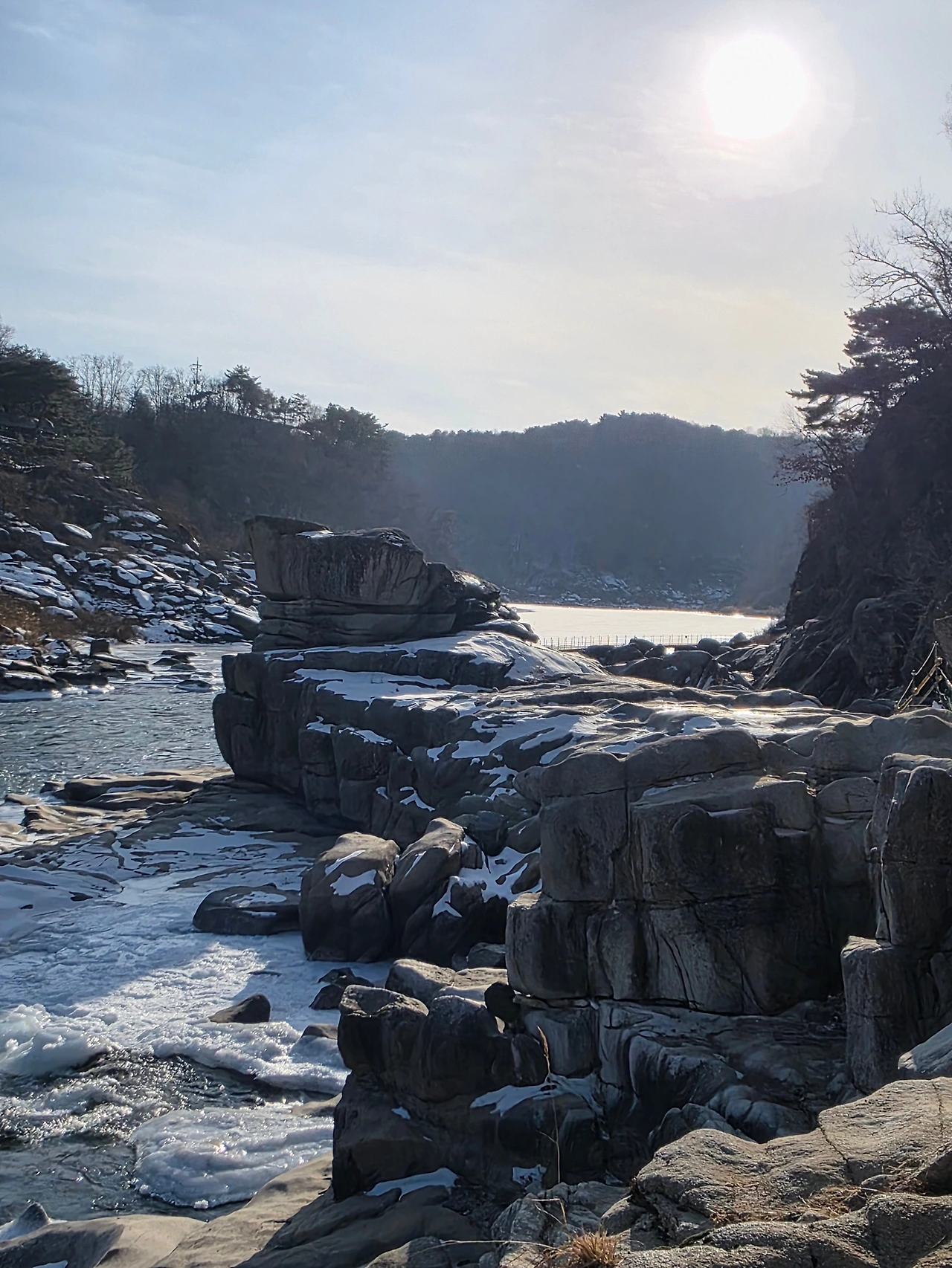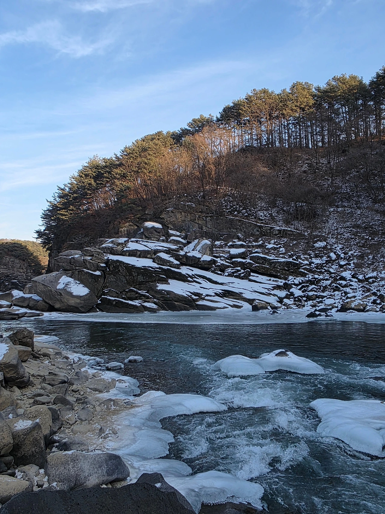 큰 바위들 사이로 세차게 흐르는 강물 소리가 상쾌하다. 수정 얼음 사이로 보이는 강물은 아주 맑다. 북유럽 사람들은 한겨울에 얼음을 깨고 냉수욕을 즐긴다는데, 이곳은 한 번쯤 따라 해보고 싶은 마음을 불러일으킨다. 막상 물에 들어가려면 비수같이 차가운 냉기에 심장마비가 올지도 모르지만....
