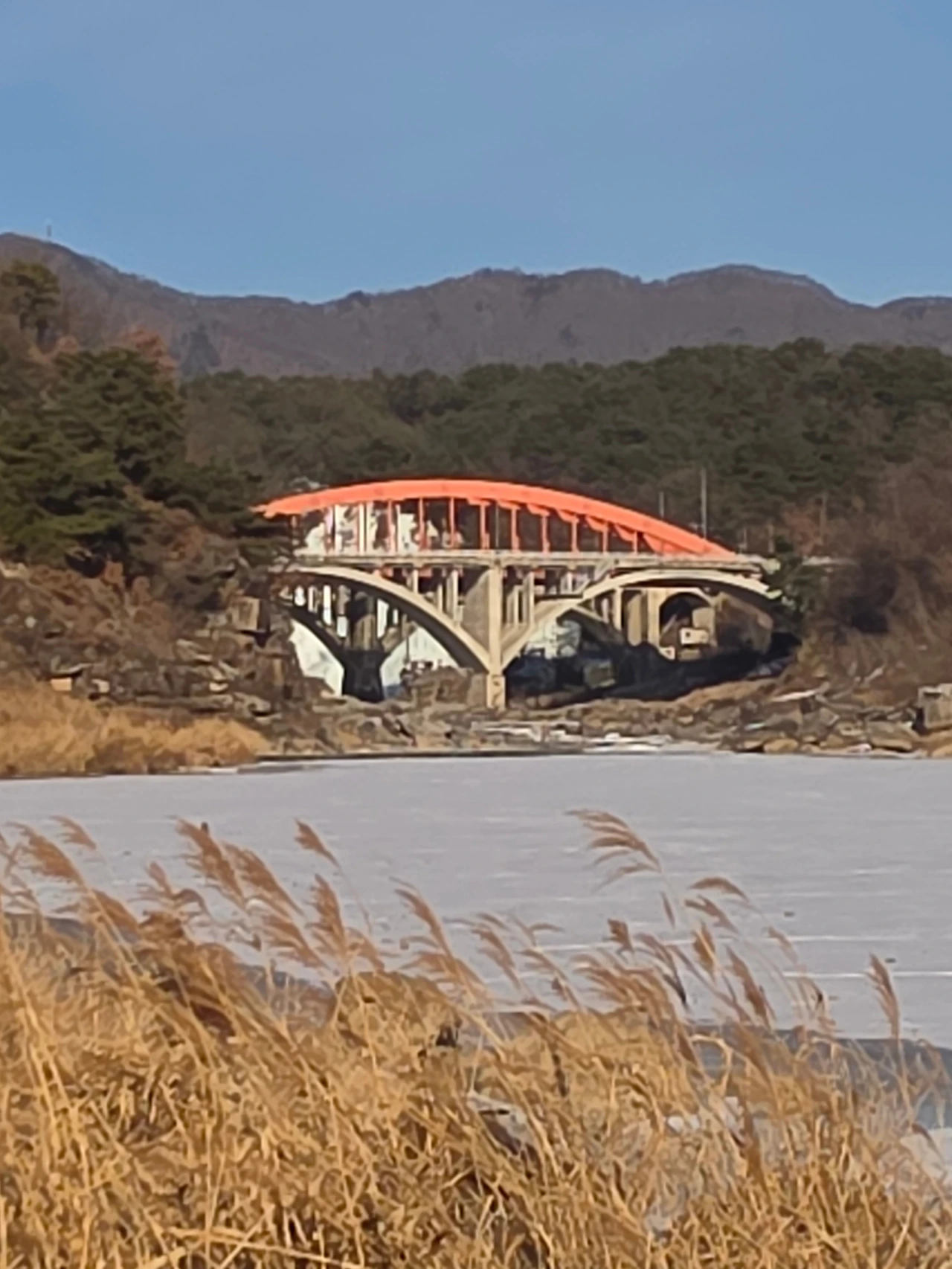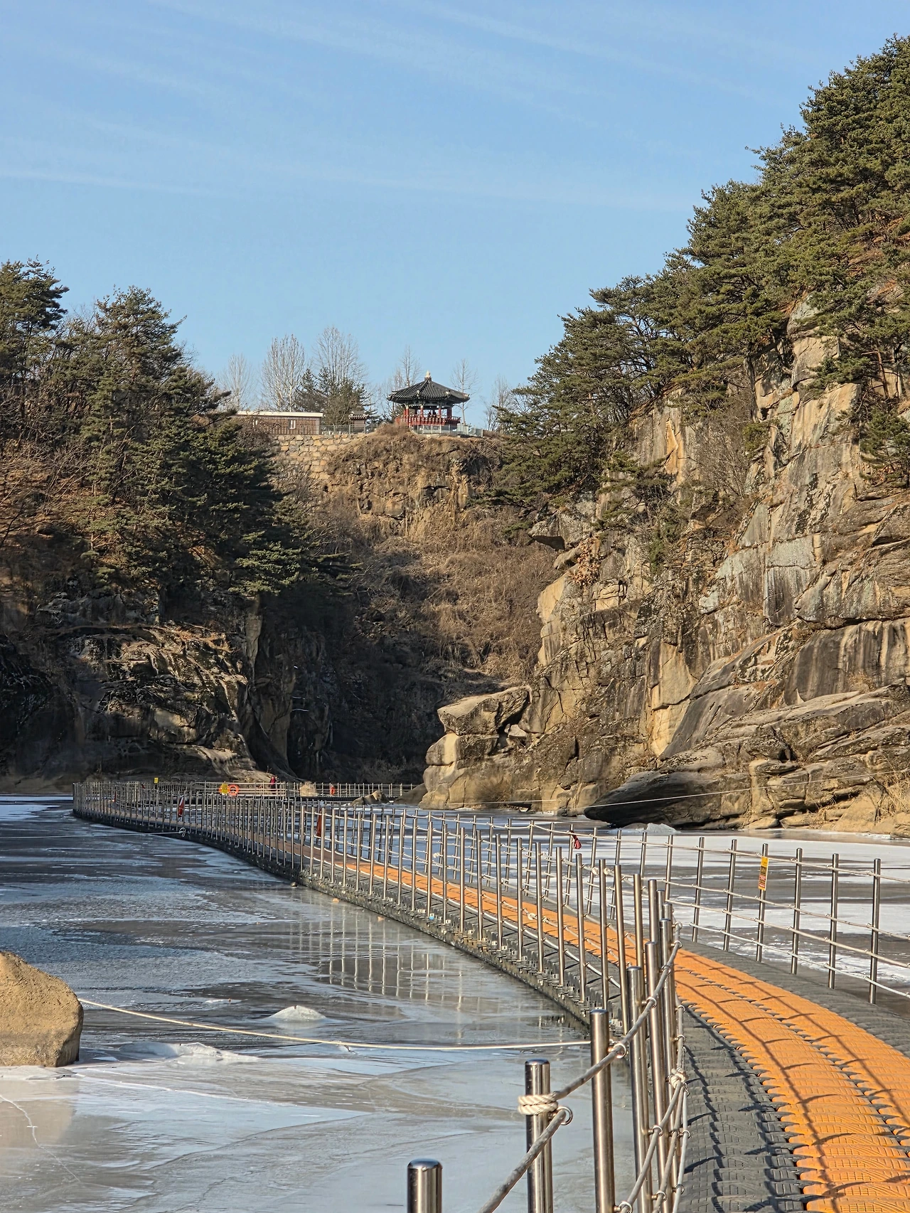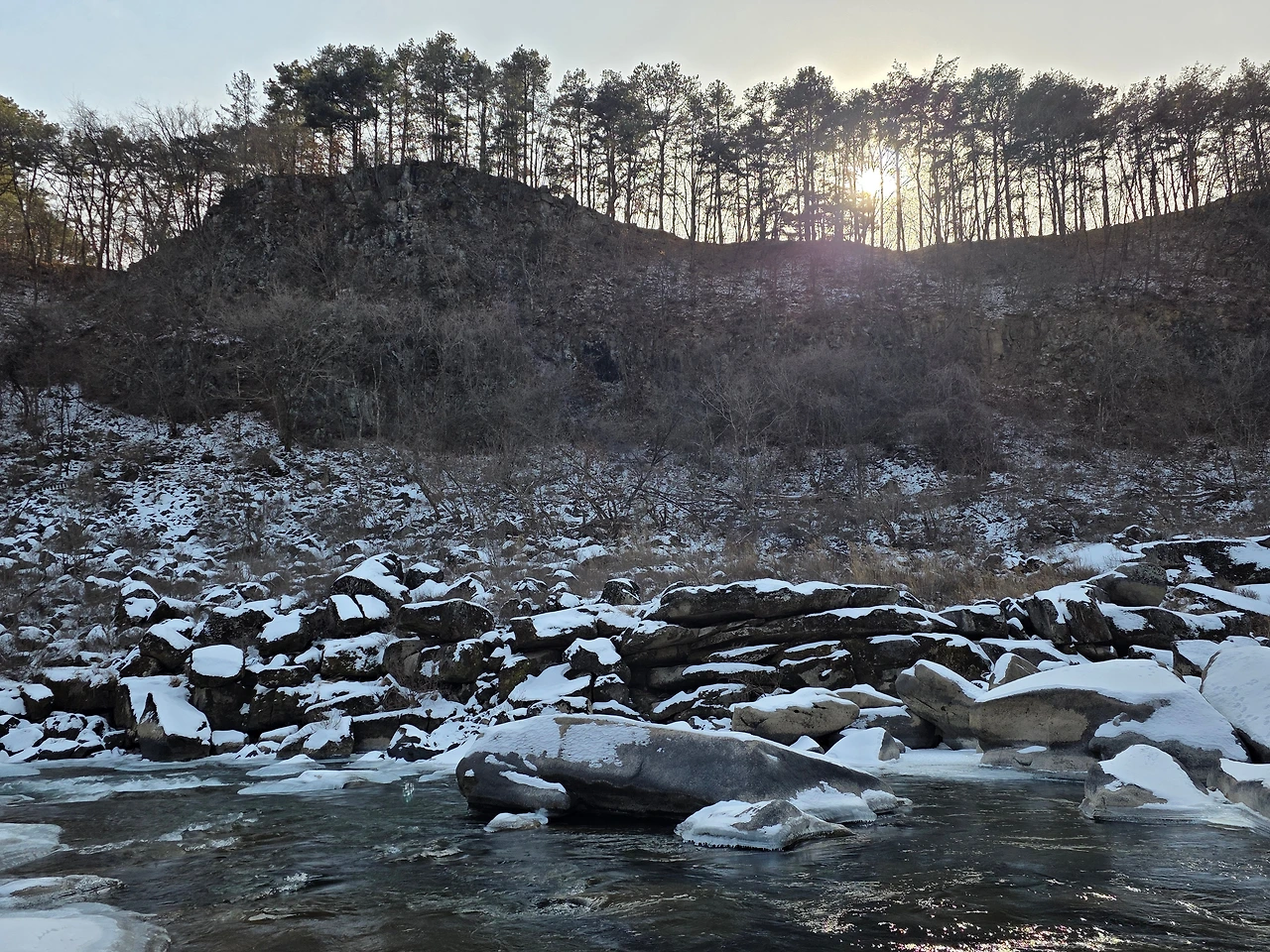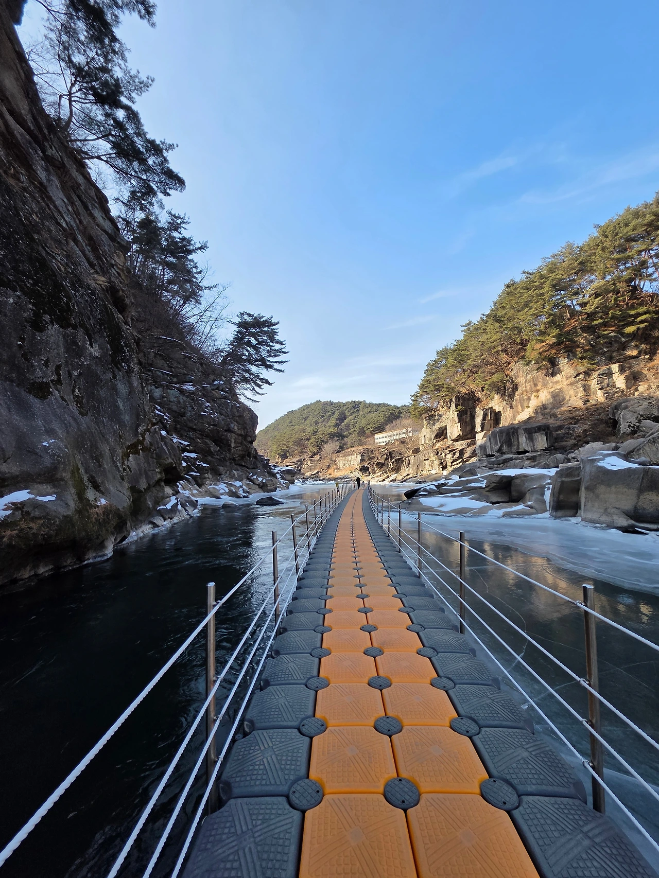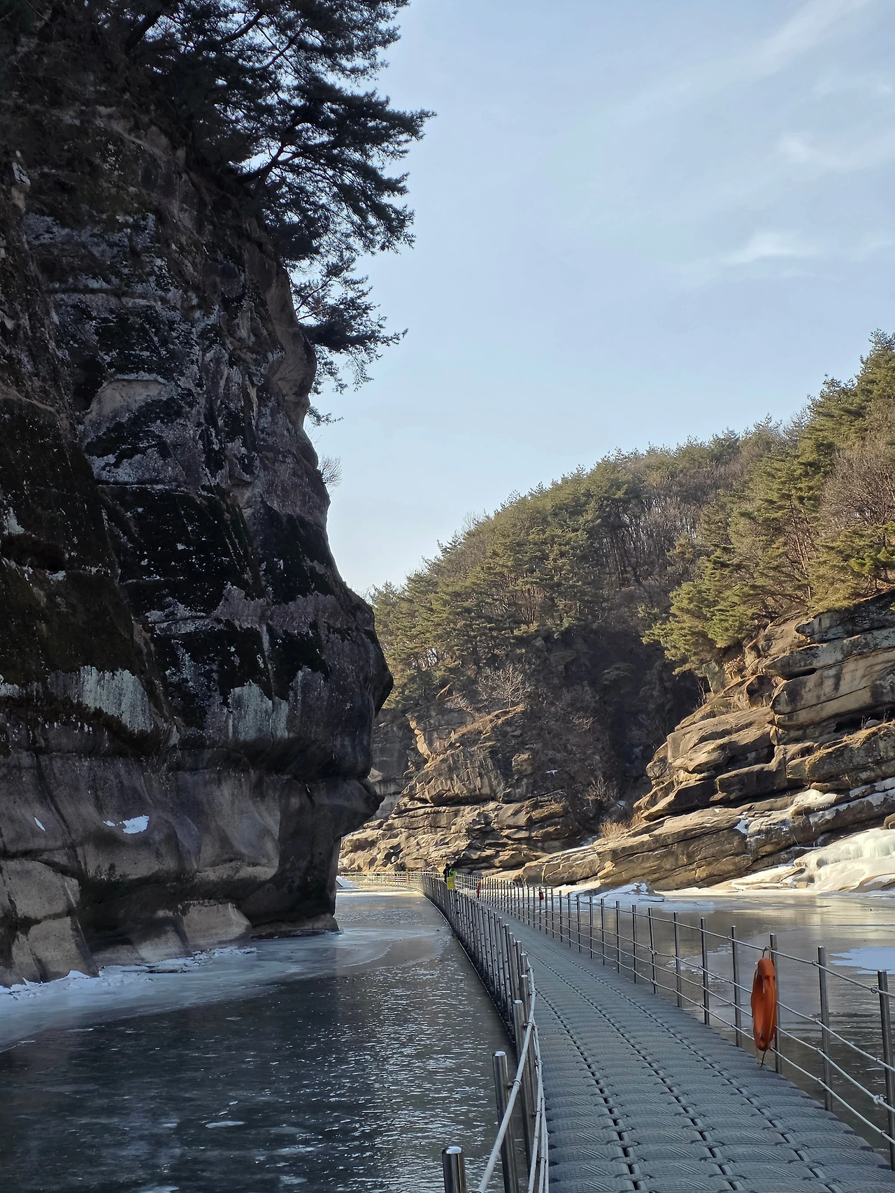 눈이 내렸다면 더 멋진 풍광을 만났겠지만 잔설이 여기저기 남은 경치도 충분히 볼만했다. 강물 위로 부교가 놓였다. 깔린 블록이 볼록해서 주의해서 걷게 된다. 등산화를 신어서 발자국 소리가 쿵쿵 울린다. 대부분 강물이 얼었지만 녹은 곳은 걸을 때마다 출렁거린다. 처음 경험해 보는 신기함에 마음도 들뜬다. 날은 춥지만 바람이 세지 않아 괜찮은 것 같은데 장갑을 벗으면 손이 엄청 시리다.
