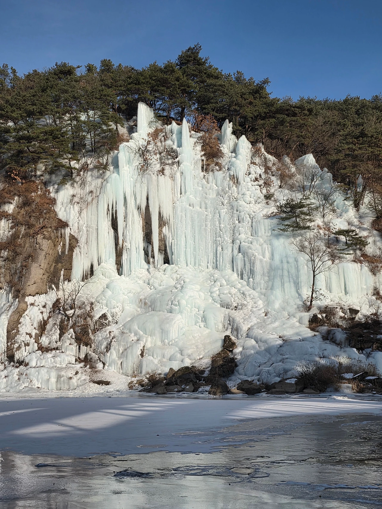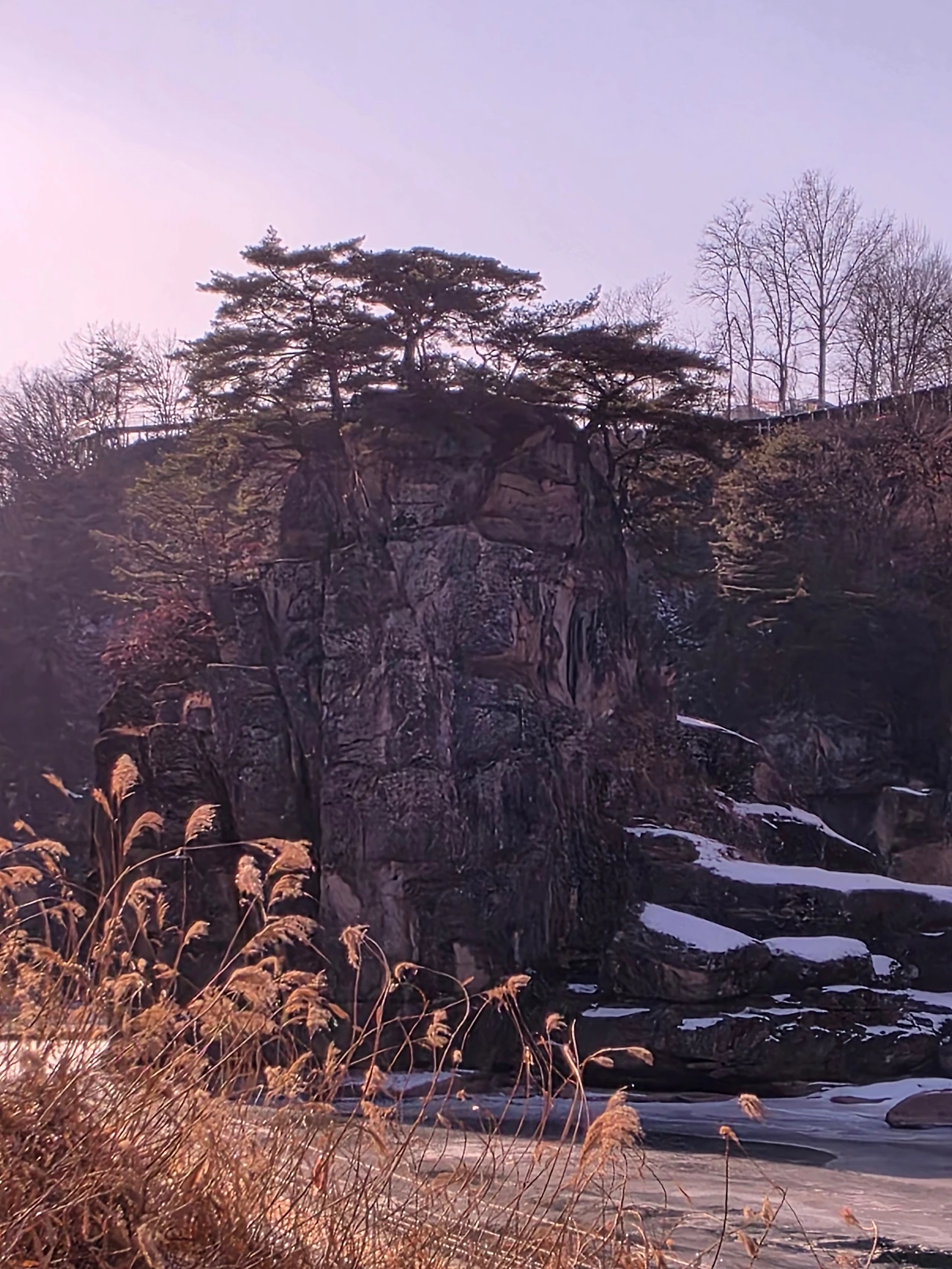 한탄강의 시그니처인 고석정은 한여름의 눈부신 자태가 아니다. 주변 풍경에 녹아들어 자연스러운 모습이다. 이곳에서 가장 눈길을 끄는 것은 빙벽이고 고드름이다. 마치 은발을 드리우듯 절벽에 고드름이 달렸다. 트레킹 끝자락에 온통 얼음으로 뒤덮인 소나무 숲은 인공으로 조성한 것 같은데 또 하나의 볼거리다. 한겨울을 실감하게 만드는 눈과 얼음의 세상 풍경이다.
