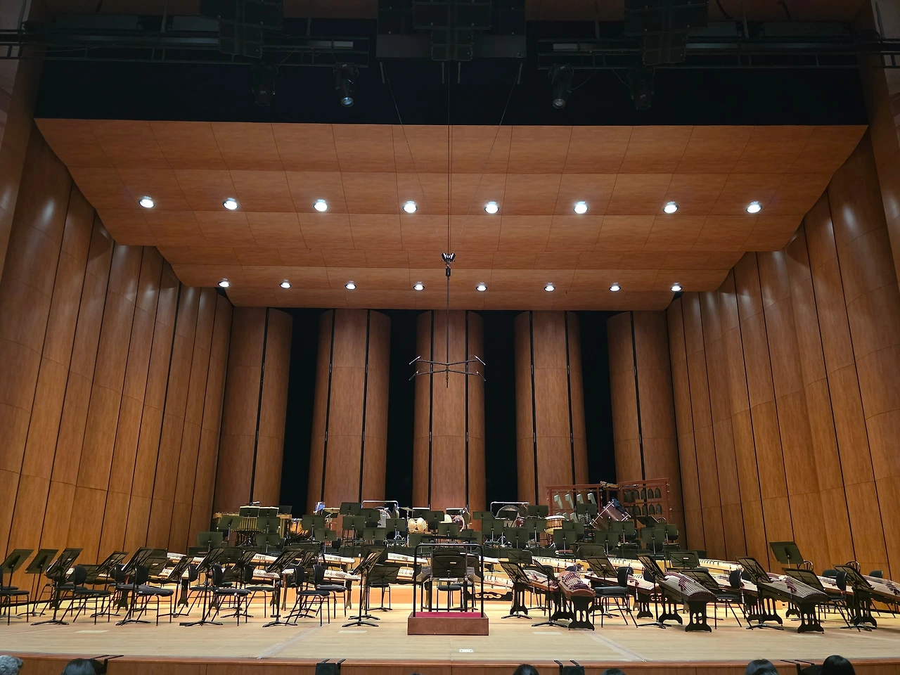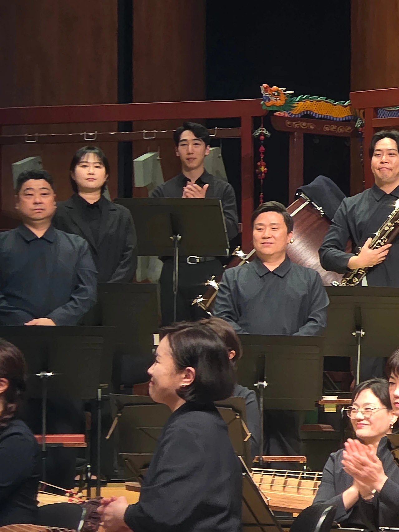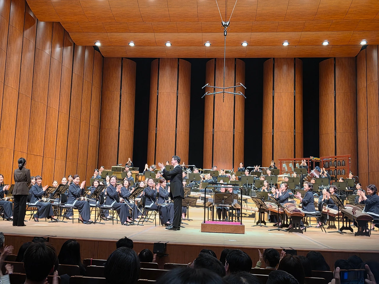 연주회가 시작되자 50명이 넘는 연주자들이 차례로 나와 자리를 잡았다. 서양 클래식 관현악단 유사한 형태다. 해금과 아쟁이 앞자리를 차지하고 가야금, 거문고, 대금, 소금 뒤로 타악기들이 자리 잡았다. 편경과 편종도 보인다. 특이한 것은 서양 악기도 일부 편성되었다는 점이다.