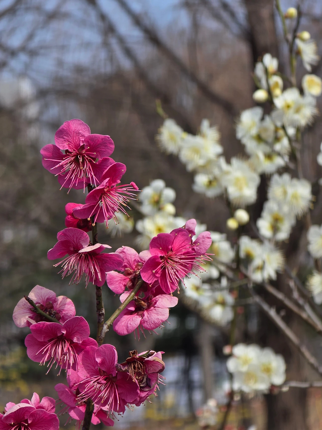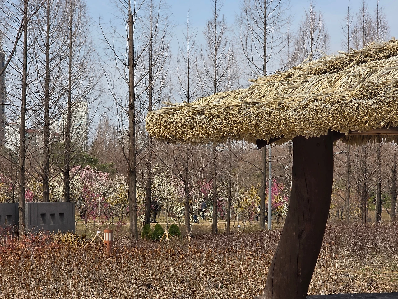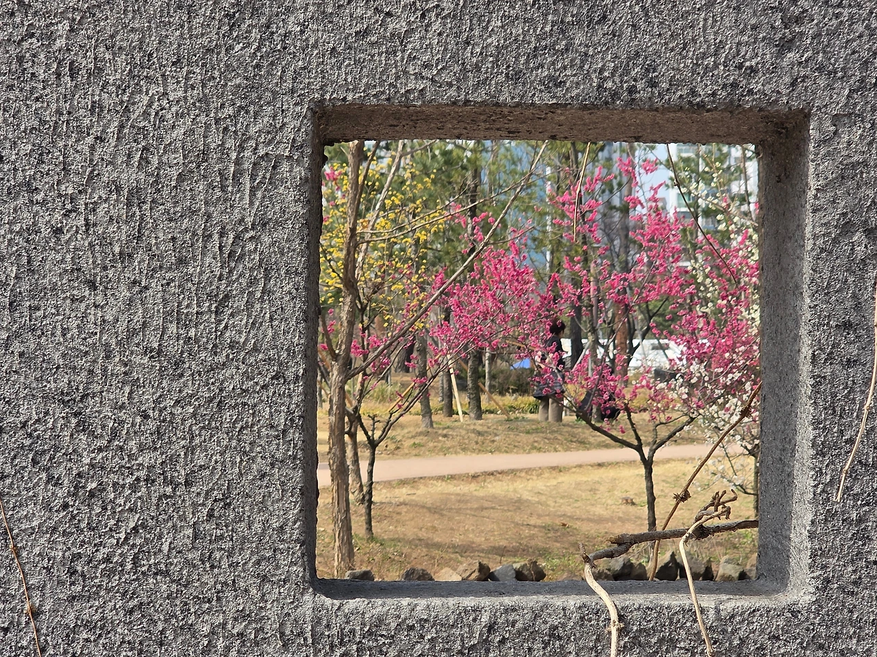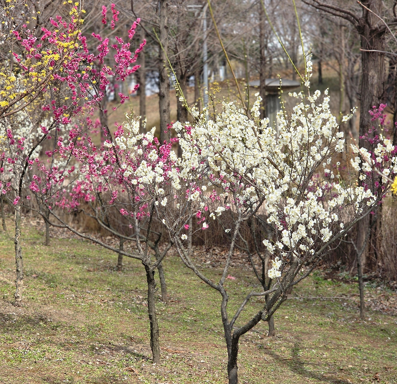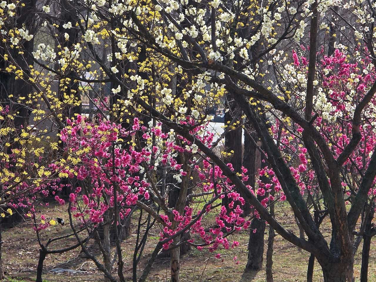 공원 입구에 들어서자마자 꽃들이 우리를 반긴다. 주변은 여전히 스산한 겨울 자취가 남았는데 이곳은 봄의 절정이다. 단지 매화와 산수유일 뿐인데도 홍매와 연분홍 매화가 어우러져 화려한 색채를 유감없이 발휘해서 사람들의 시선과 발길을 붙잡고 있다.