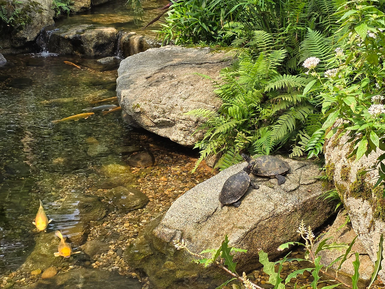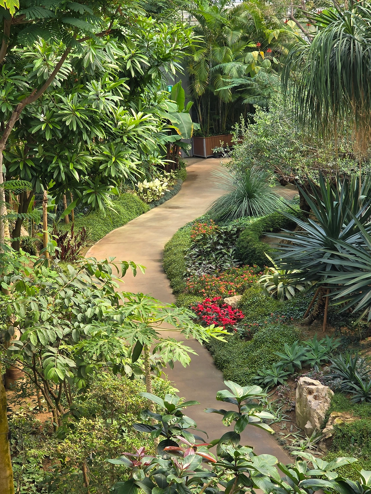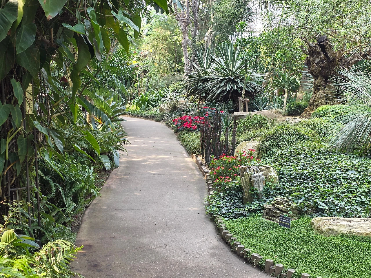 작은 폭포가 있는 연못도 있다. 연못에는 황금빛 비단잉어들이 노닐고 물가 바위 위에는 남생이들이 쉬고 있다. 곡선으로 보행로를 만들어 오솔길처럼 운치가 있다. 독특하고 장대한 열대식물들이 빼곡하게 자라고 있어 볼거리가 넘친다.