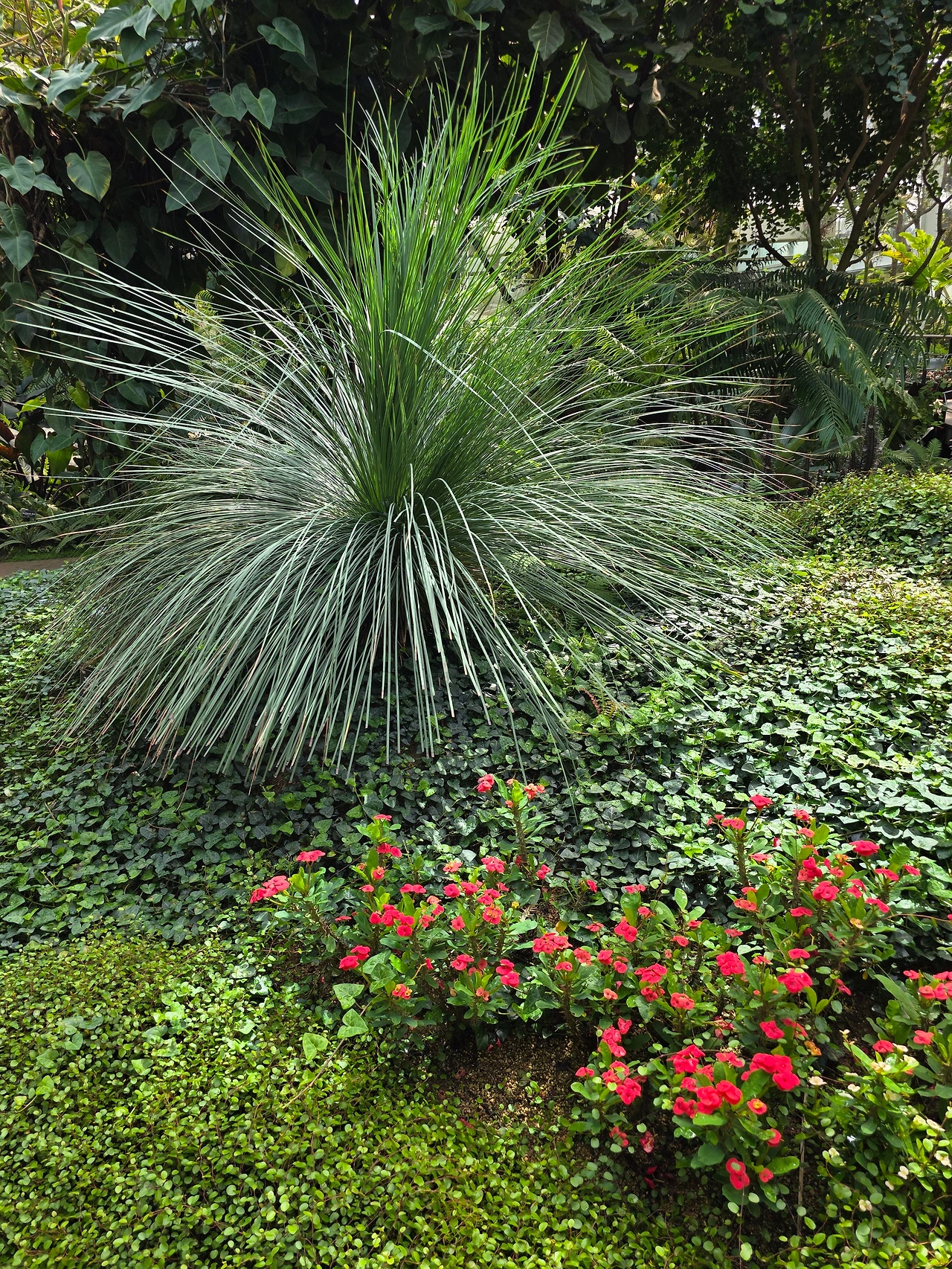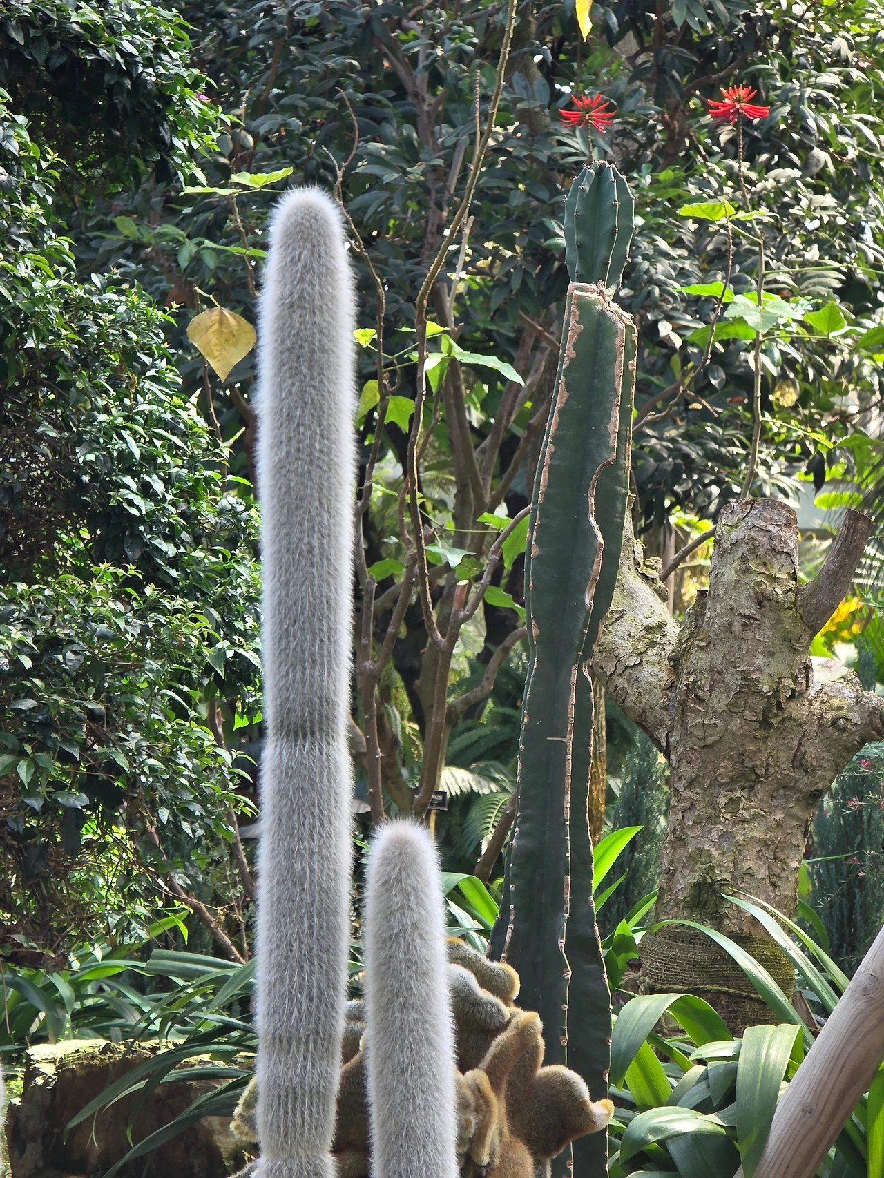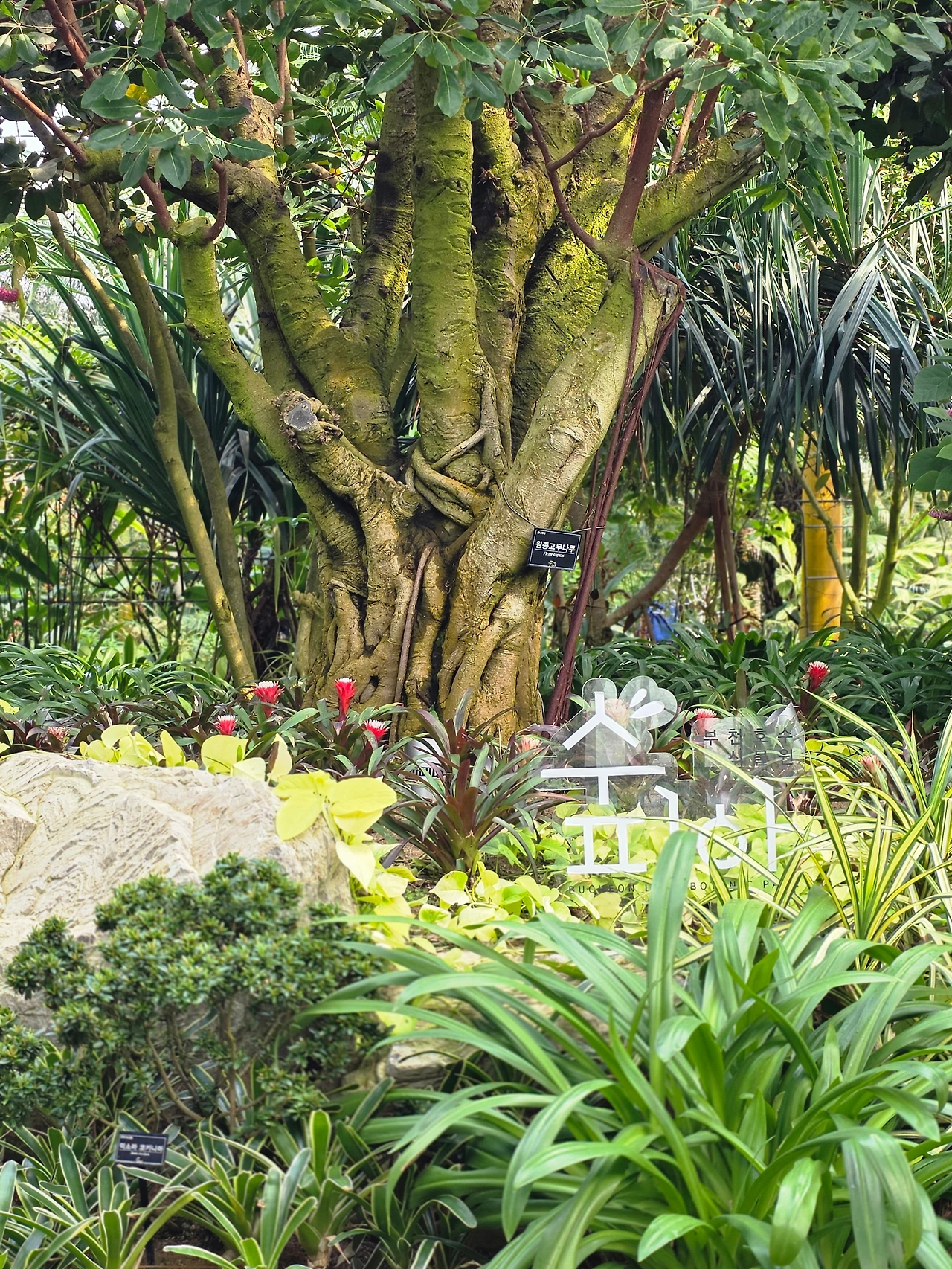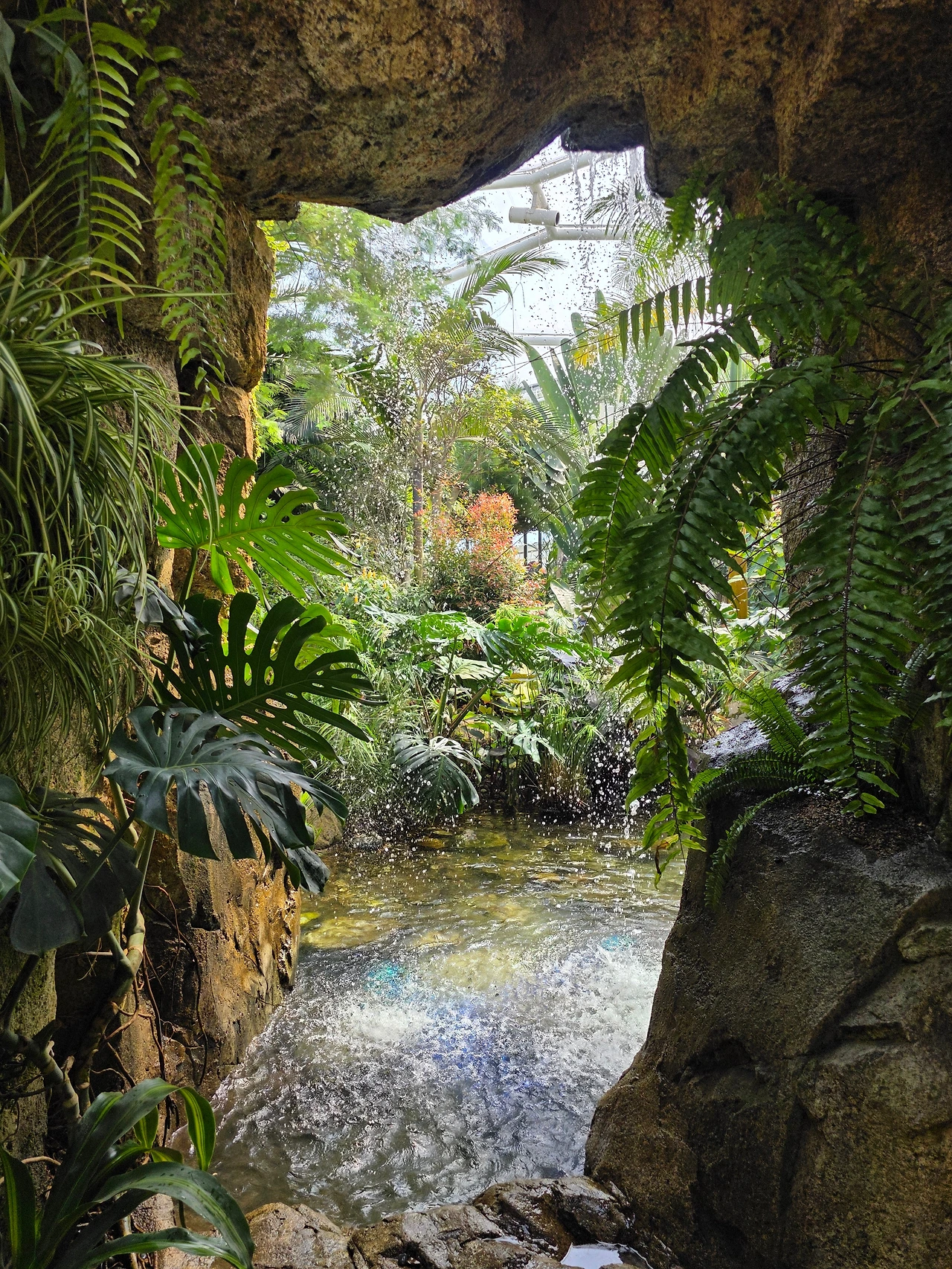 작은 폭포가 있는 연못도 있다. 연못에는 황금빛 비단잉어들이 노닐고 물가 바위 위에는 남생이들이 쉬고 있다. 곡선으로 보행로를 만들어 오솔길처럼 운치가 있다. 독특하고 장대한 열대식물들이 빼곡하게 자라고 있어 볼거리가 넘친다.