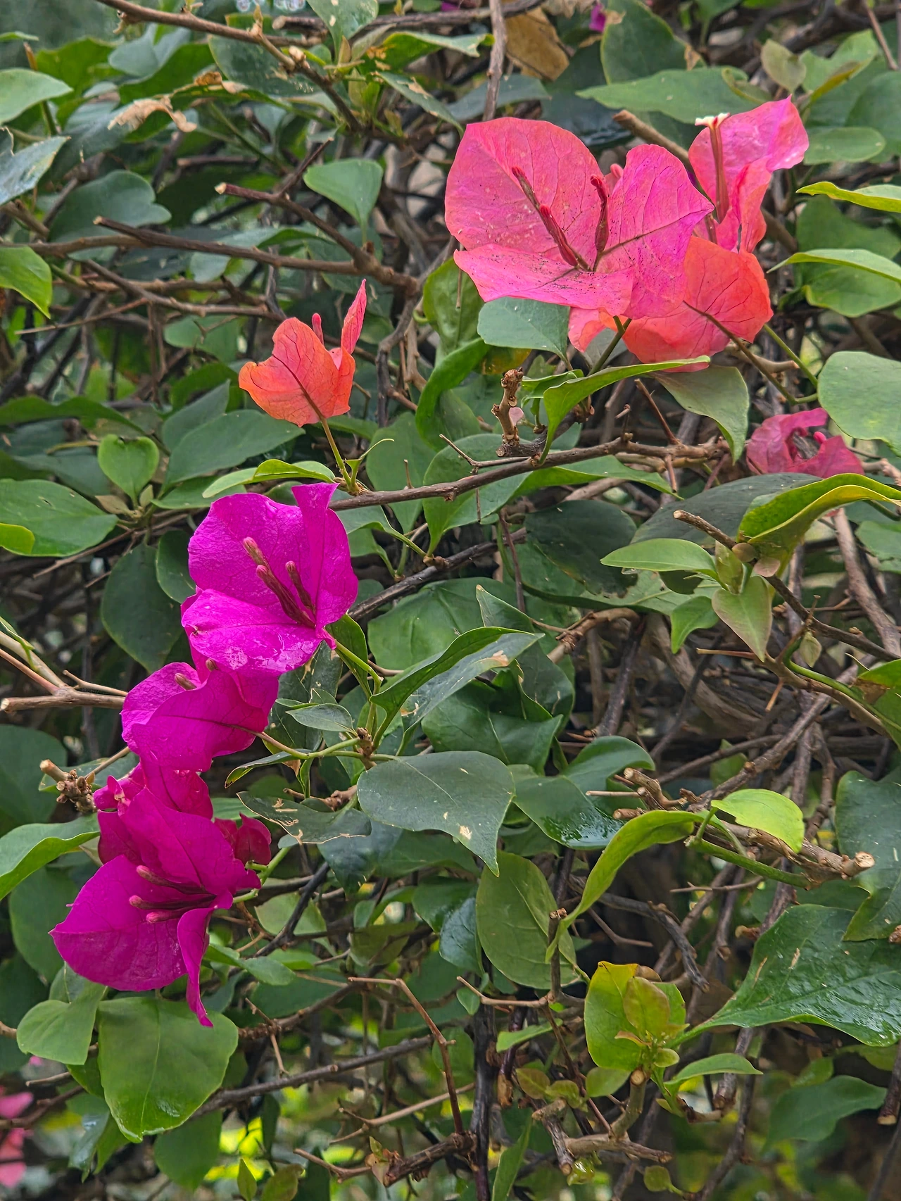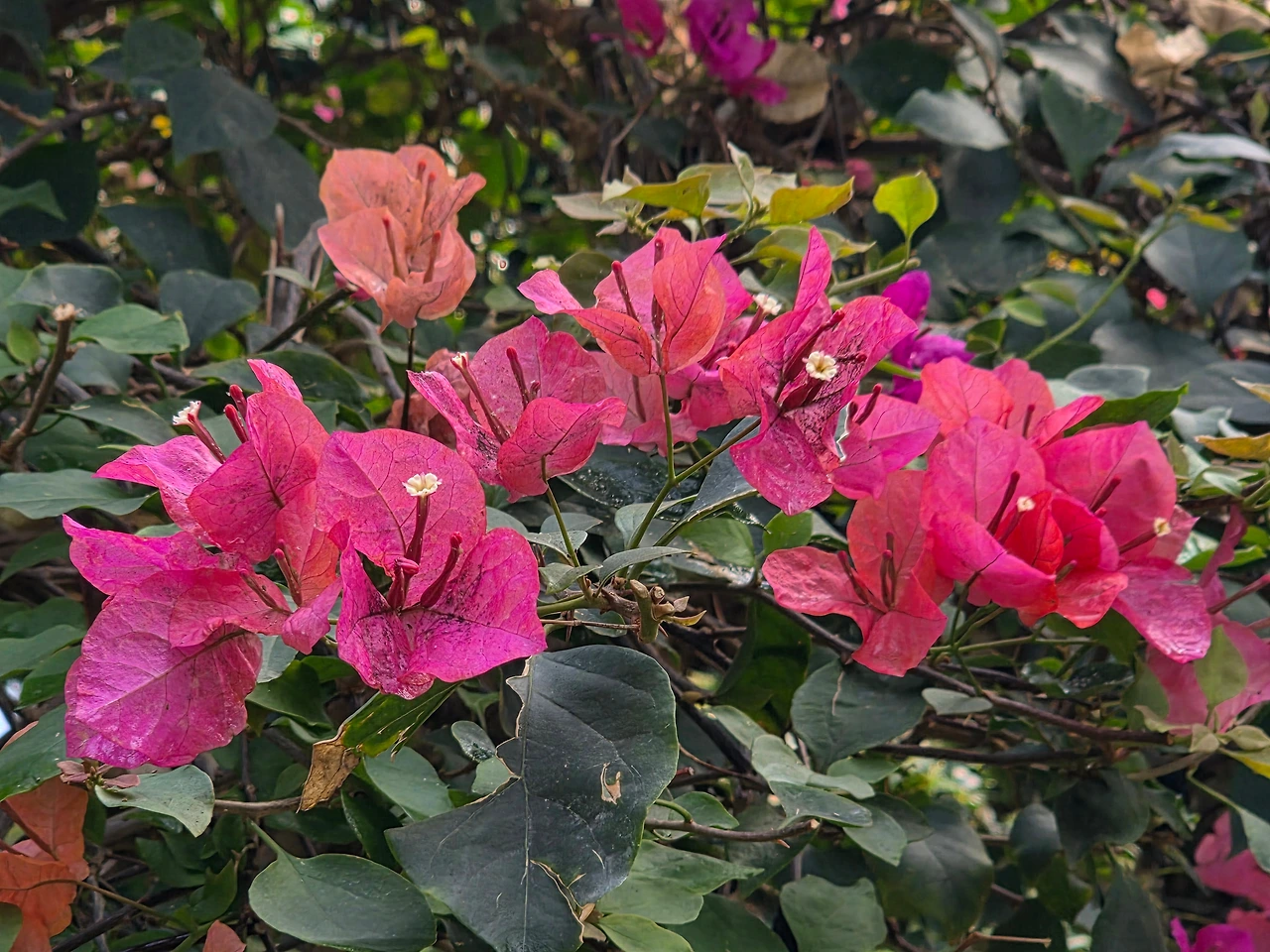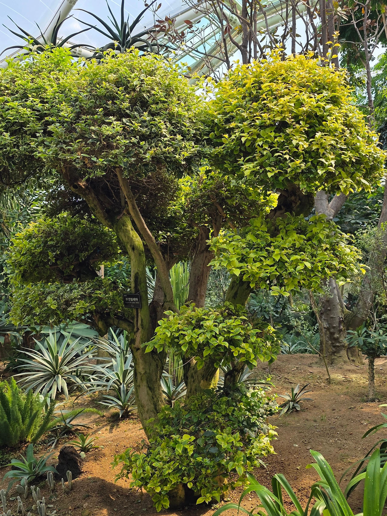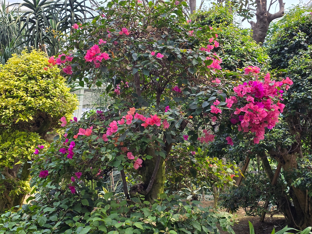 놀라운 것은 덩굴식물인 부겐빌레아가 일반 고목처럼 자랐다. 타고난 기질이라도 관리여하에 따라 달라질 수 있음을 보게 되어 신선한 느낌이다. 같은 나무 같은데도 색깔이 다르게 핀 부겐빌레아 꽃이 흥미롭다.