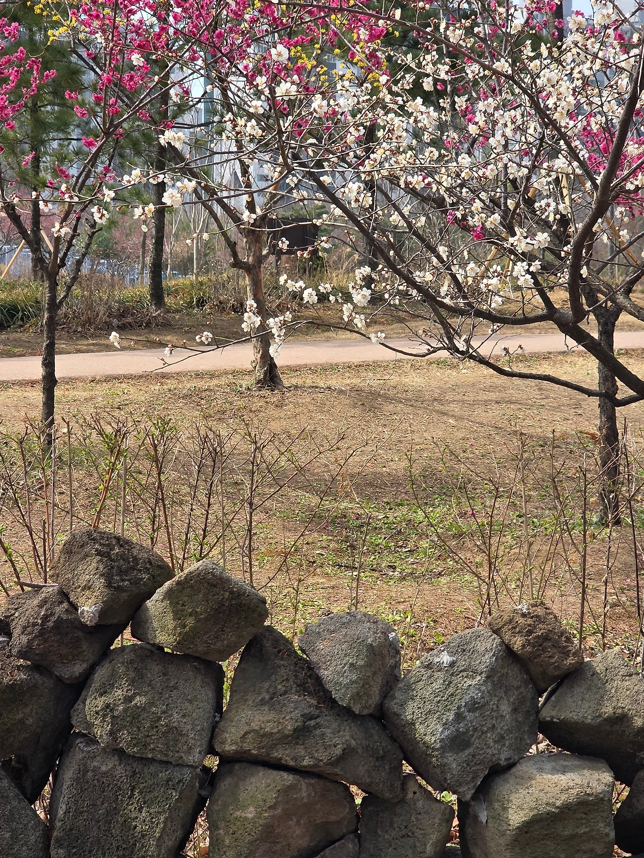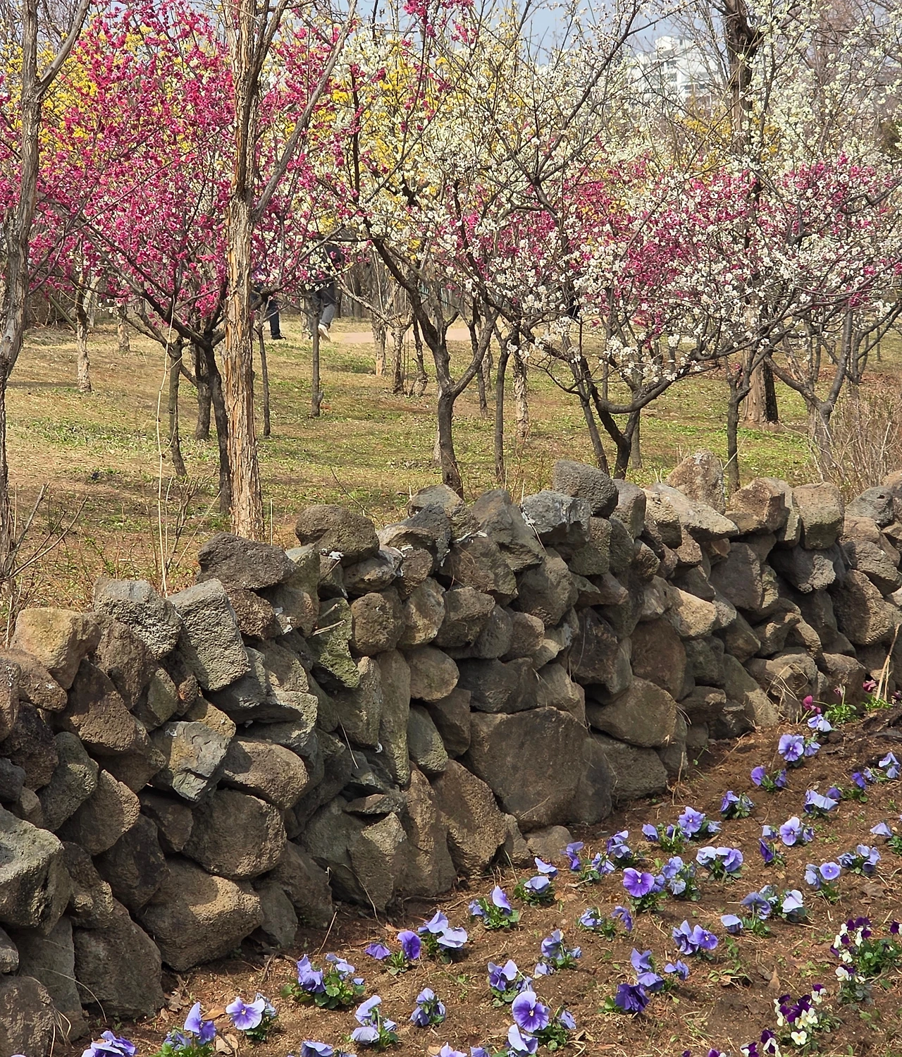 돌담이 정겹다. 투박하게 얼기설기 쌓은 돌무더기가 이웃한 꽃나무들과 잘 어울린다. 봄을 맞은 한가한 시골길을 걷는 기분이다.