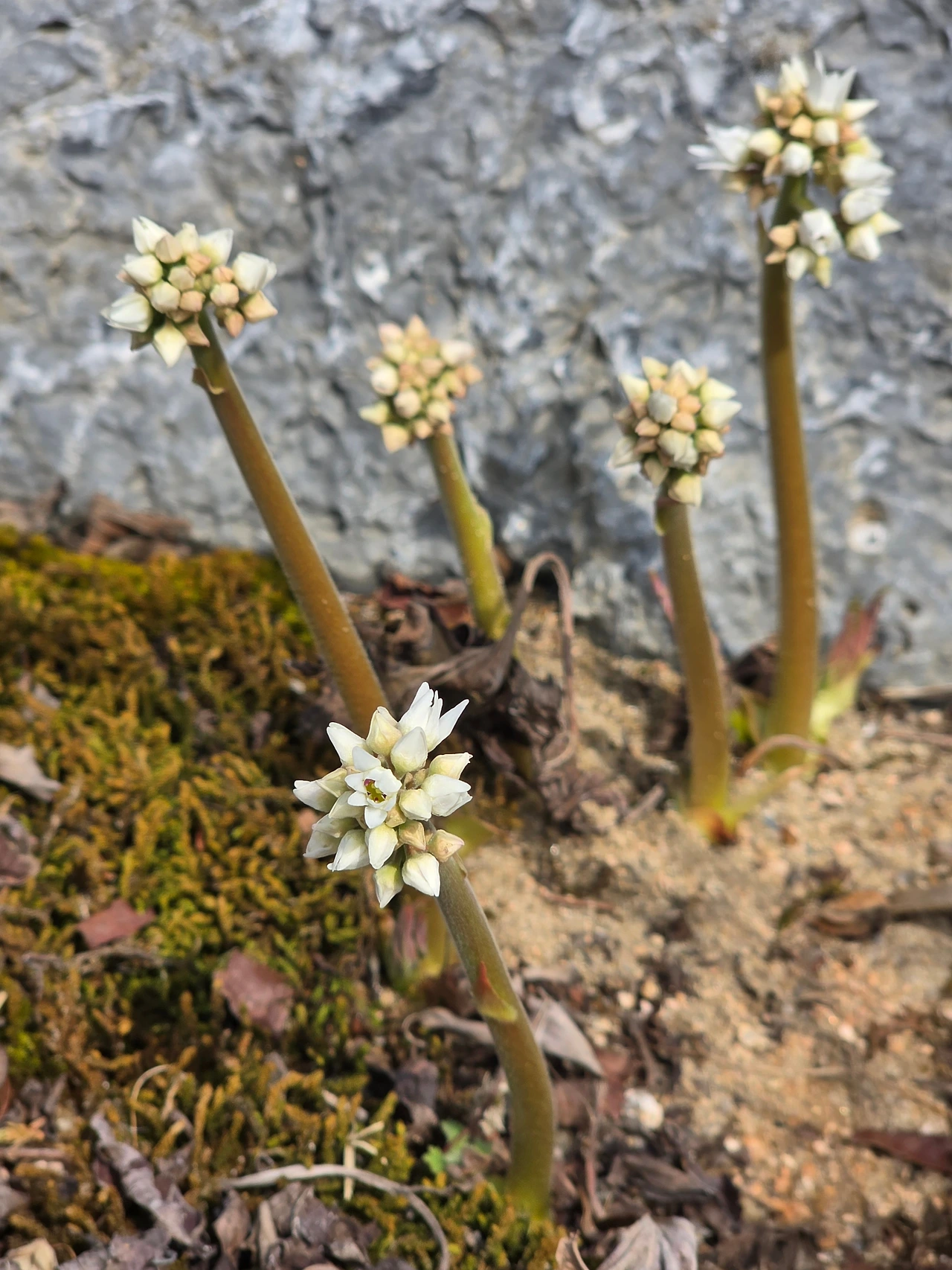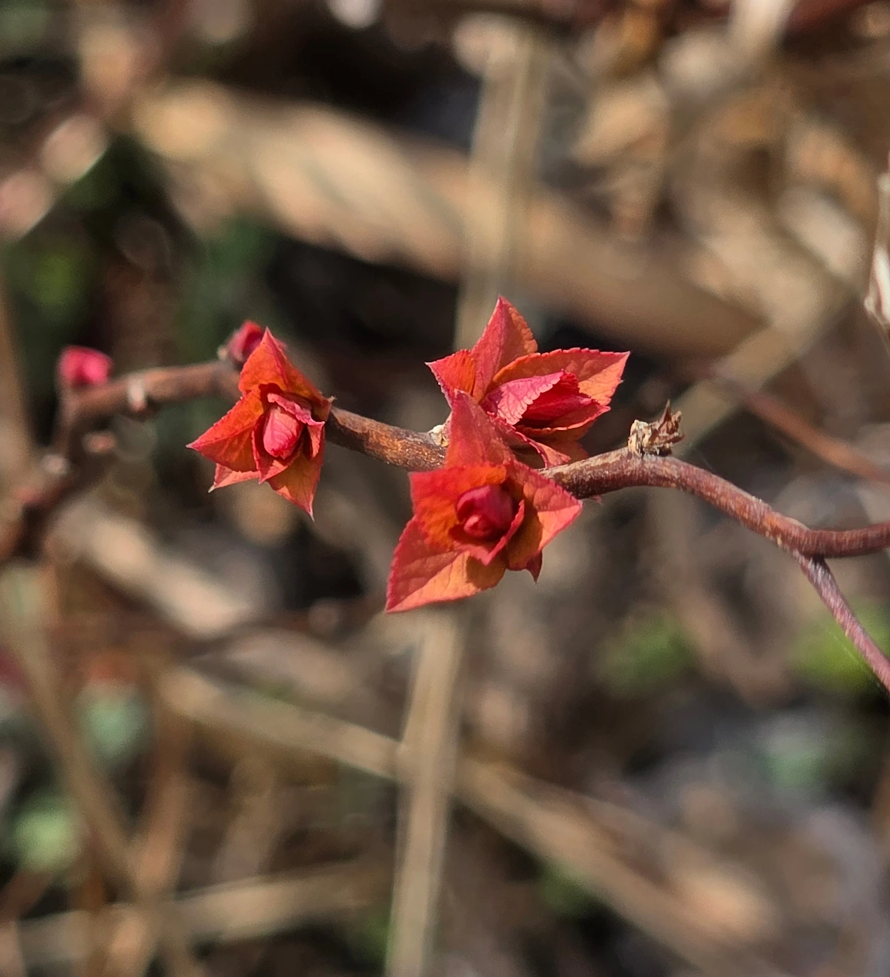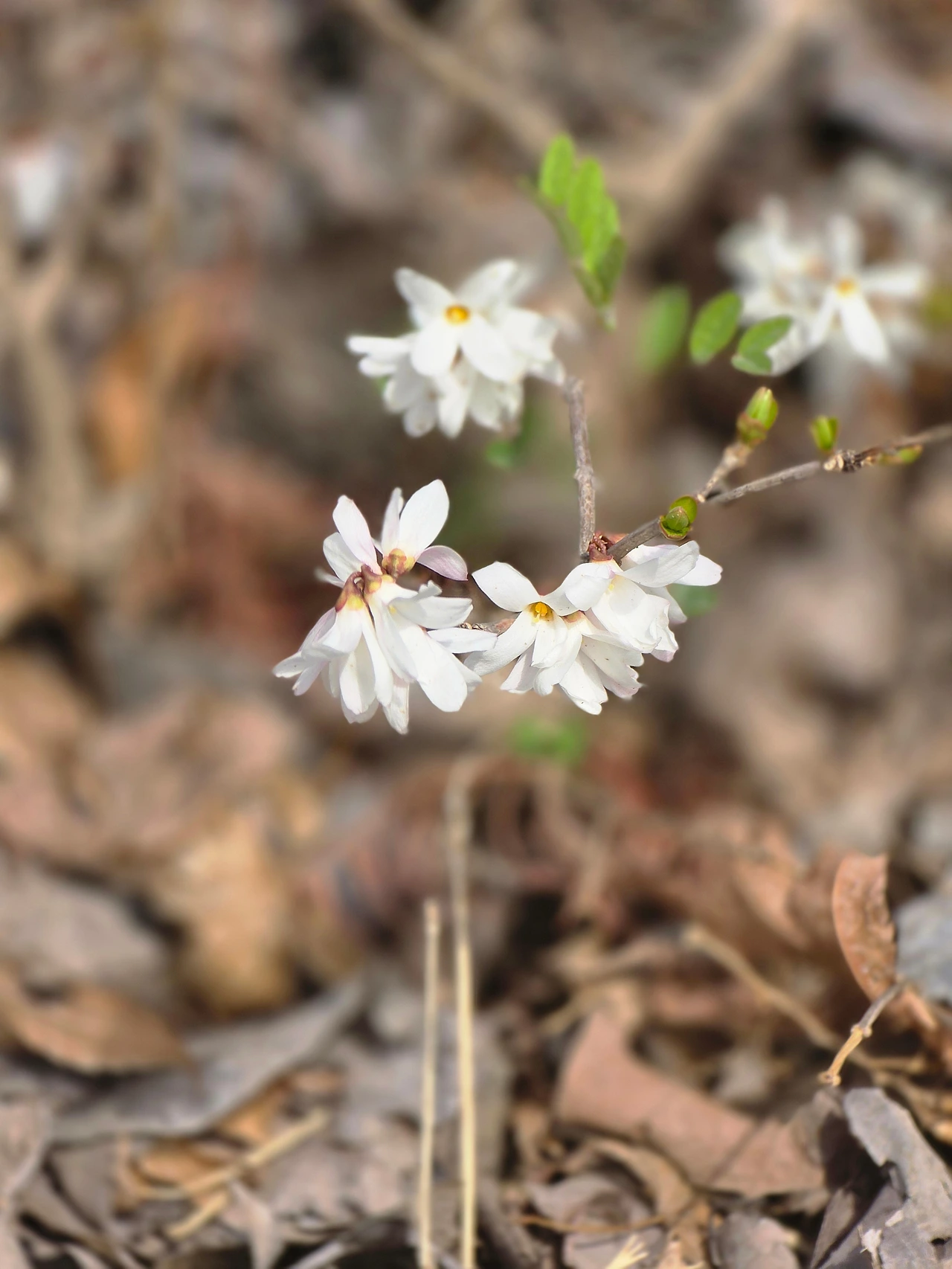 보기에는 마른풀들과 잎을 다 떨군 관목들이 스산한 꽃밭을 지나다 한 무리의 흰꽃을 만났다. 가까이 보니 미선나무다. 흰개나리라고도 불리는 우리 고유종인 꽃으로 꽃들이 옹기종기 모여 탐스럽게 피었다. 바로 곁에는 이름 모를 새순이 꽃보다 붉은 새잎을 틔웠다. 돌단풍도 꽃대를 내밀고 꽃망울을 터뜨렸다. 무심하게 지나칠 수도 있었는데 기쁘게도 시야에 포착되어 반갑다.