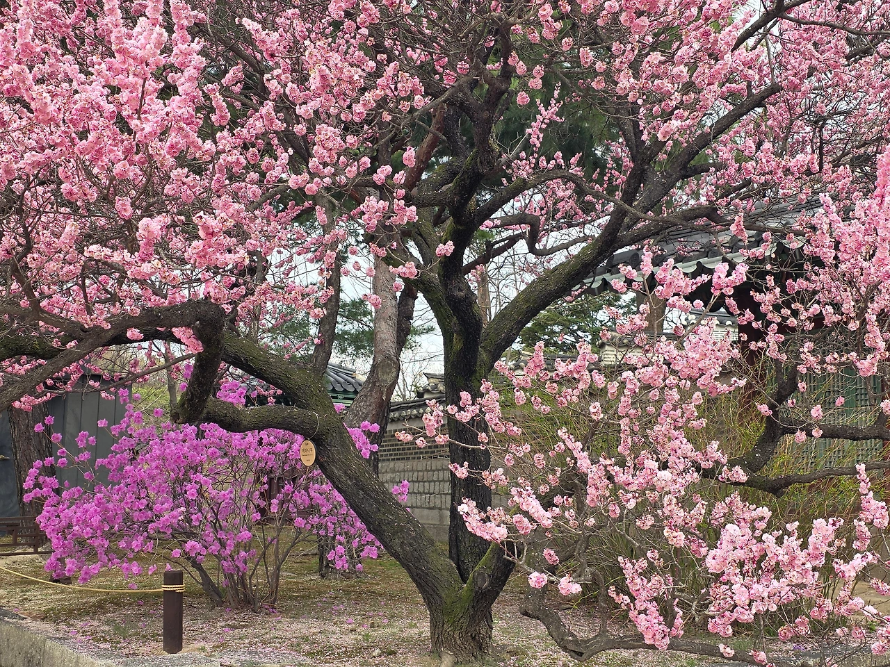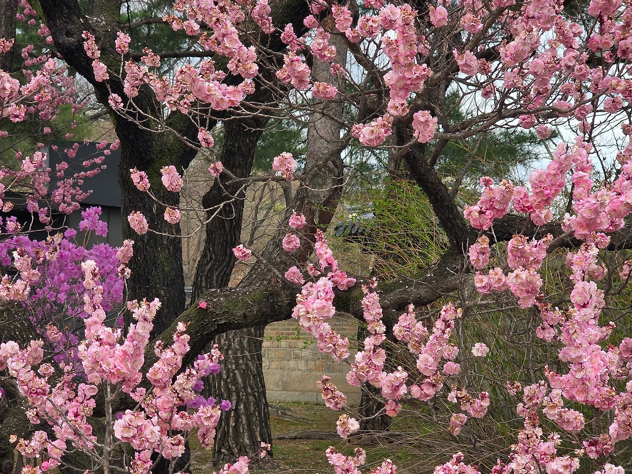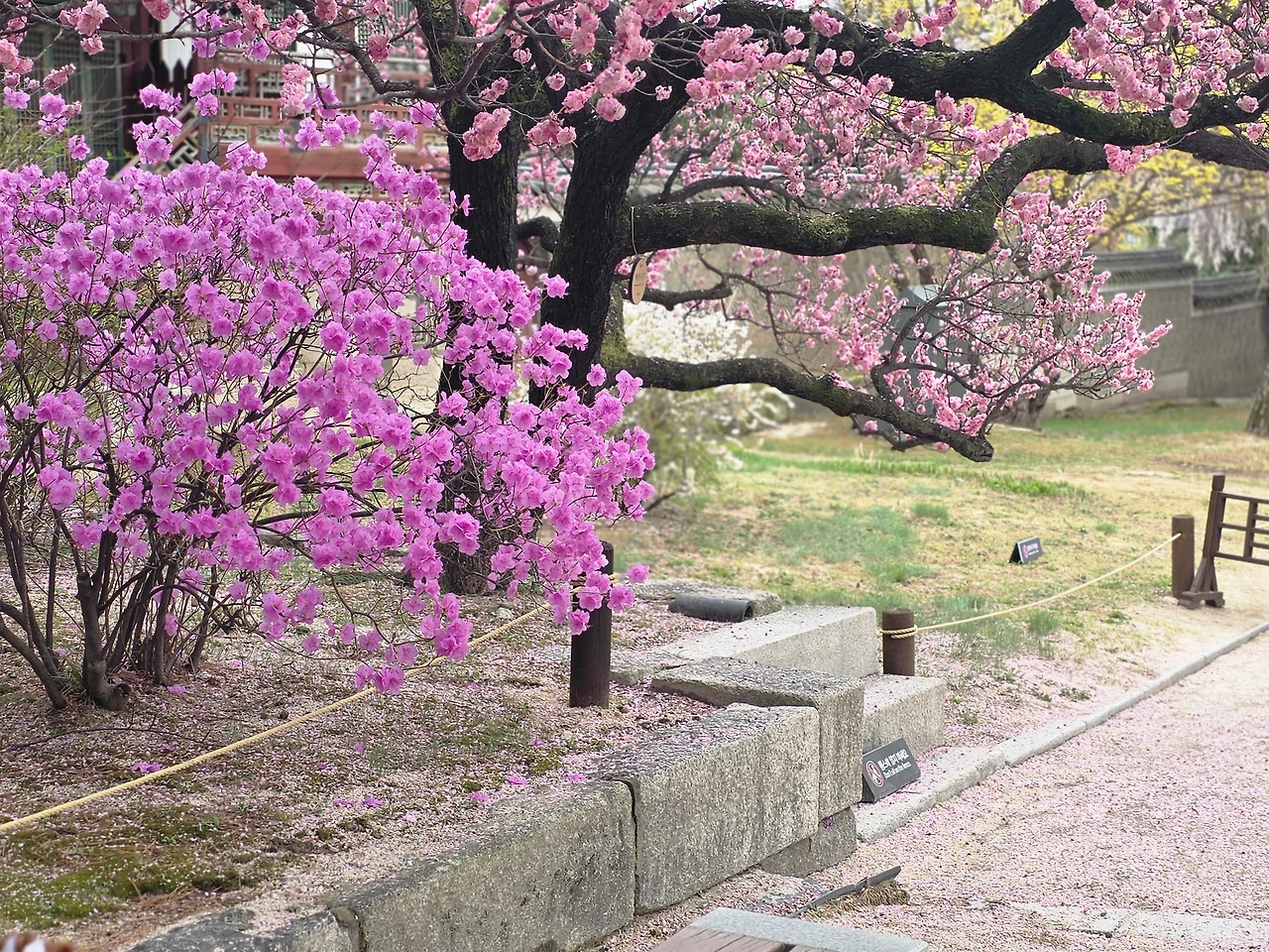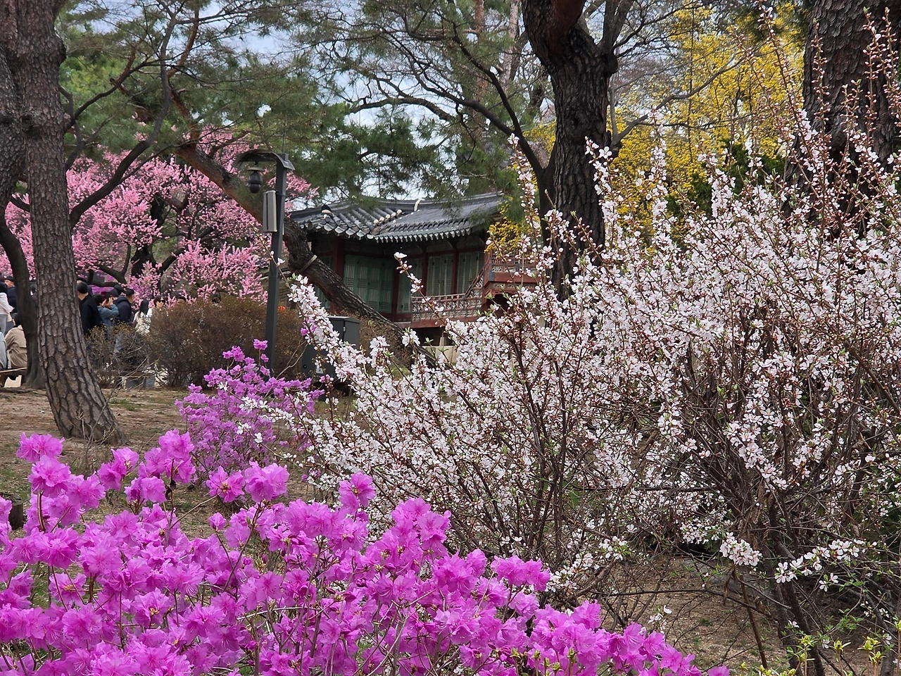 입구부터 꽃들의 향연이 펼쳐졌다. 진달래가 여기저기 만개를 했다. 거리는 무채색이지만 고궁의 뜨락은 밝은 색감으로 생기가 넘친다.