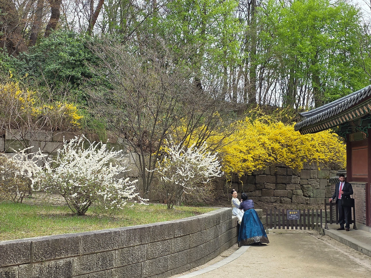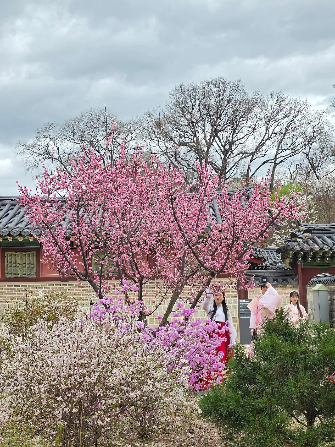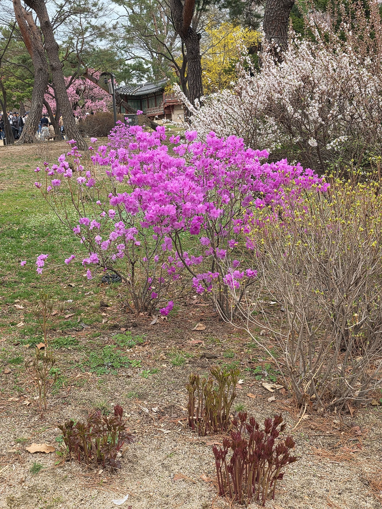 입구부터 꽃들의 향연이 펼쳐졌다. 진달래가 여기저기 만개를 했다. 거리는 무채색이지만 고궁의 뜨락은 밝은 색감으로 생기가 넘친다.