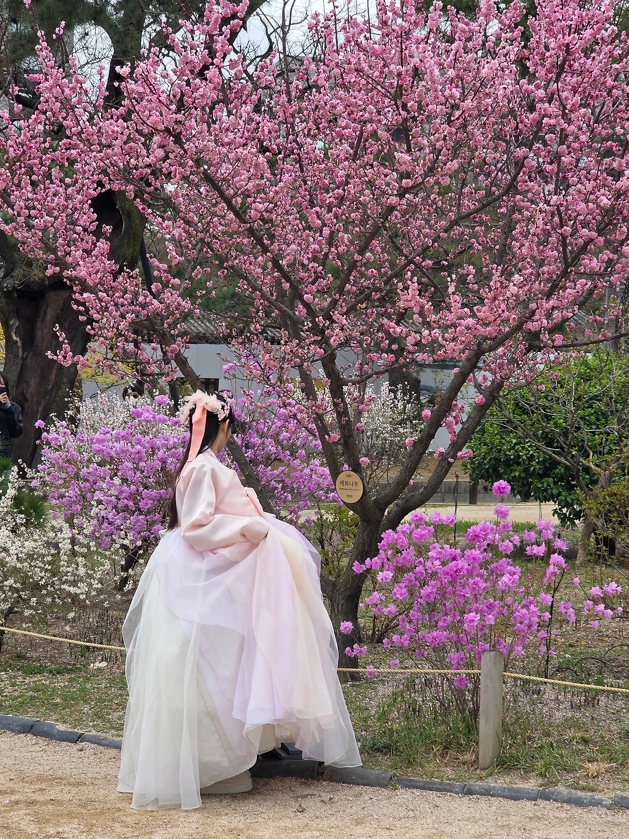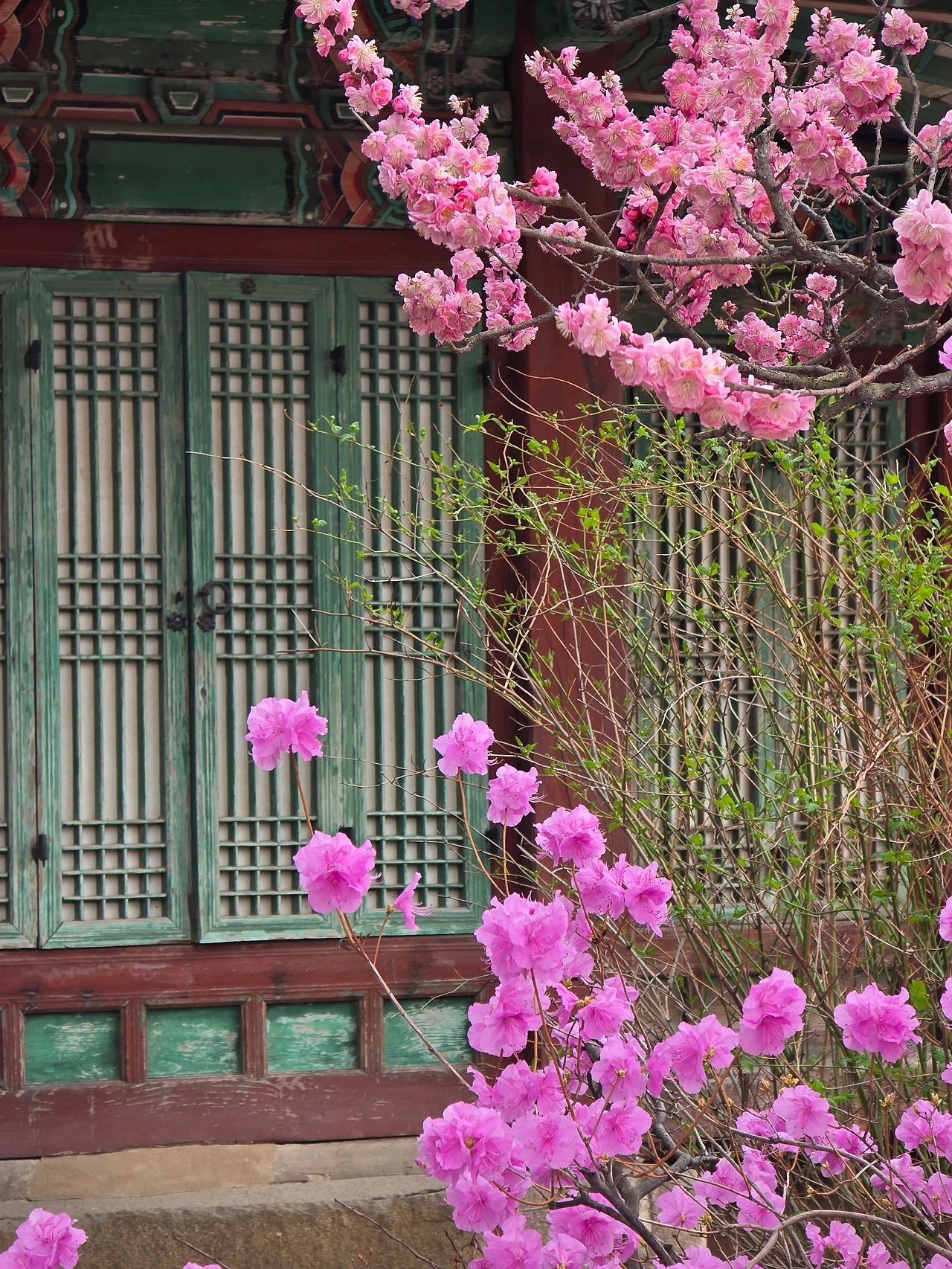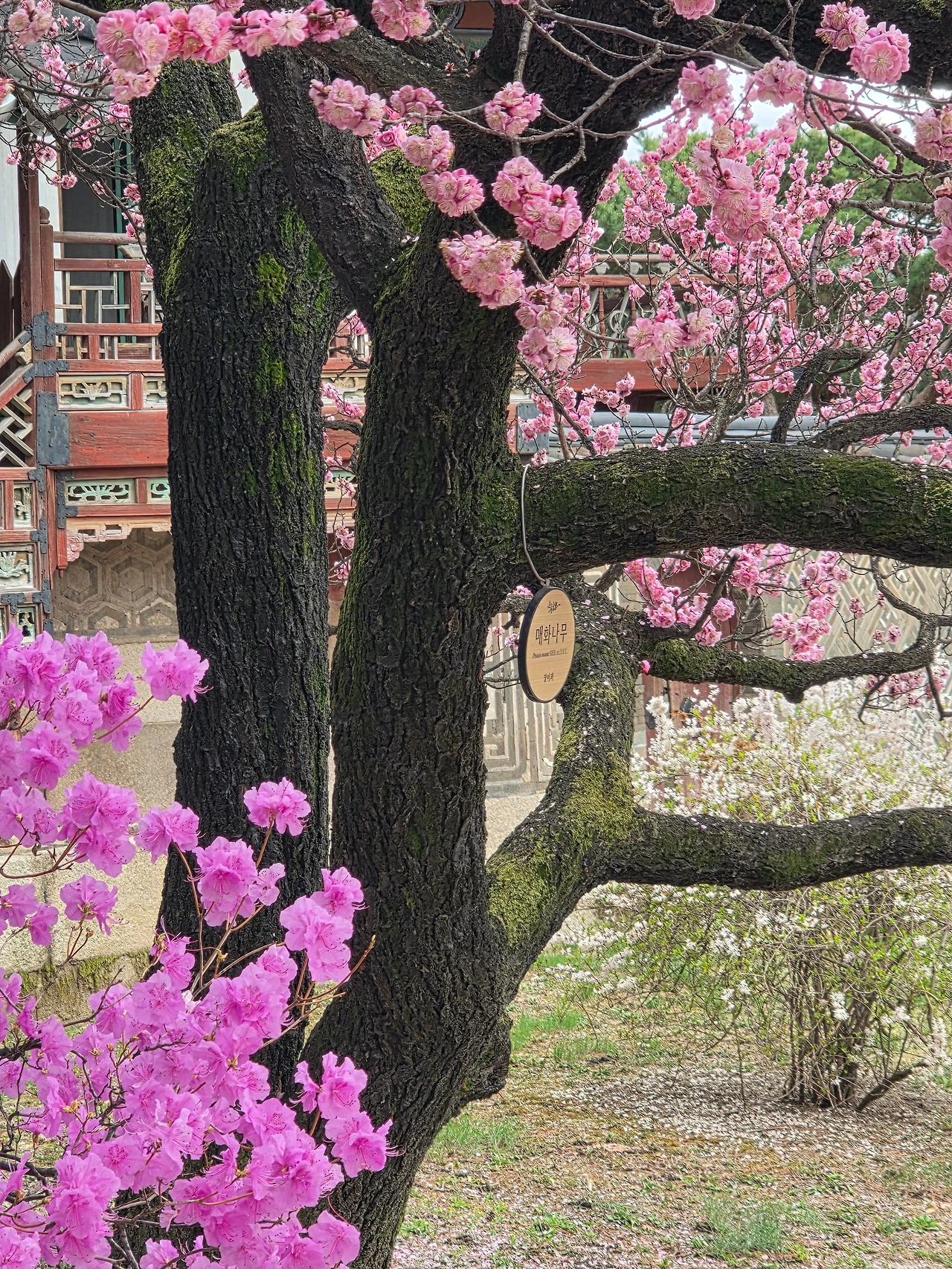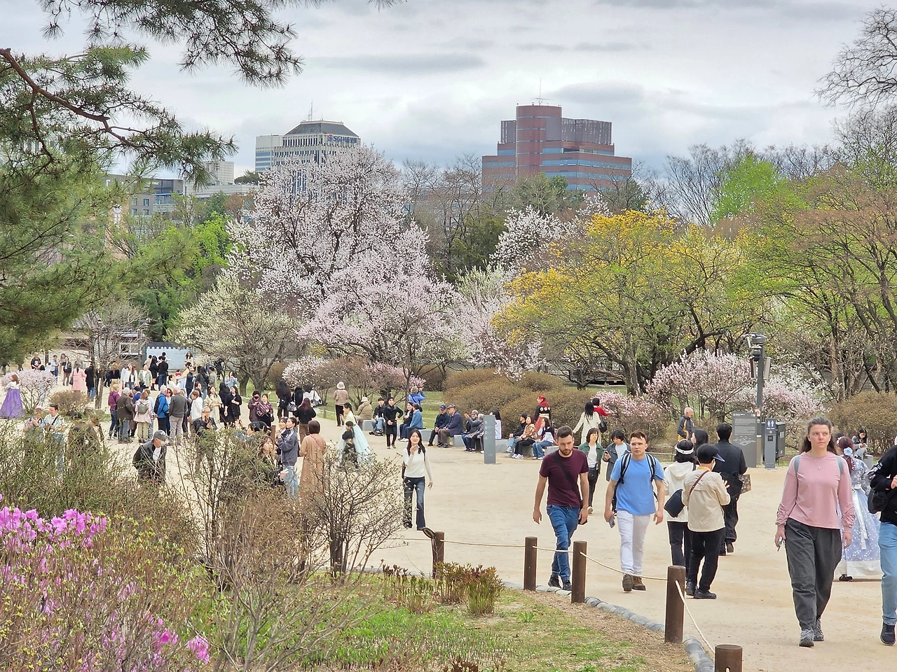 입구부터 꽃들의 향연이 펼쳐졌다. 진달래가 여기저기 만개를 했다. 거리는 무채색이지만 고궁의 뜨락은 밝은 색감으로 생기가 넘친다.
