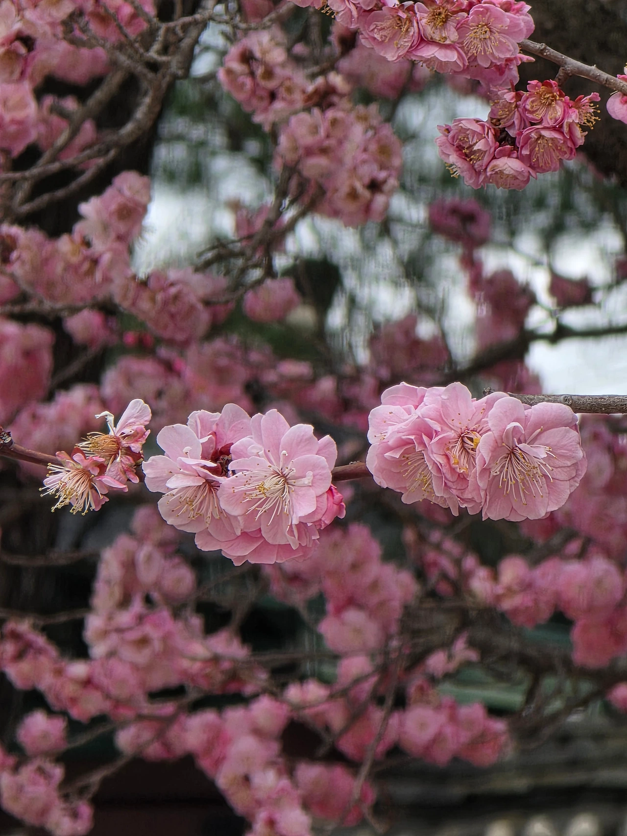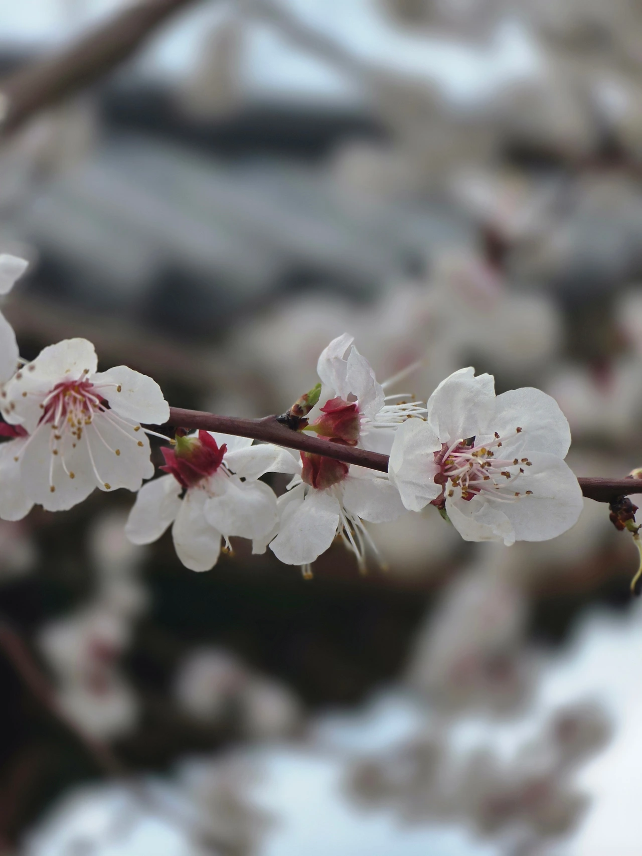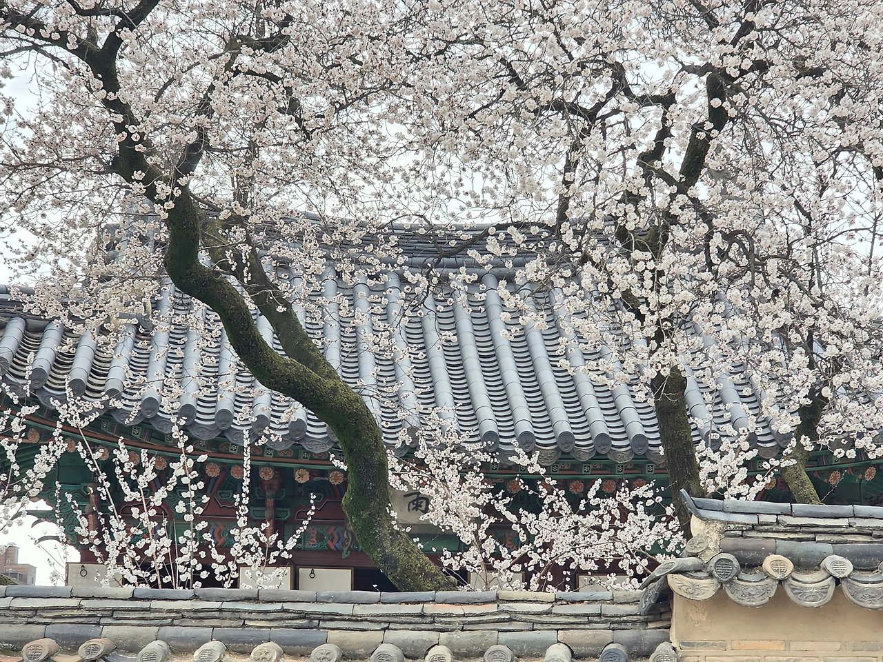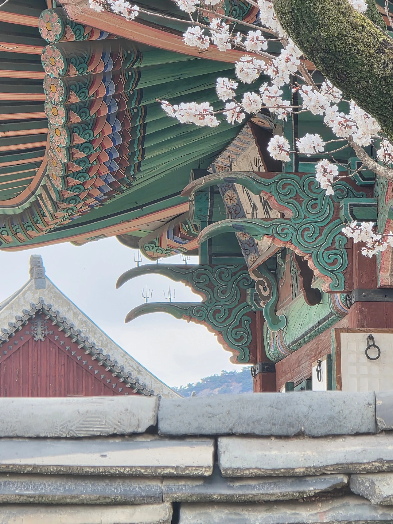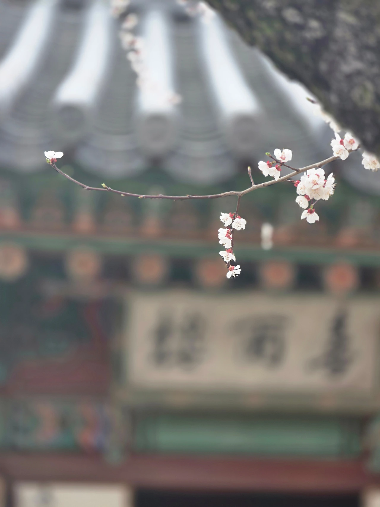 살구나무꽃으로 온통 뒤덮인 전각은 마치 눈 오는 풍경 같다. 매화와 벚꽃과 꼭 닮은 살구꽃은 성숙한 여인의 향기가 난다. 특히 붉은 꽃받침이 매력이다. 전각을 배경으로 휘어서 늘어진 가지에 달린 꽃송이가 고혹적이다.