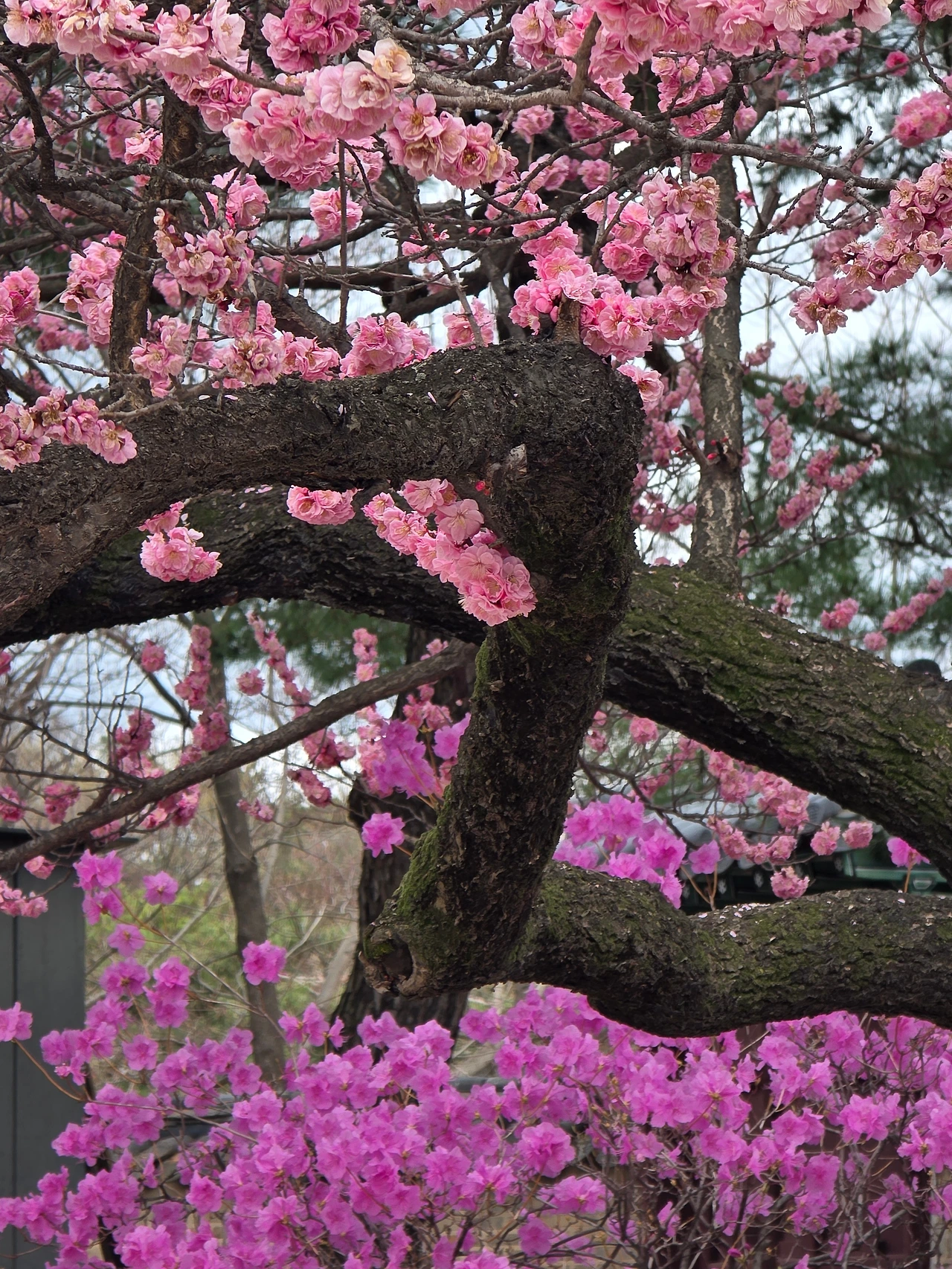 몇 년 전에 만개한 홍매화를 접했을 때는 오로지 홍매화에만 눈길이 갔다. 그때도 흐린 날이어서 빛을 제대로 담지 못했는데 오늘도 마찬가지였다. 앞으로도 봄철이면 심해지는 미세먼지의 여파를 피하기가 어려울 것 같다. 그럴지라도 오늘은 홍매화 주변에 초록초록한 풀밭이 배경이 되고 꽃분홍의 농염한 진달래도 피어있어 흐린 날인데도 싱그럽고 밝은 분위기를 빚어냈다.