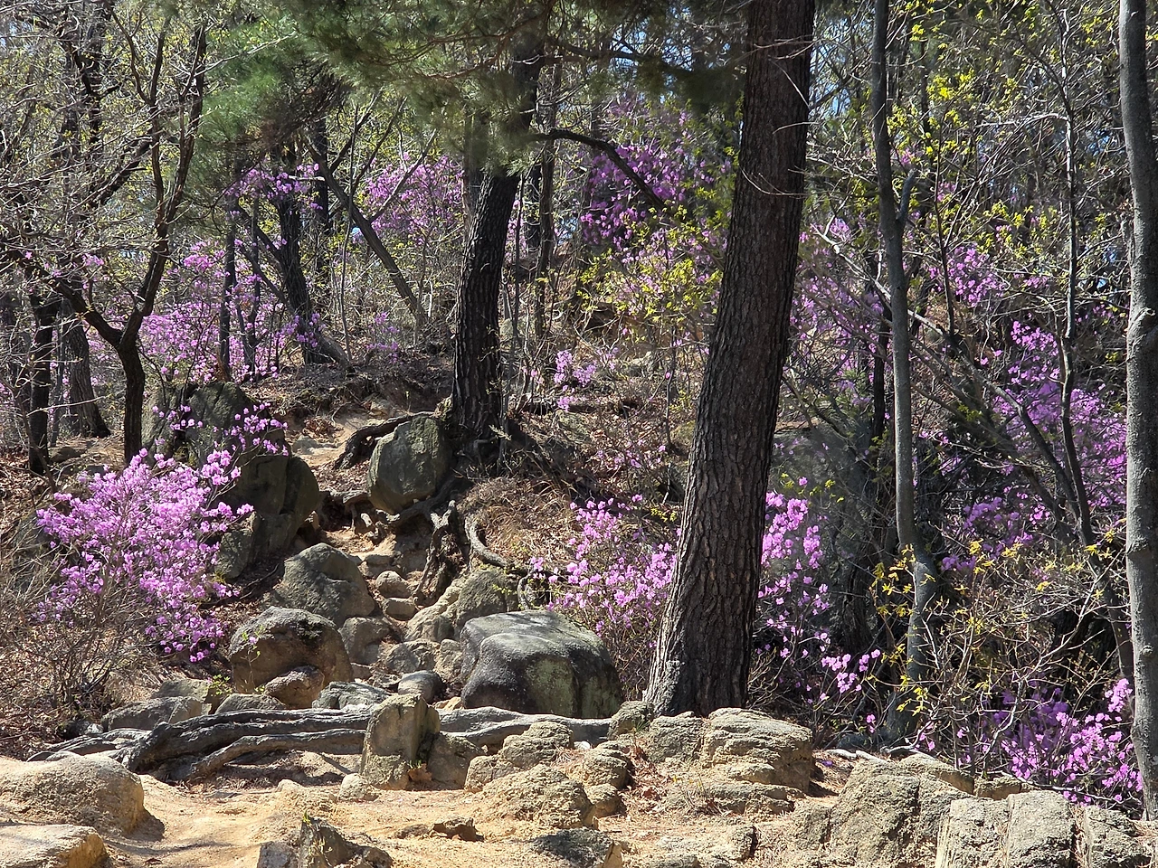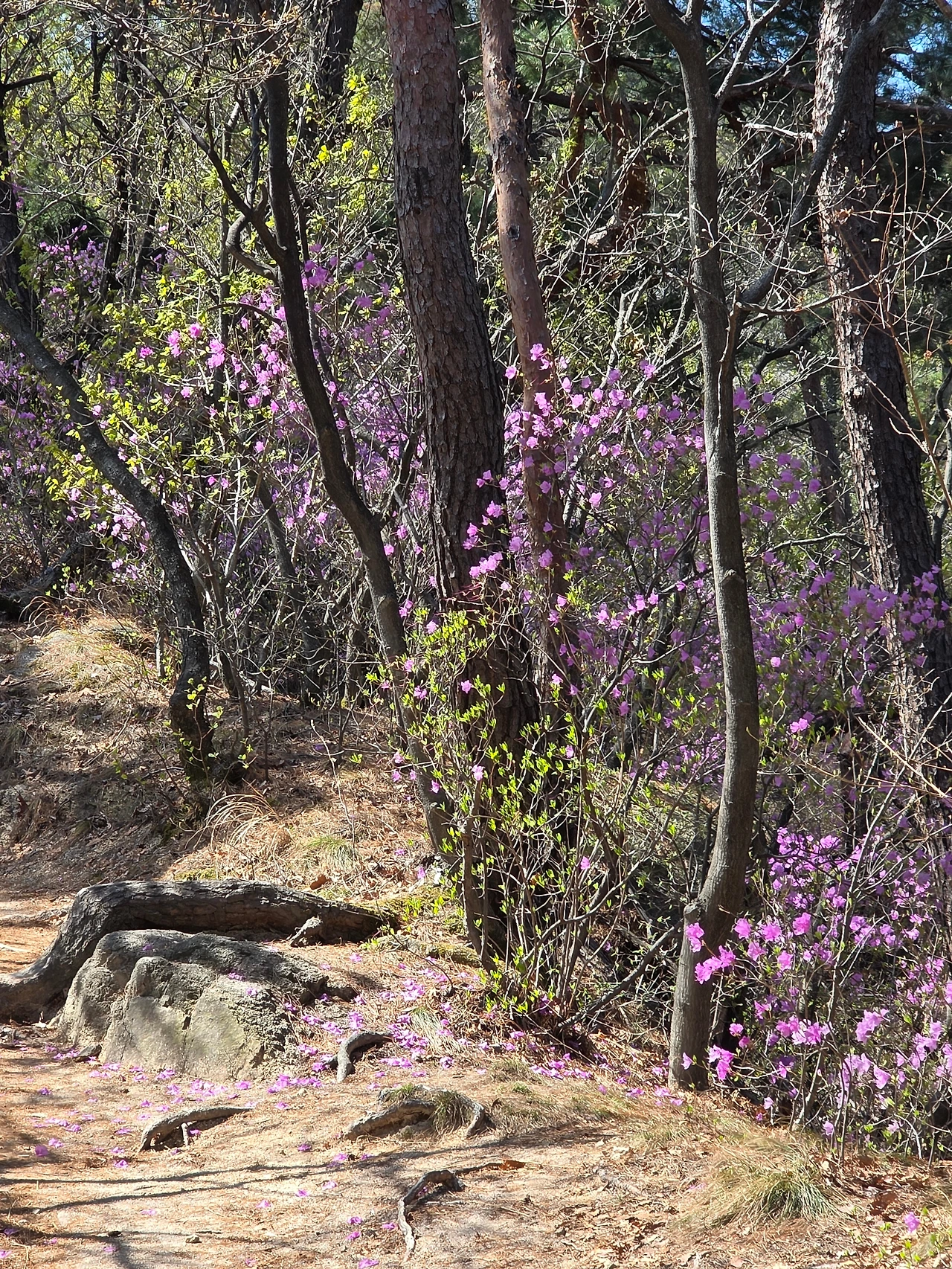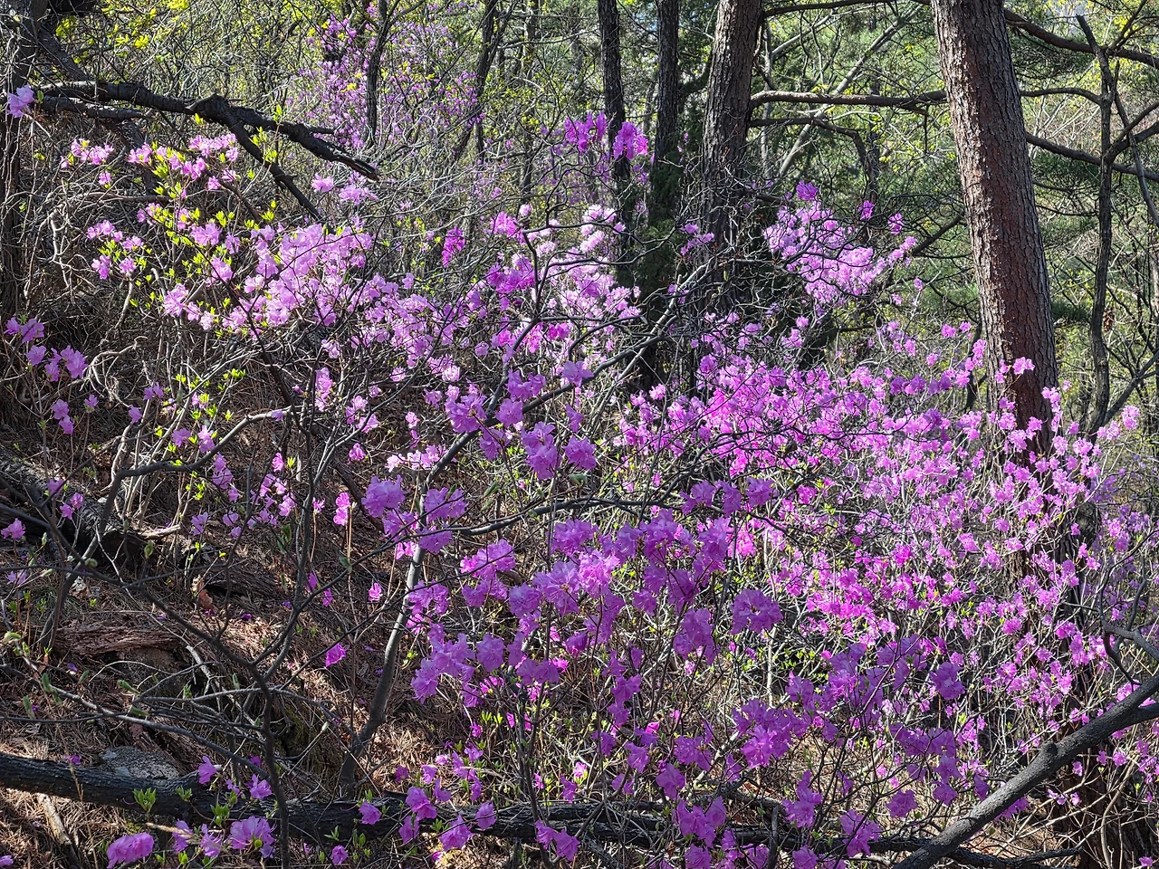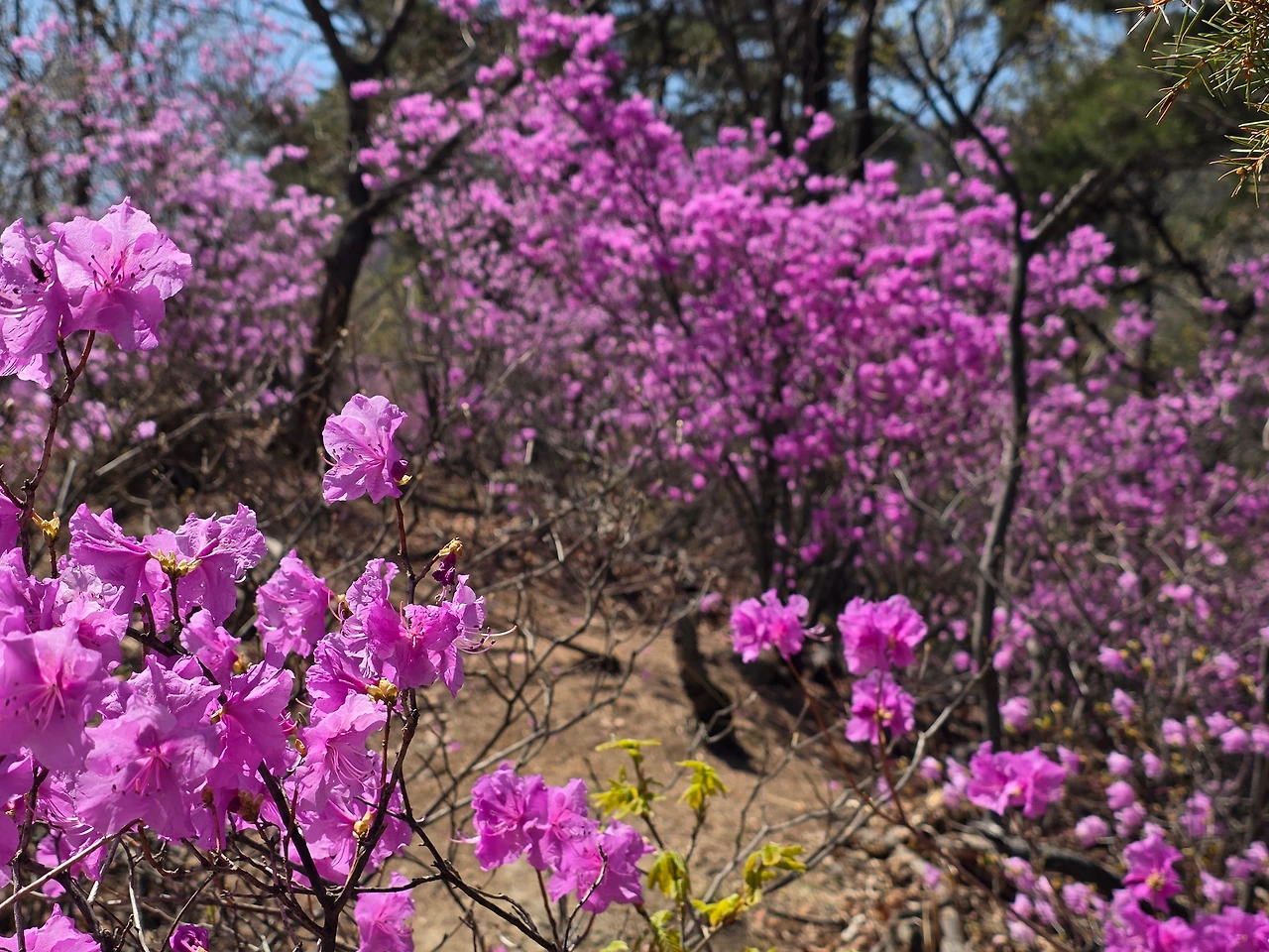 산에 깊이 들어설수록 진달래는 점점 많아진다. 산 허리가 아예 온통 진달래 꽃밭이다. 사진을 찍느라 자꾸 멈춰 선다. 한 컷을 찍고 나면 더 멋진 장소가 연이어져 지체가 된다. 하지만 여유로운 나들이라 바쁠 것도 없다.