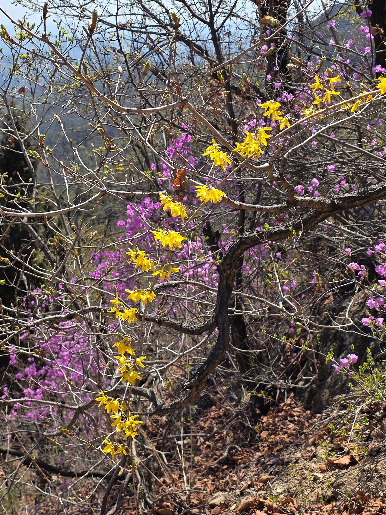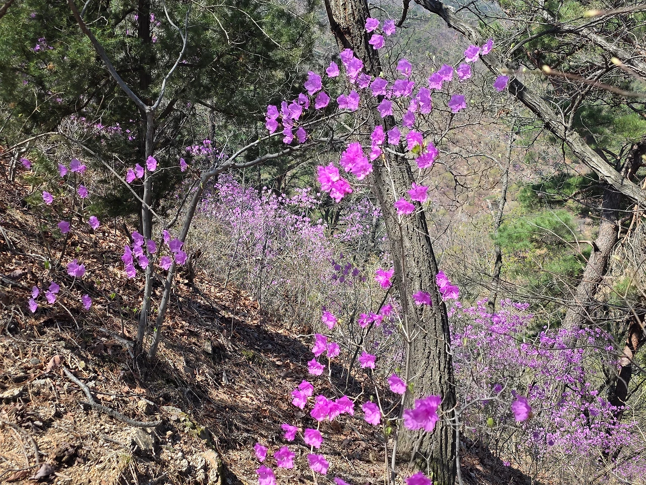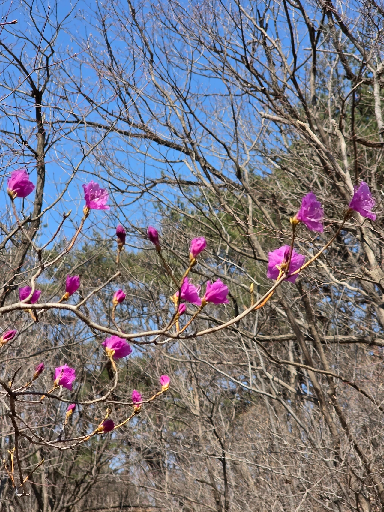 산에 오를수록 진달래가 많아진다. 꽃은 분홍 일색이지만 다 같은 분홍이 아니다. 진한 꽃분홍에서 연한 분홍까지 다양하다. 햇빛에 노출이 된 꽃빛은 투명한 분홍색이다. 산 아래는 목련이 한창이다. 하산해서 보니 멋진 또 하나의 볼거리였다.