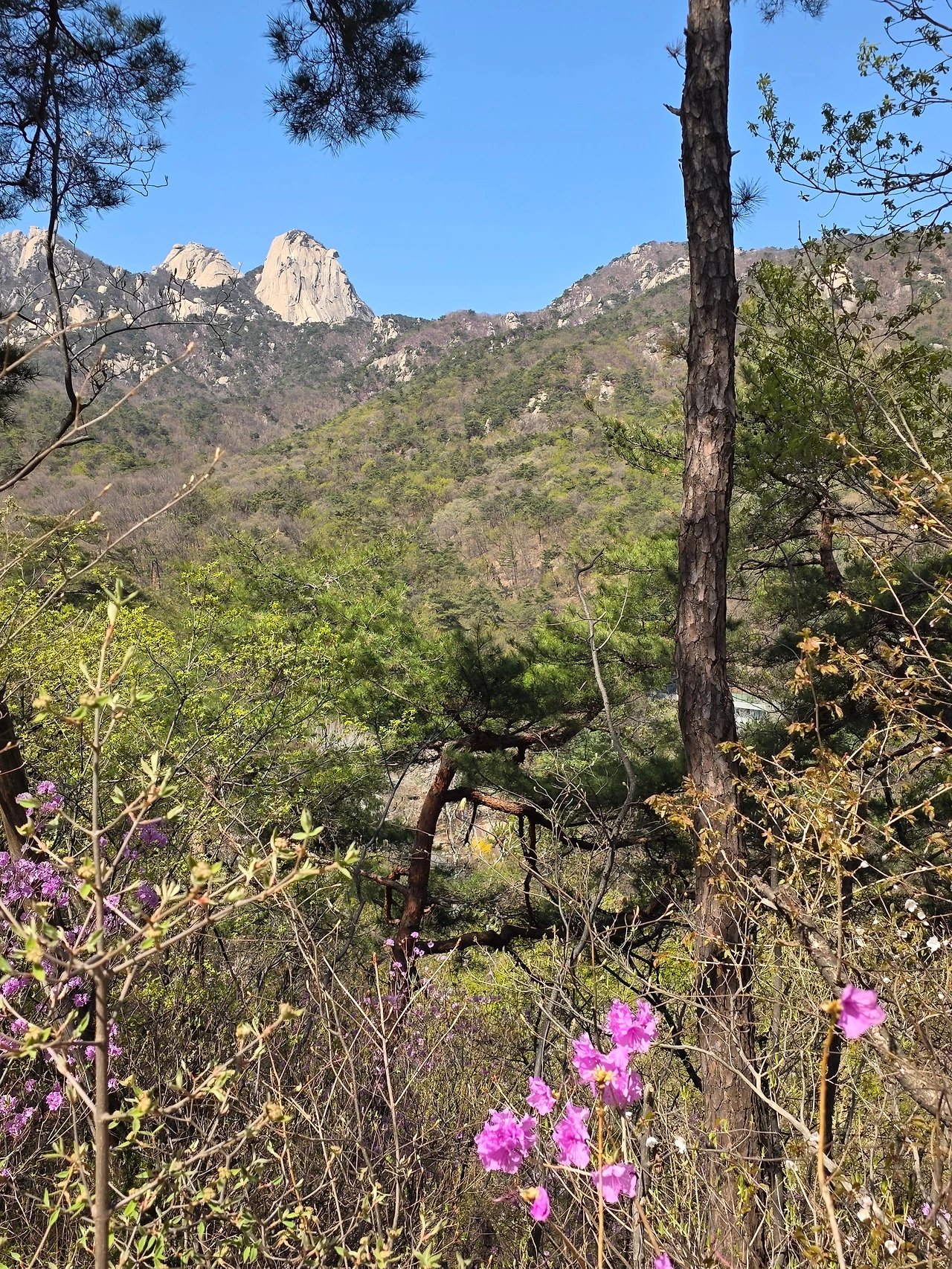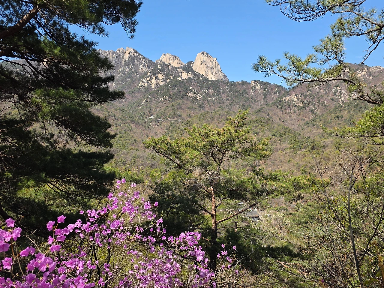 진달래 능선에 들어서자 진달래꽃이 등장하기 시작했다. 산은 벌써 신록을 입고 있다. 연초록의 어린잎들이 햇살에 재잘대고 연분홍 진달래가 눈부시게 개화 중이다. 제대로 잘 왔다는 만족감이 온몸을 휘감는다. 절정의 봄을 만나는 순간이다.