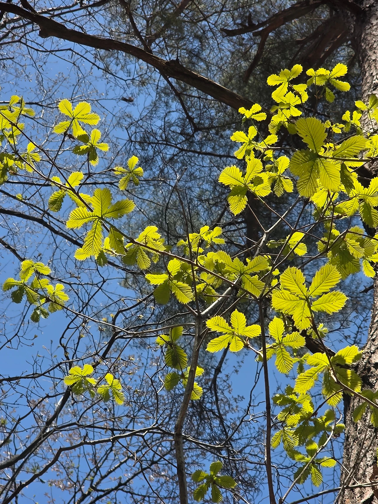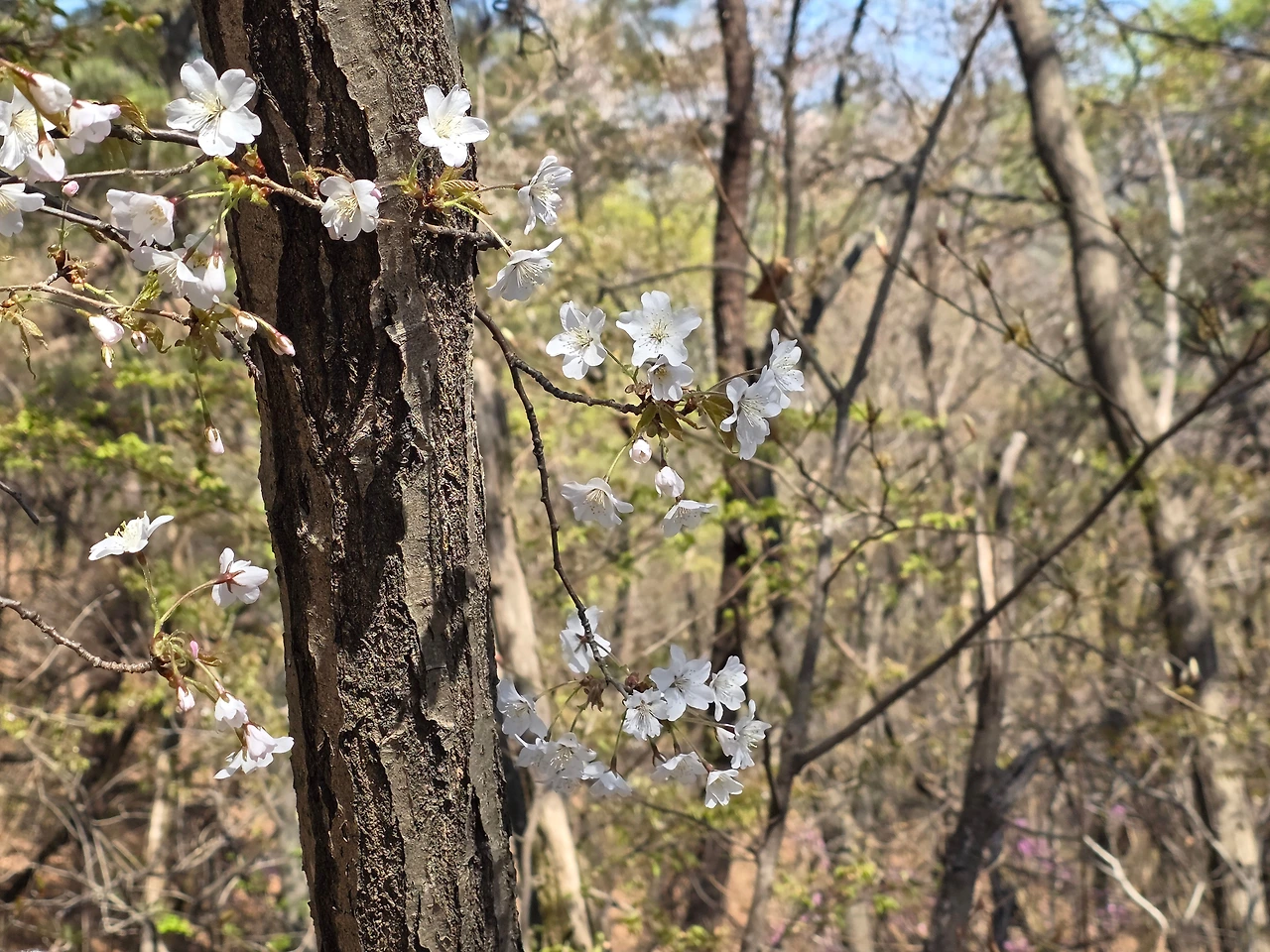 주변이 온통 진달래 꽃이지만 산벚꽃도 보인다. 청초한 자태가 풍성하게 핀 벚꽃과는 또 다른 매력이 있다. 참나무도 겨울잠에서 깨어서 부지런해졌다. 어린잎들이 꽤 자랐다. 방사형으로 펼쳐진 모양이 마치 꽃 같다.