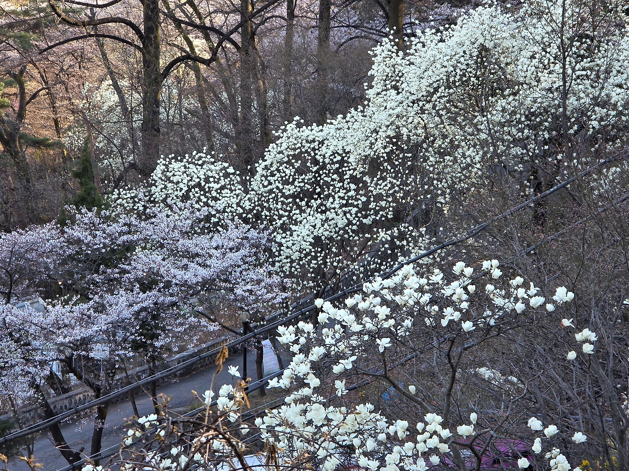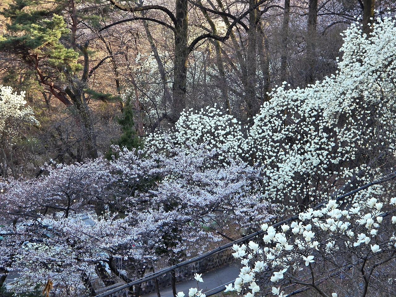 하산길의 백미는 목련이었다. 수많은 목련꽃이 하늘에 은하수가 펼쳐지듯 흐드러지게 피어났다.