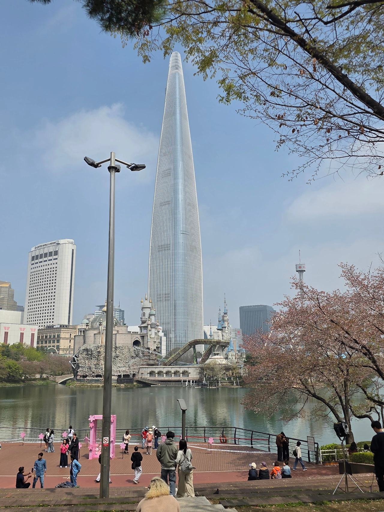 롯데 타워는 확실히 눈길을 끈다. 햇빛을 받아 자태가 더욱 빛난다. 호수에 비친 타워가 서울의 시그니처답게 멋지다.