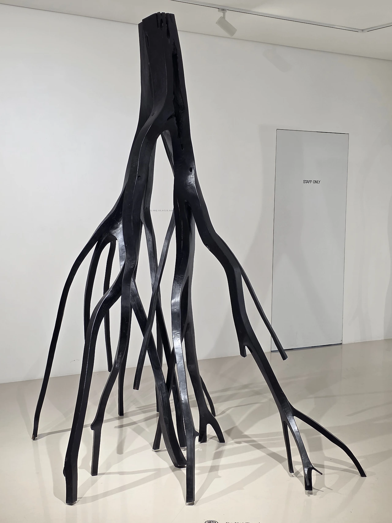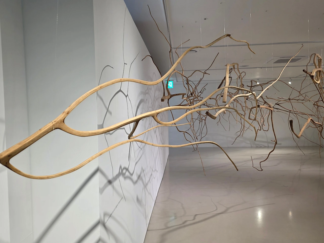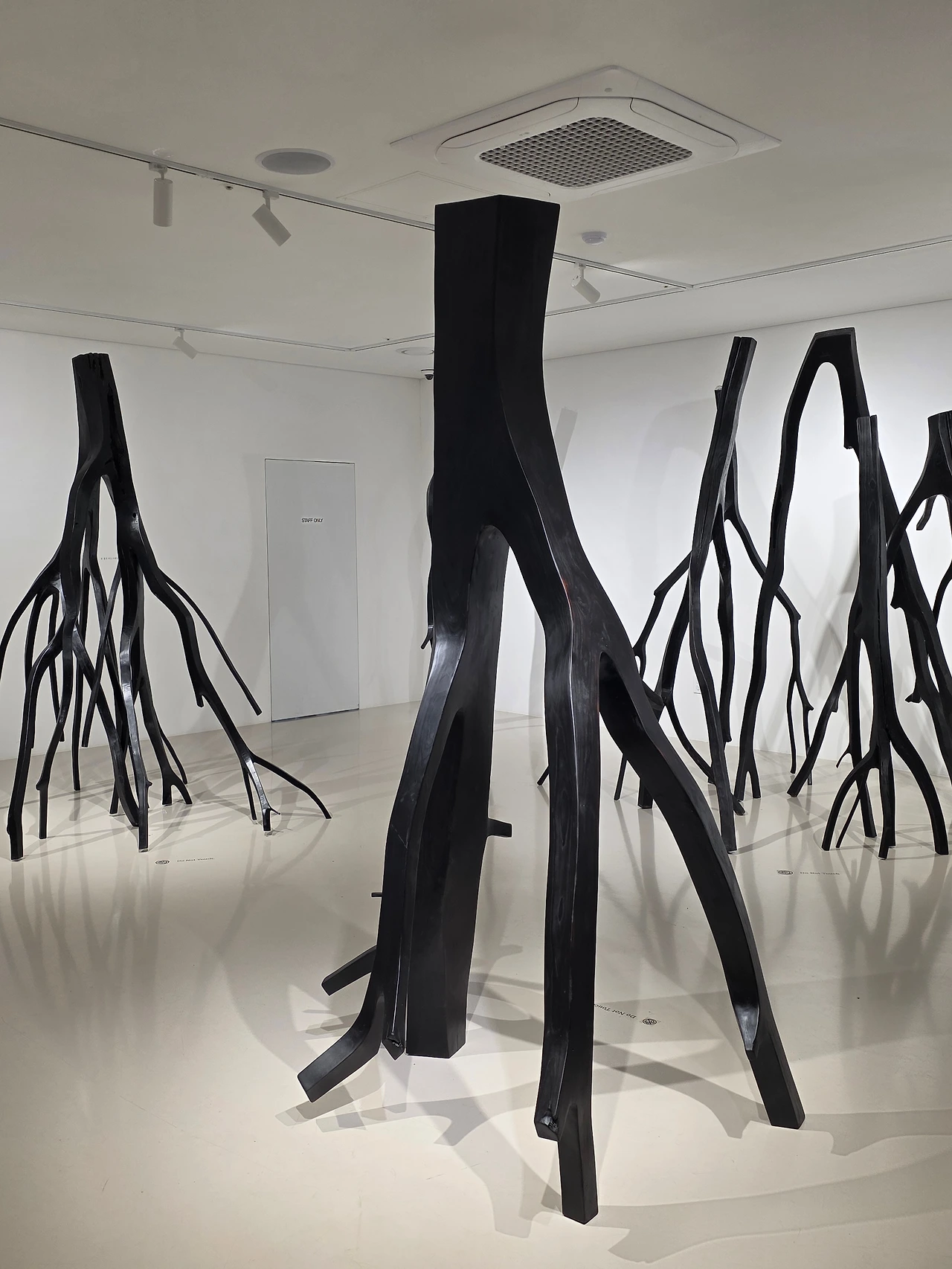 산책로 중간에 또 다른 갤러리가 있었다. 그림에 관심이 크기에 앞장서서 일행을 갤러리로 이끌었다. 전시실에는 대왕참나무 가지를 정성스럽게 다듬은 설치 작품이 공간을 가득 채웠다. 자연을 그대로 살리고 거기에 작가의 세심한 노고를 더해 정성 들여 빚은 작품이다. 옆에는 나무를 거꾸로 세워놓은 작품인데 각지게 다듬고 검게 칠해 나무의 질감이 느껴지지 않는다. 삶이 단순한 듯해도 들여다보면 복잡하다는 것을 은유적으로 보여주는 것 같다. 이층에는 화려한 추상의 설치물이 꿈속의 한 장면을 그려 놓은 듯하다. 신선들이 사는 이상향이 저렇게 신비롭지 않을까.