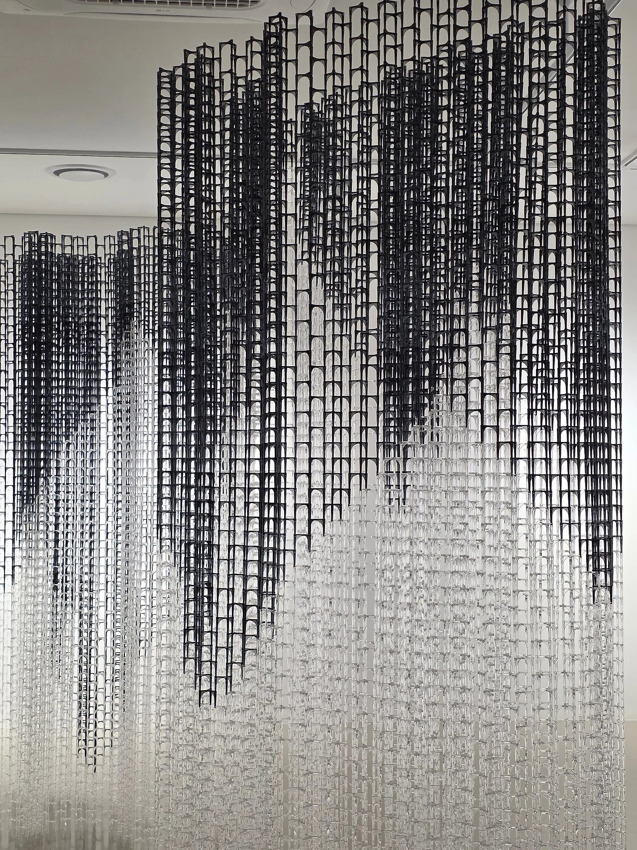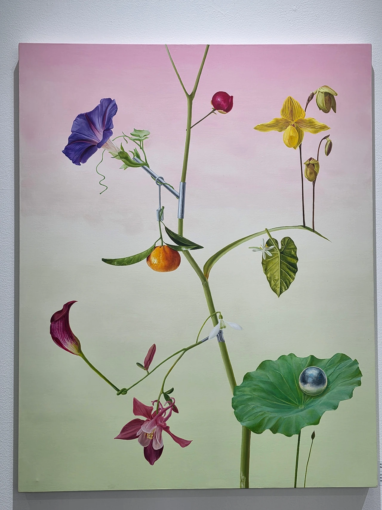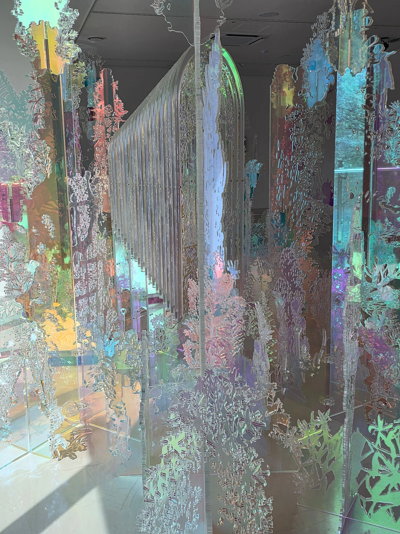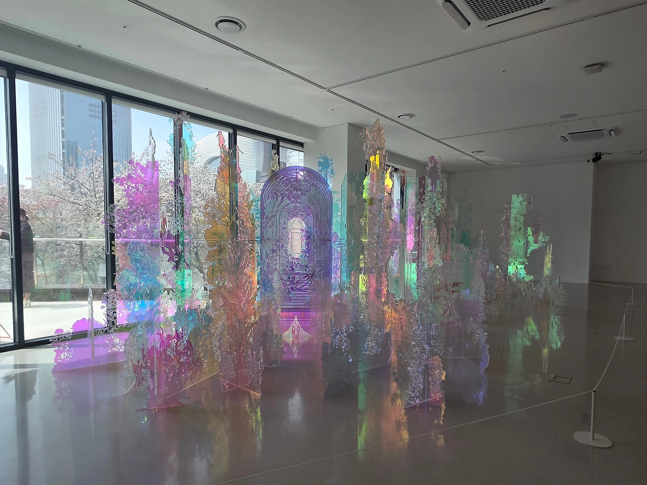 산책로 중간에 또 다른 갤러리가 있었다. 그림에 관심이 크기에 앞장서서 일행을 갤러리로 이끌었다. 전시실에는 대왕참나무 가지를 정성스럽게 다듬은 설치 작품이 공간을 가득 채웠다. 자연을 그대로 살리고 거기에 작가의 세심한 노고를 더해 정성 들여 빚은 작품이다. 옆에는 나무를 거꾸로 세워놓은 작품인데 각지게 다듬고 검게 칠해 나무의 질감이 느껴지지 않는다. 삶이 단순한 듯해도 들여다보면 복잡하다는 것을 은유적으로 보여주는 것 같다. 이층에는 화려한 추상의 설치물이 꿈속의 한 장면을 그려 놓은 듯하다. 신선들이 사는 이상향이 저렇게 신비롭지 않을까.