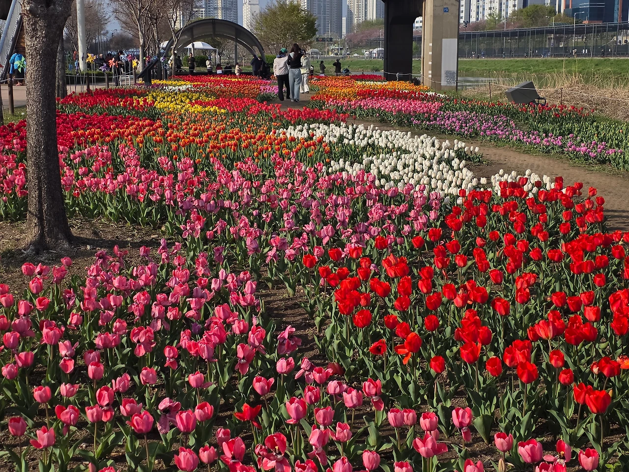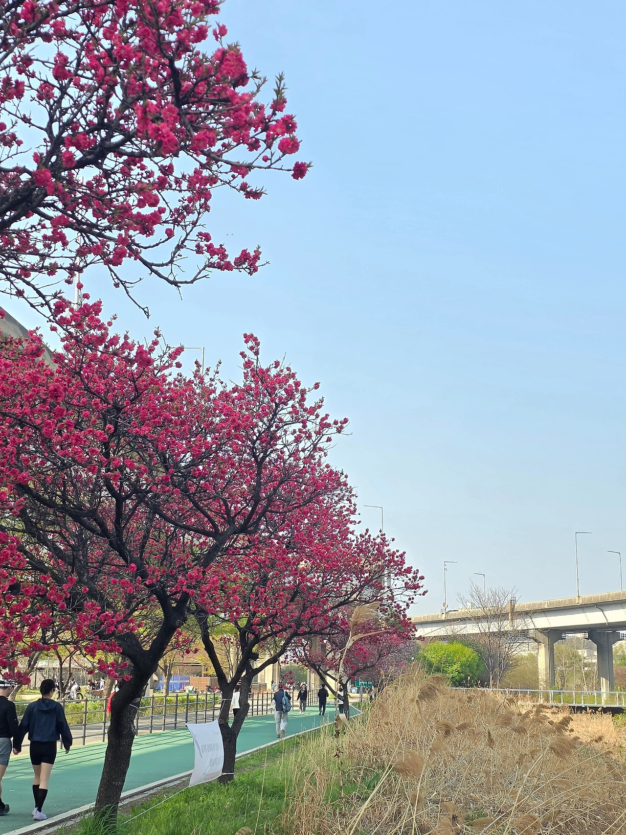 돌아오는 길에는 한양대역에서 내려 따릉이를 탔다. 중랑천에는 고운 꽃들이 우리를 반겼다. 정열의 만첩홍도가 피었고 튤립이 형형색색의 수를 놓았다. 아름다운 계절이다.
