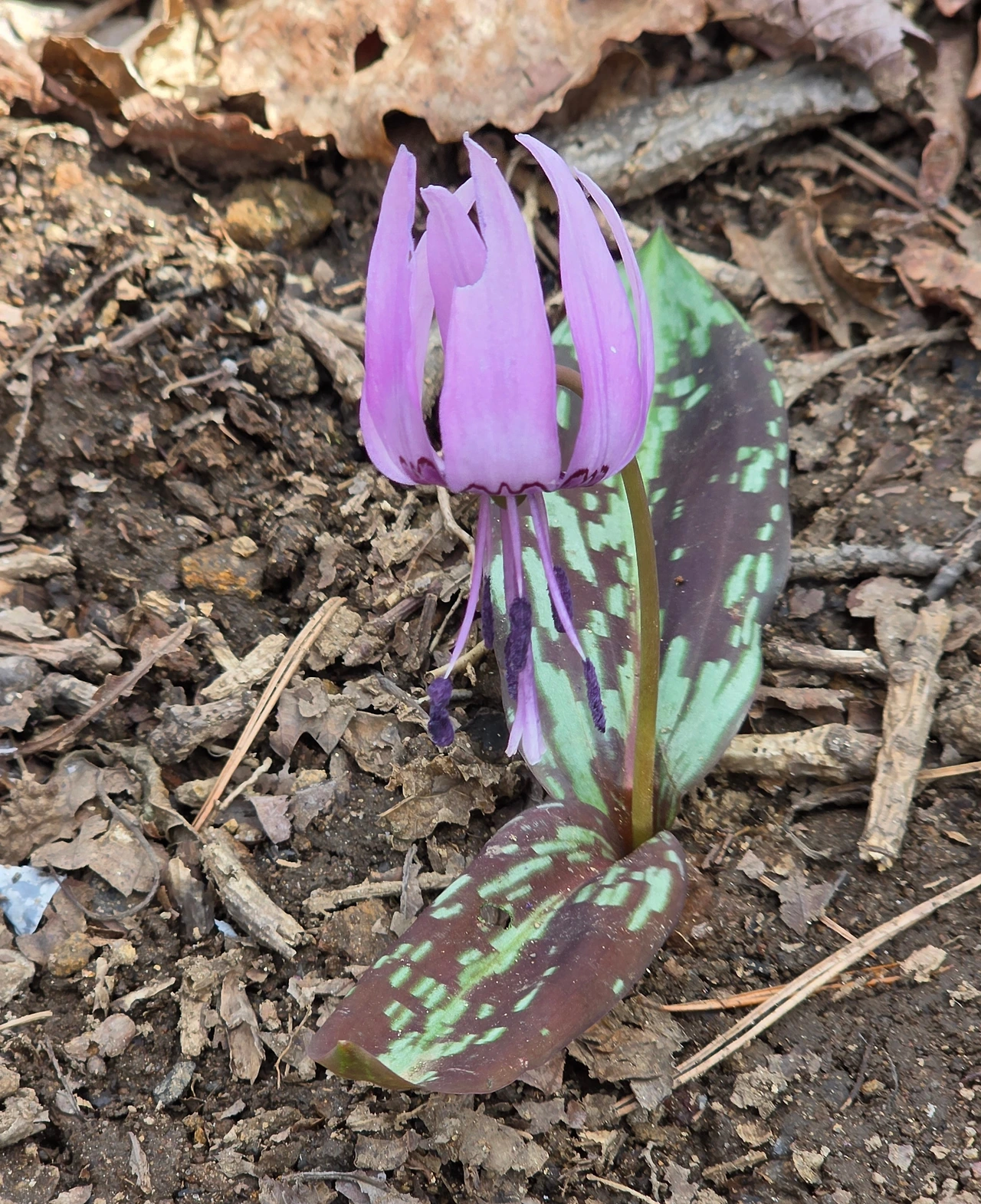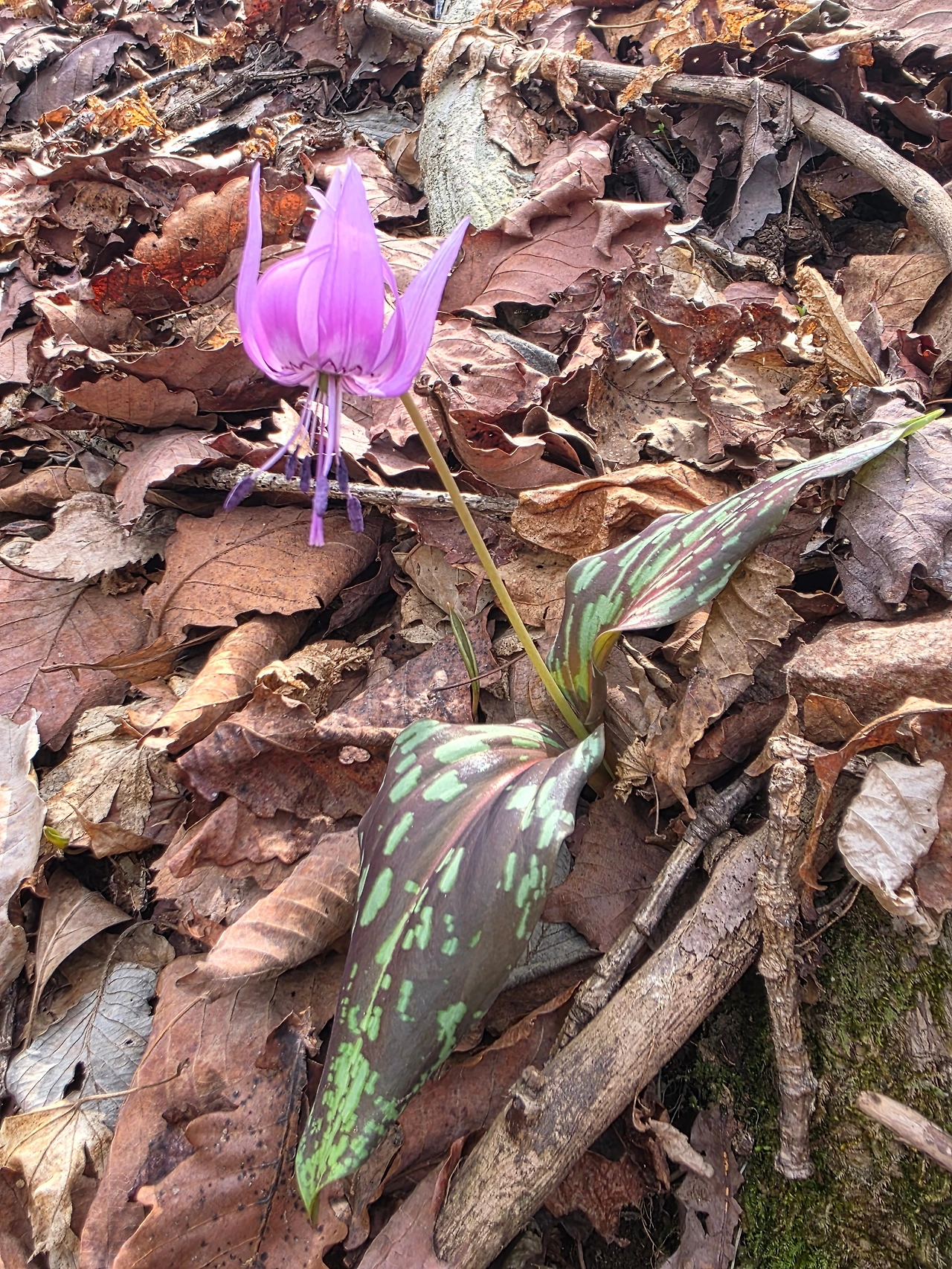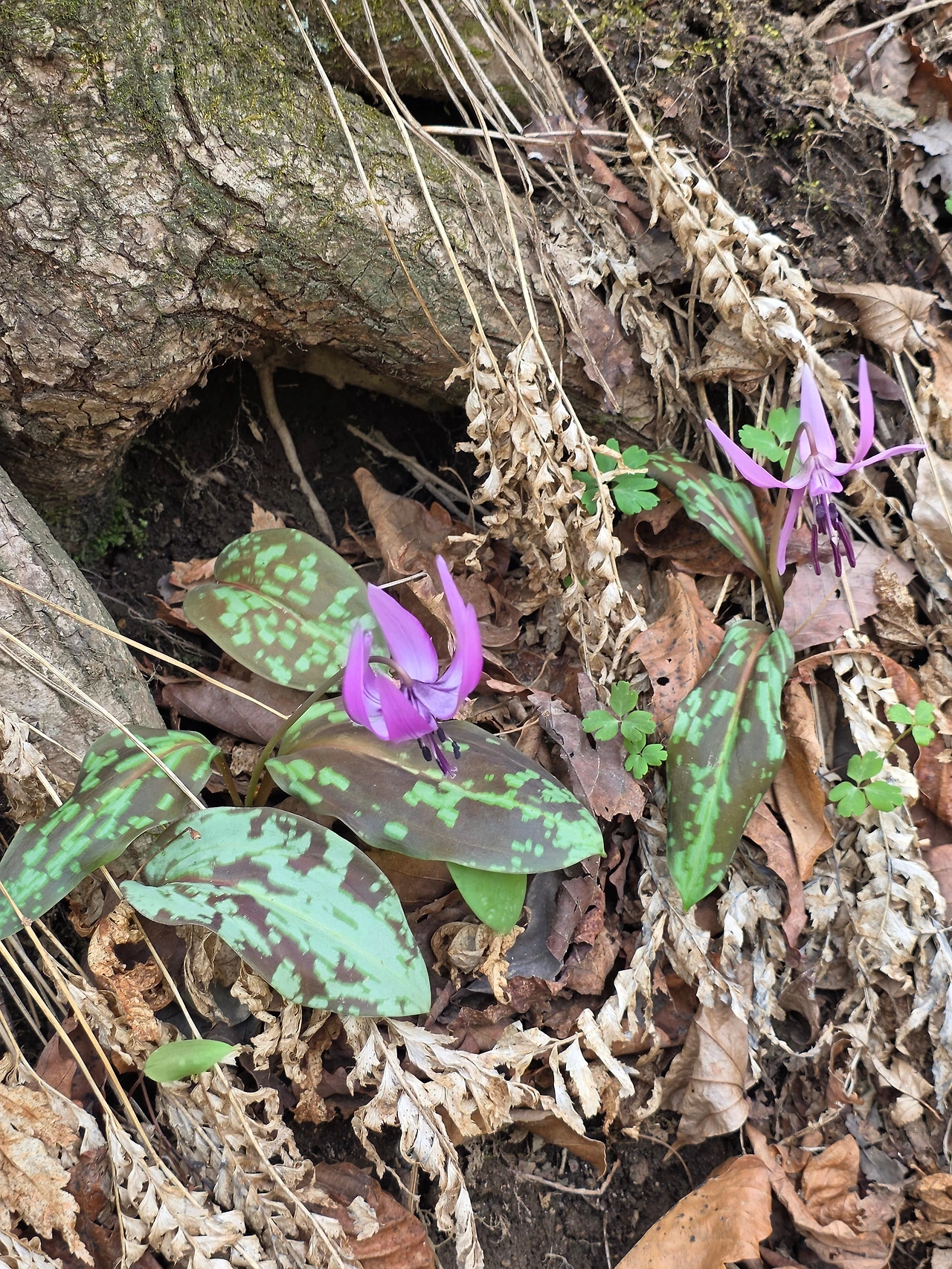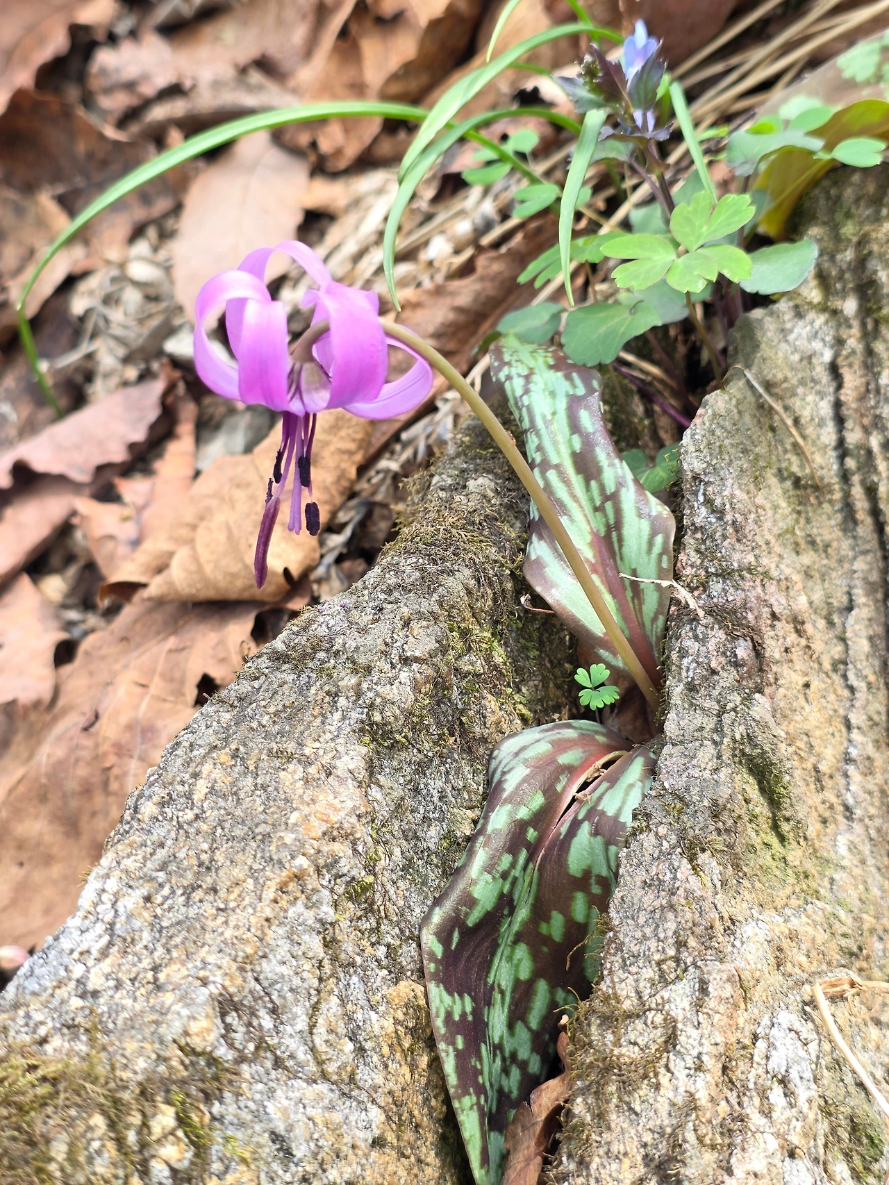 산을 좀 더 오르면 진객인 얼레지의 모습이 보인다. 성장한 성숙한 여인의 자태로 아주 고혹적이다. 나리꽃을 닮았지만 훨씬 화려하다. 이곳저곳 피어있는 모습이 다 매력적이어서 눈을 뗄 수가 없다.