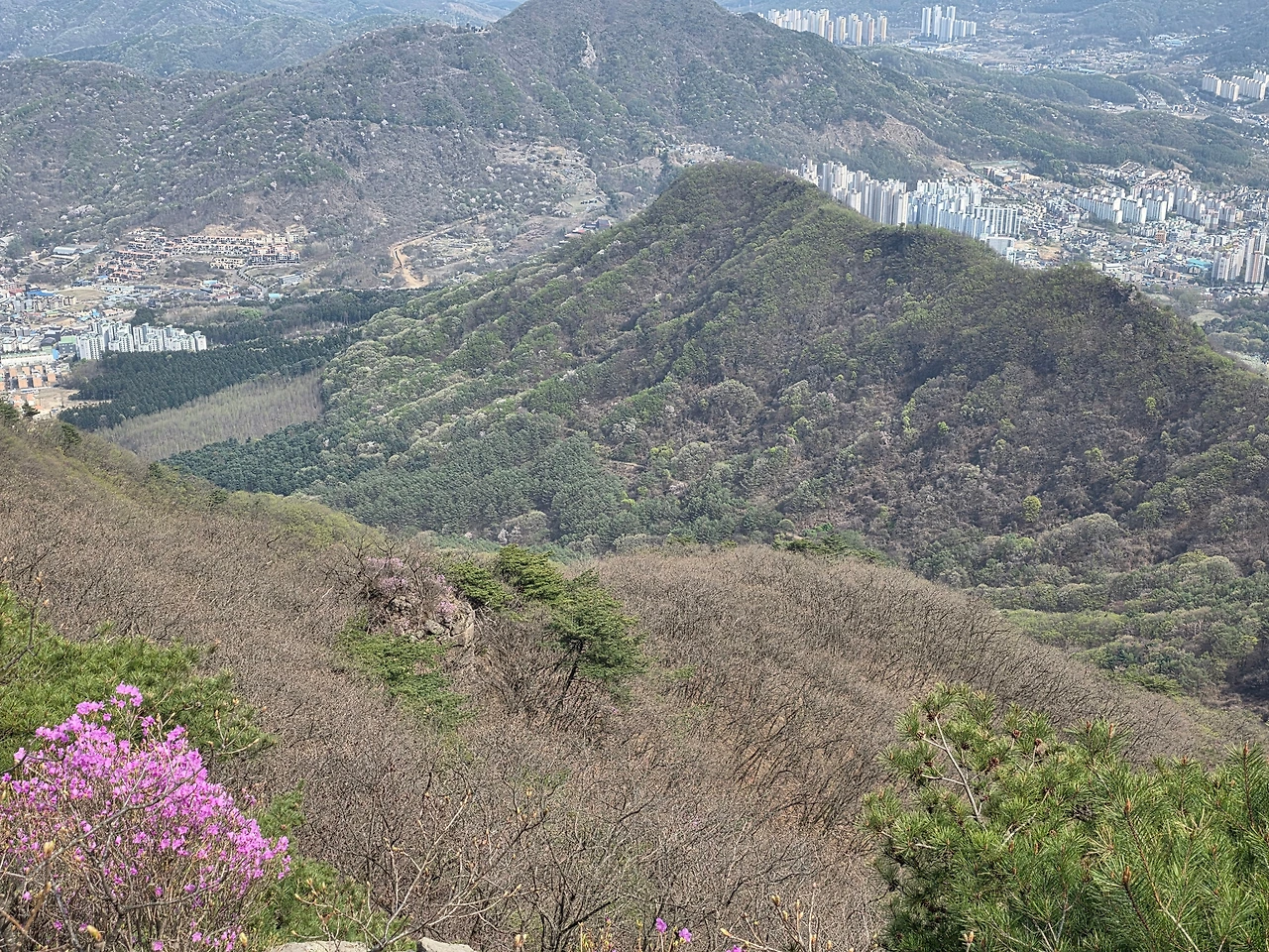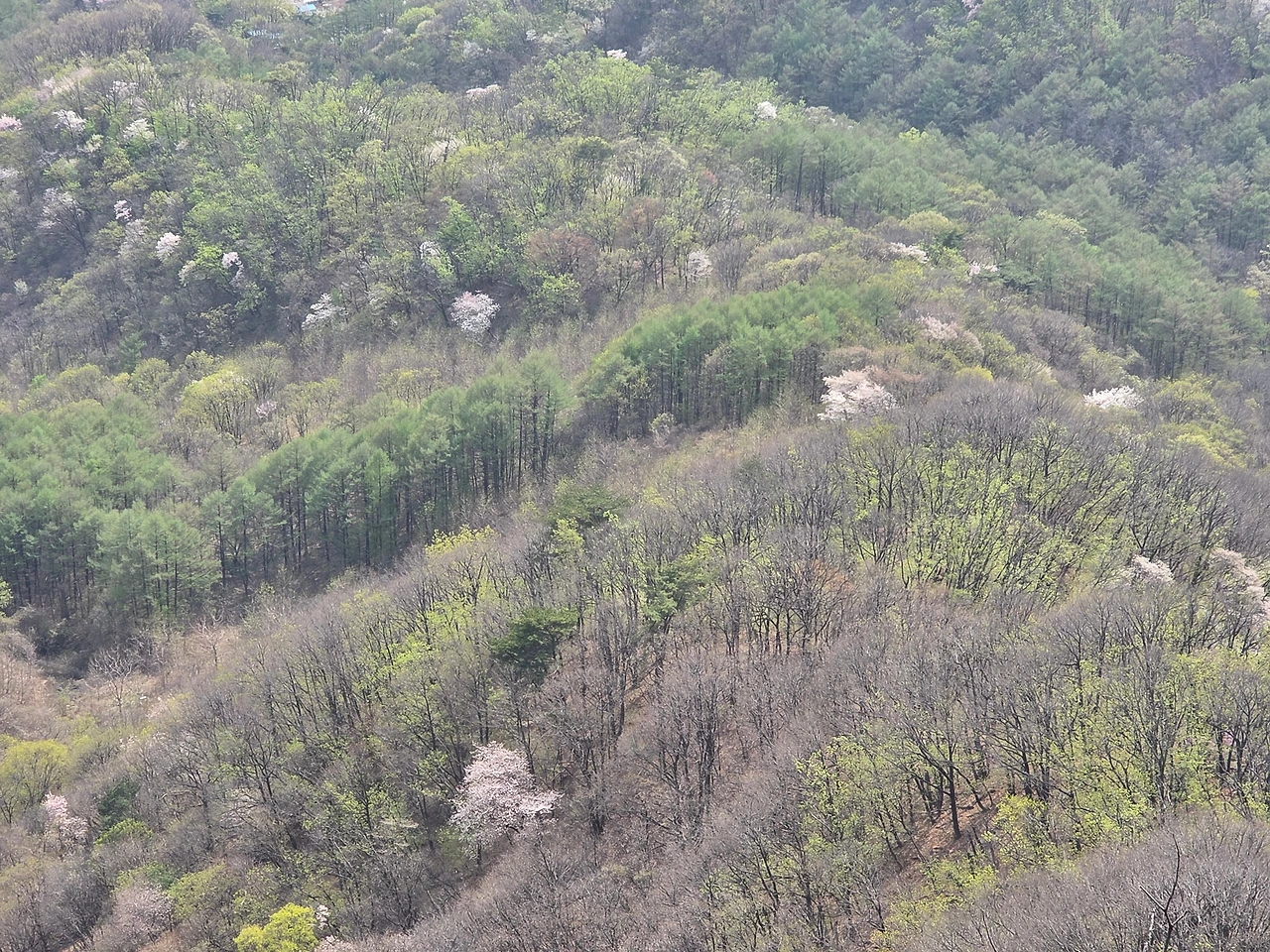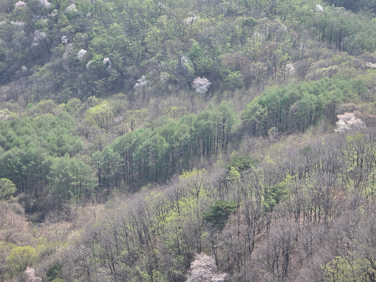 산을 내려오는 길에 멀리 보이는 산의 자취가 참으로 곱다. 봄철에 만날 수 있는 멋진 풍경이다.