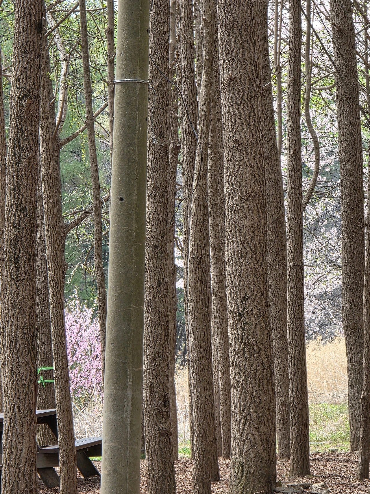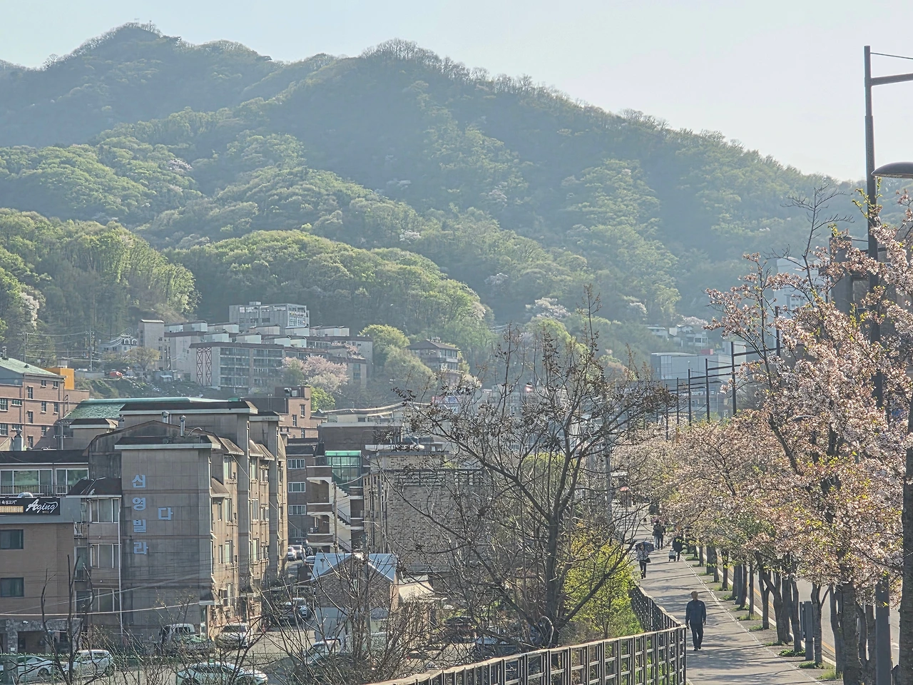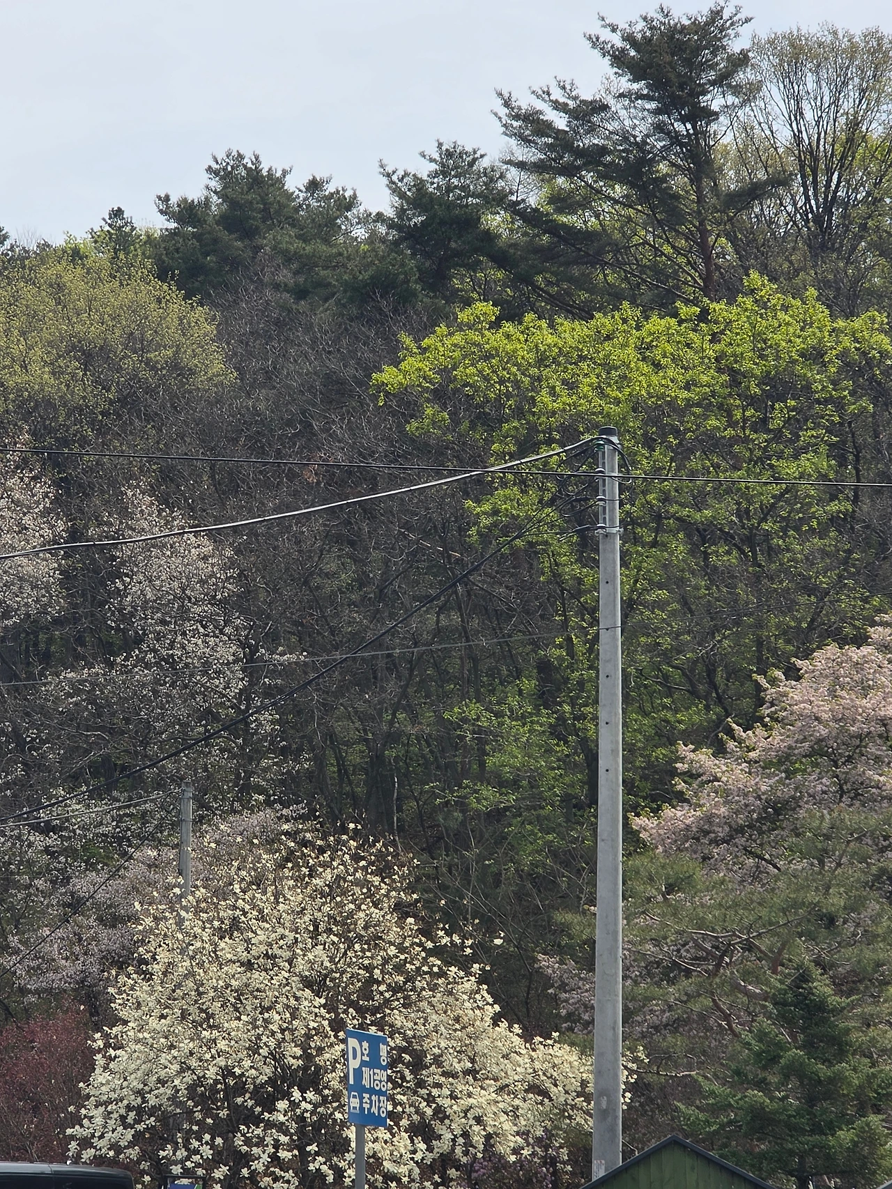 산을 내려오는 길에 멀리 보이는 산의 자취가 참으로 곱다. 봄철에 만날 수 있는 멋진 풍경이다.