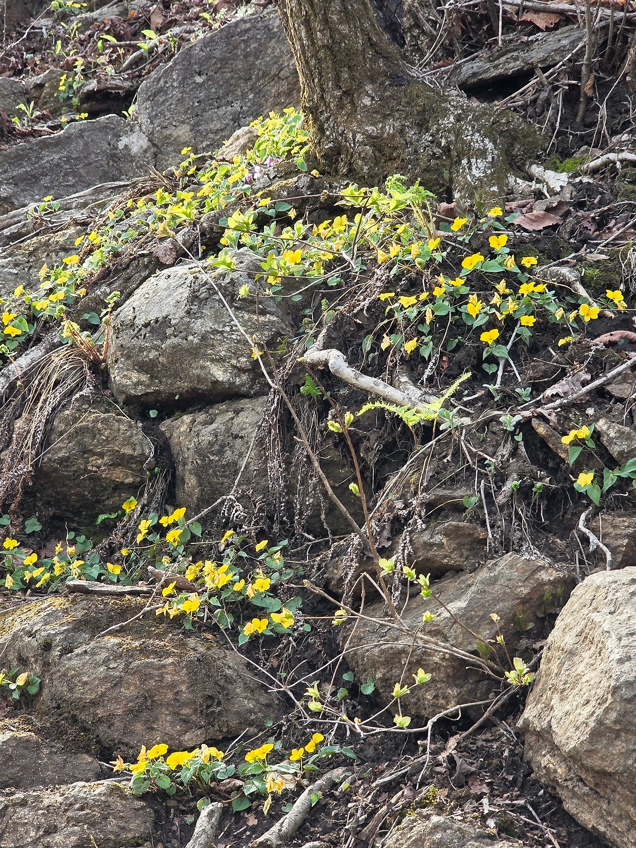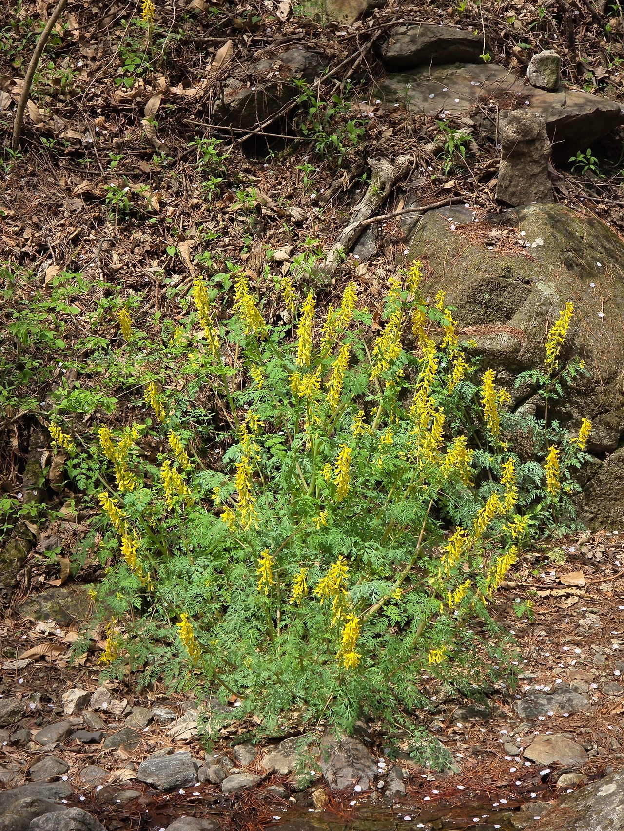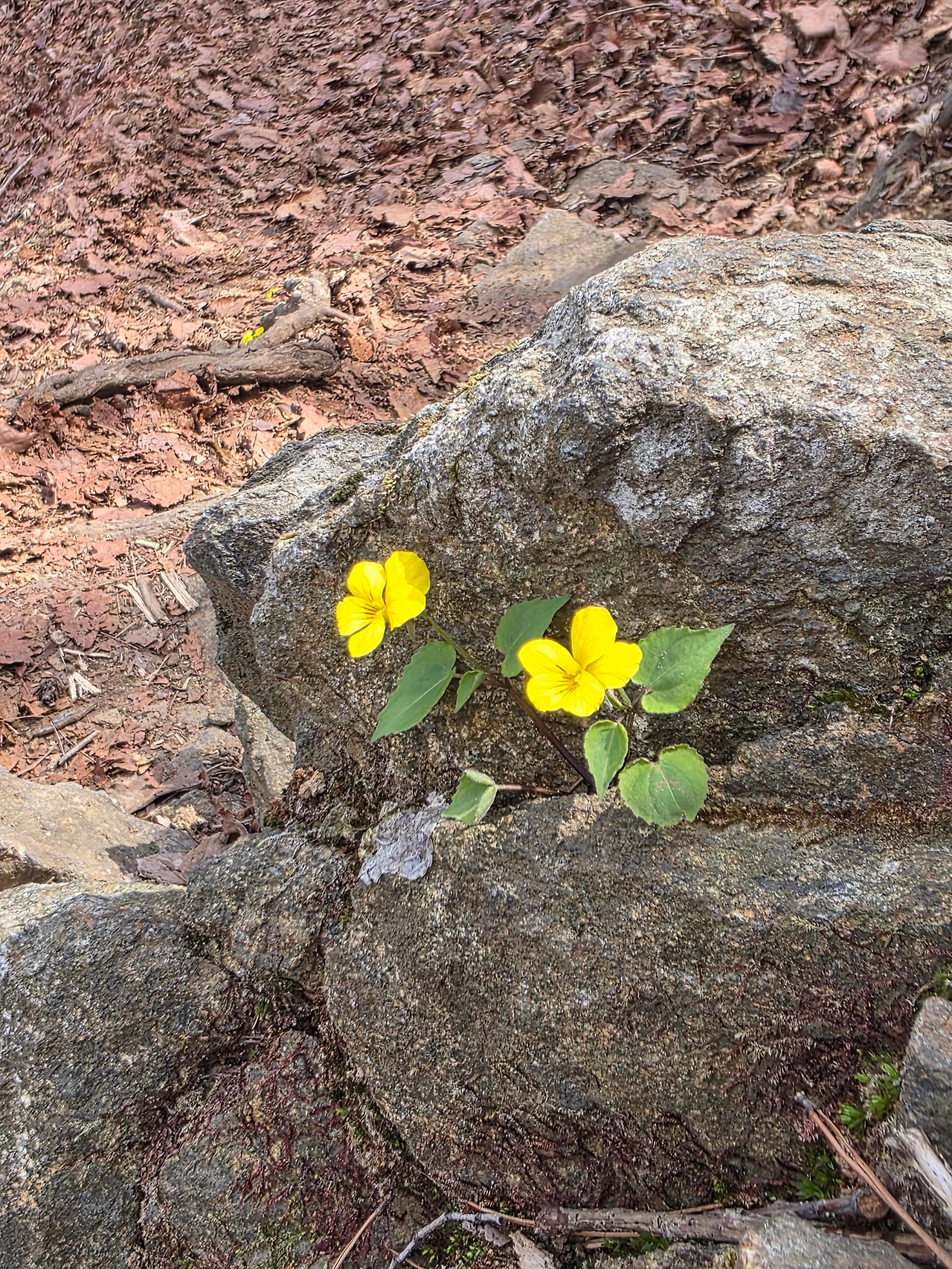 다른 산에서도 흔히 볼 수 있는 산괴불주머니와 제비꽃도 많았다. 제비꽃은 다양한 종류가 있었다. 그중 노랑제비꽃은 지천이었다. 잎이 알록달록한 알록제비꽃과 흔한 오랑캐꽃도 많았다.