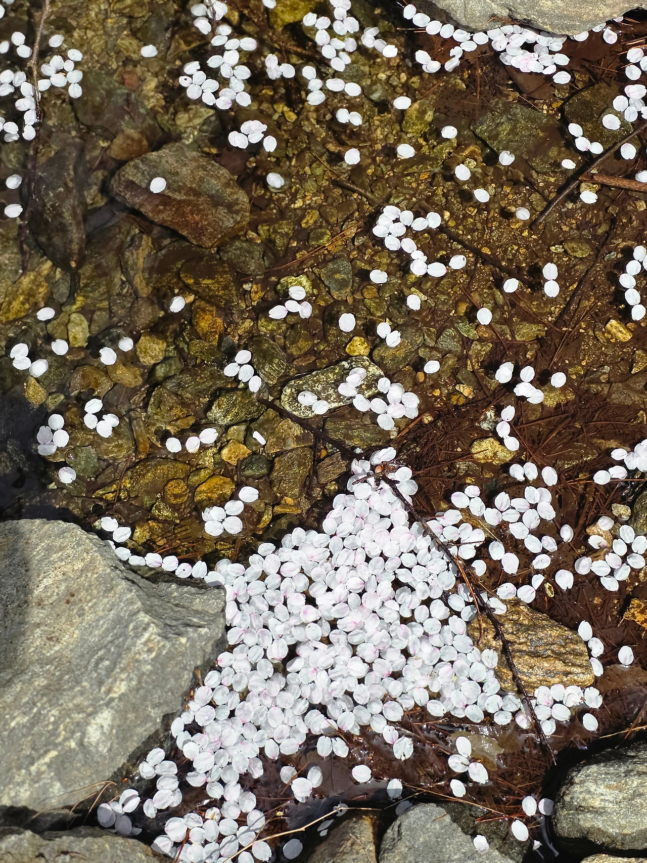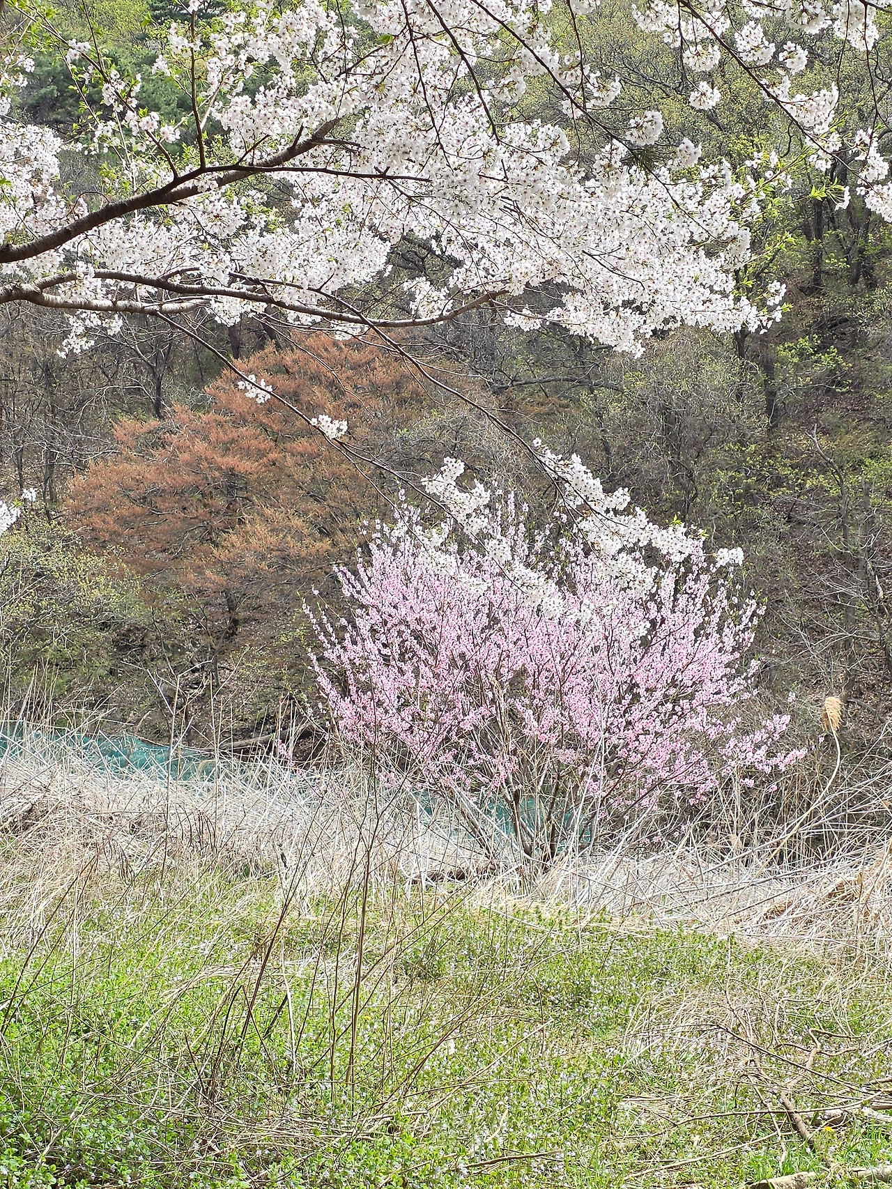 계곡에는 물이 졸졸졸 흘러 청량감을 더한다. 수면 위에 떨어진 꽃잎들이 무릉도원 전설을 들려주는 듯하다.