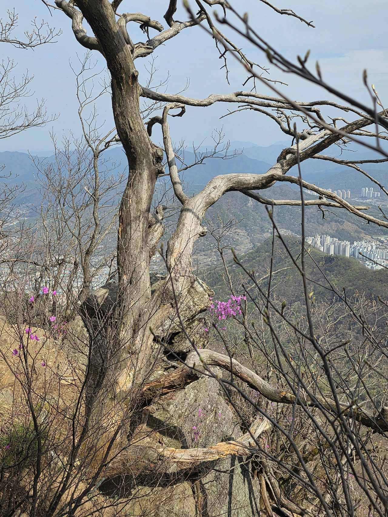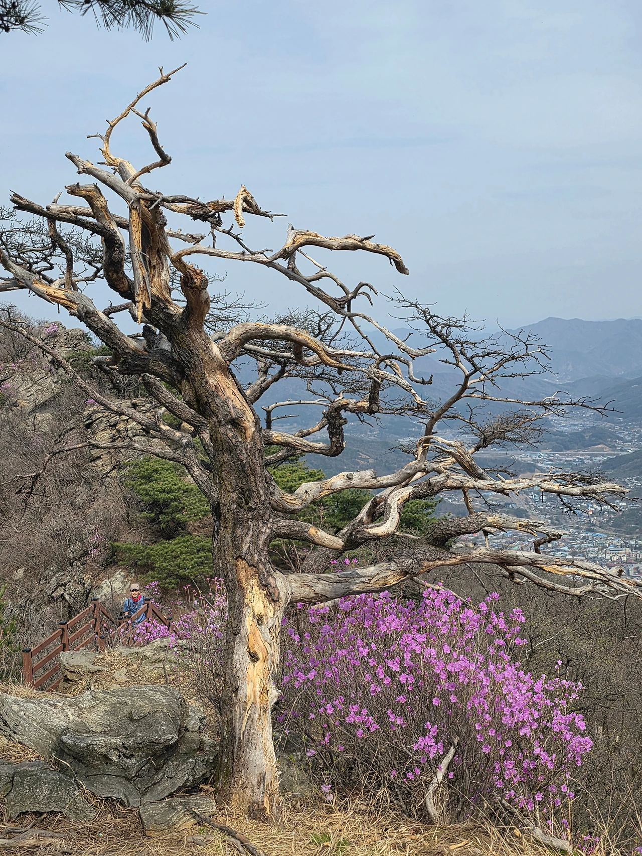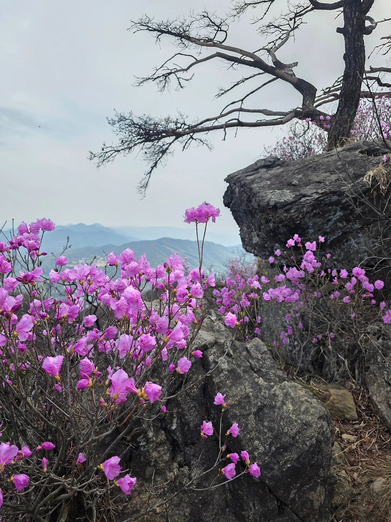 천마산 정상은 암벽이다. 고사한 소나무 사이마다 진달래 꽃이 무더기로 피었다.
