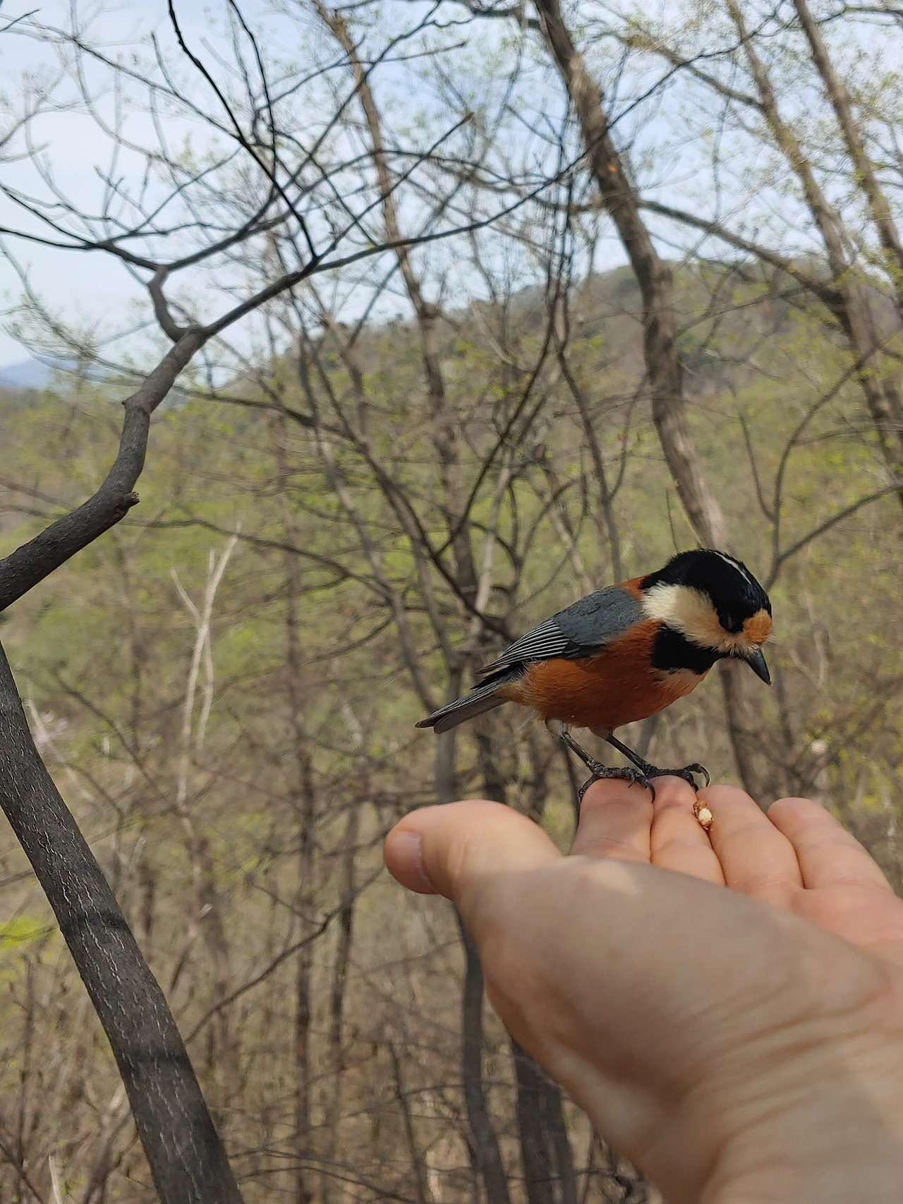 중간에 쉬다 곤줄박이를 만나는 놀라운 순간이 있었다. 땅콩을 들고 있는 손에 앉아 물고 가는 특별한 경험을 했다. 야생의 여린 발톱이 손에 닿는 촉감이 감동으로 다가왔다.