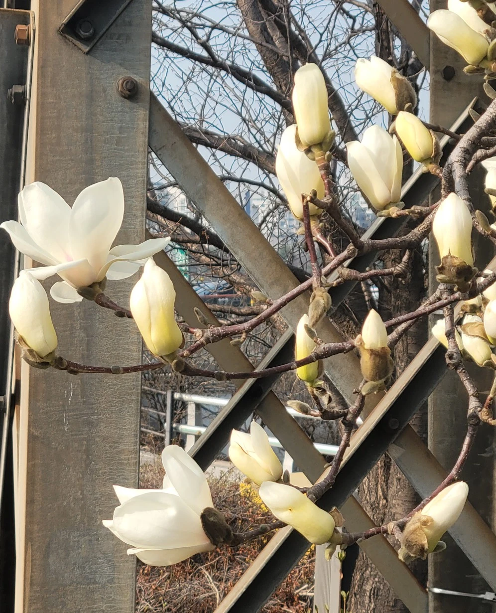 목련은 그렇게 주목받는 꽃이 아니다. 매화가 봄의 신호탄을 열면서 사람들에게 큰 사랑을 받고, 벚꽃은 본격적인 봄의 문을 열며 사람들의 열렬한 환영을 받는 것에 비해 목련은 틈새에 끼어 조용히 피어난다. 전에는 순차적으로 벚꽃이 지고 목련이 피었다. 하지만 올해를 보면 다 같이 피는 형국이다. 결과적으로 벚꽃이 주인공이 되어 봄철 분위기를 끌어가는 상황에서 목련은 조연이 될 수밖에 없다. 그럼에도 목련은 독보적인 아름다움을 선보인다.