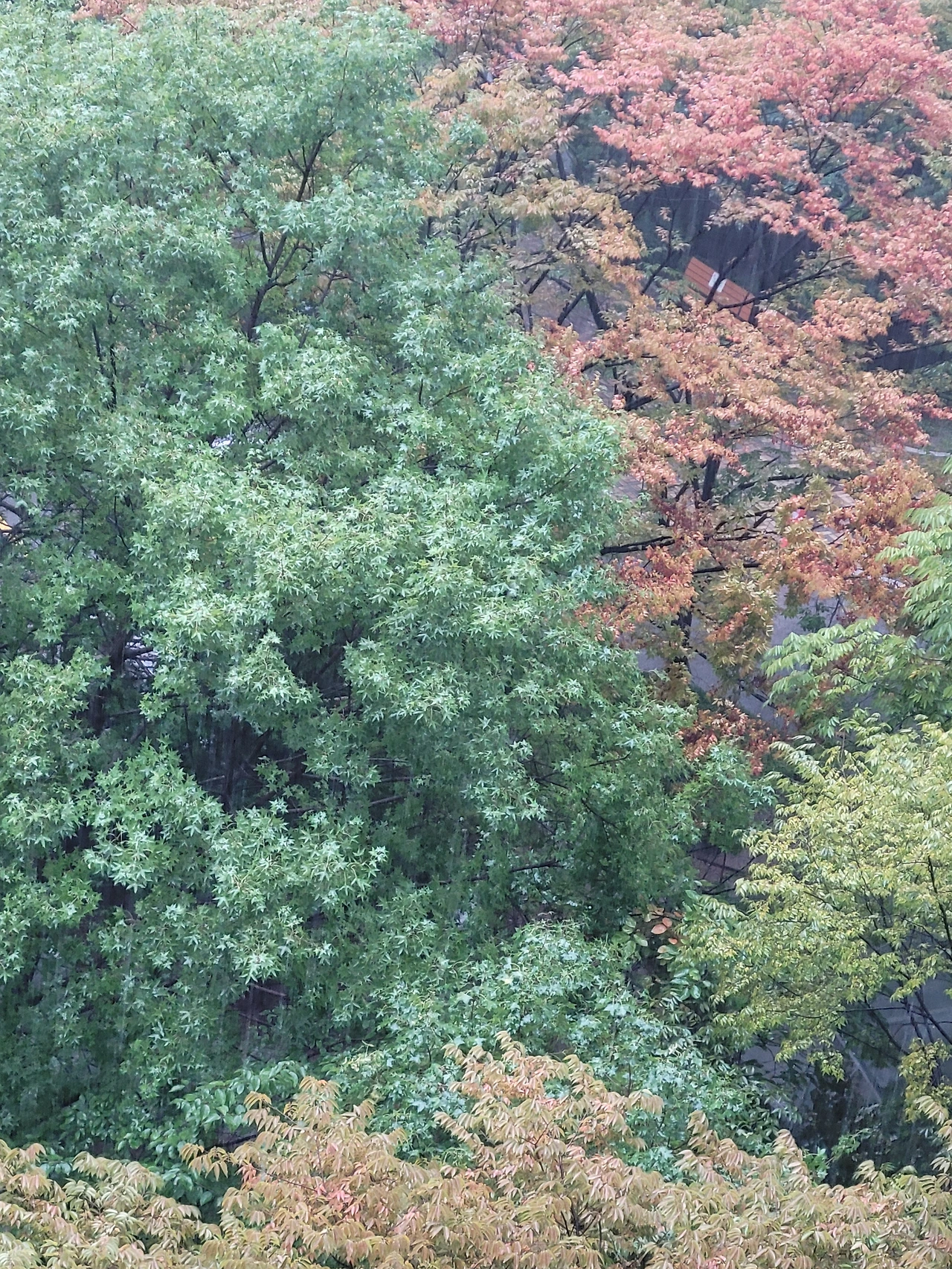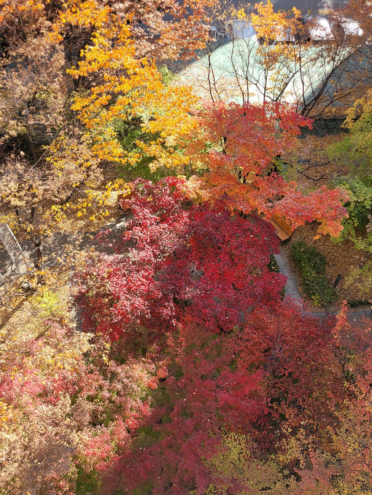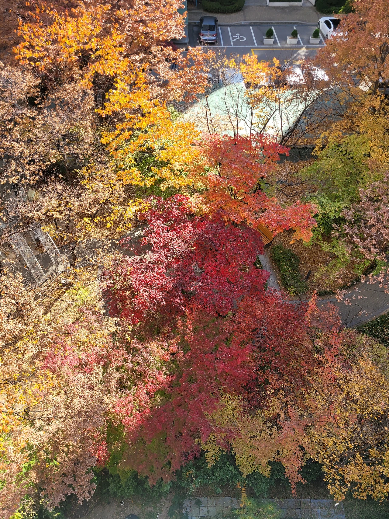 7 층 베란다에서 내려다 보이는 전망을 통해 사계절의 변화를 놓치지 않고 만난다. 베란다는 자연으로 가는 문이다. 눈에 보이는 나무는 느티나무가 주를 이루고 소나무와 단풍나무, 은행나무, 살구나무, 산수유 그리고 울타리용 회양목이 있다. 사각지대 한쪽에는 마로니에 한 그루도 보인다.또한 아파트 사이로는 거인처럼 하늘을 우러르며 까치둥지가 있는 메타세쿼이아도 자란다.