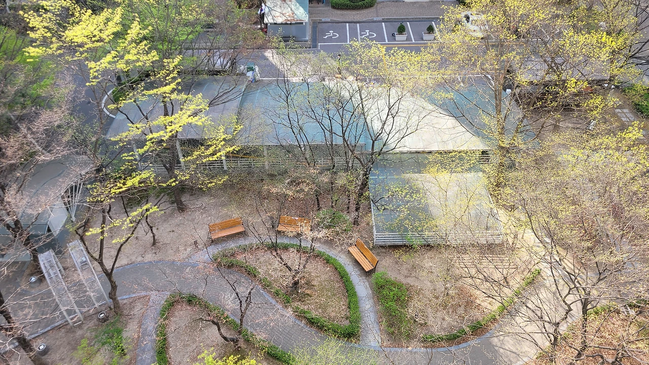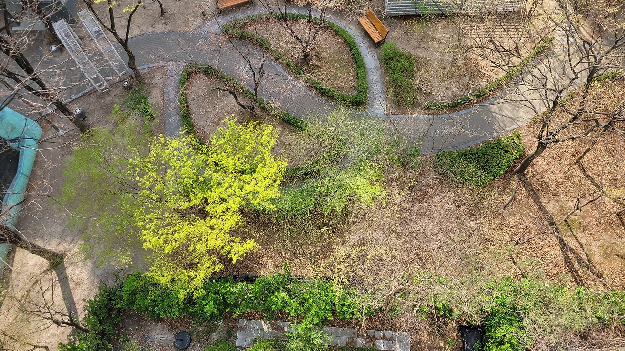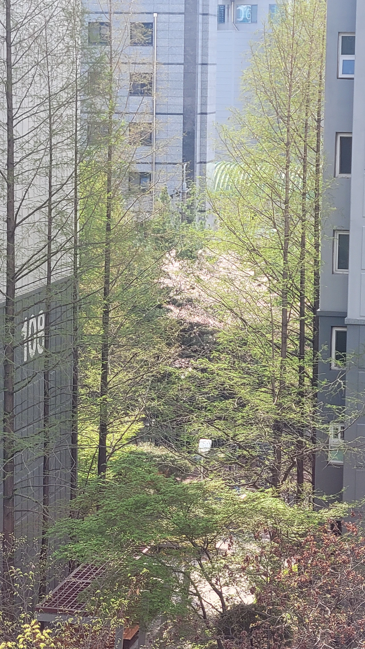 요즘 들어 벌거벗었던 느티나무의 우듬지에 움튼 싹들이 마치 꽃처럼 햇살에 반짝인다. 여전히 꽃송이가 달린 빛바랜 산수유가 연한노란빛을 뿌리고 살구나무에도 꽃이 드문드문 남아있다. 아직은 휑한 분위기이지만 나뭇가지에 새순들이 자라나 초록물이 들어 생동감이 묻어난다. 건너 아파트 주위에 활짝 핀 목련이 눈에 띄게 고혹적인 자태를 뽐내고 있다. 나뭇가지 사이로 자리 잡은 텅 빈 벤치가 보인다. 녹음이 한창일 때는 아늑하게 보이던 풍경이 조금은 을씨년스럽다.