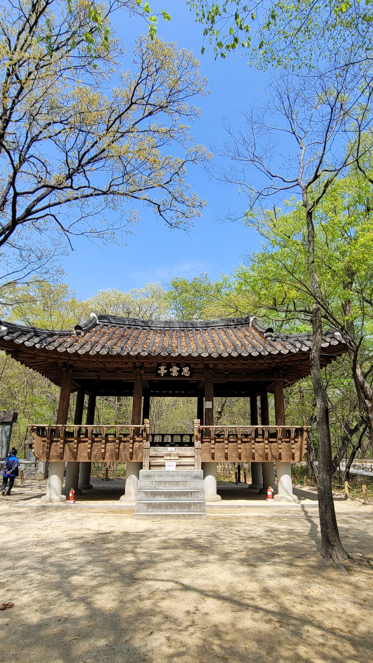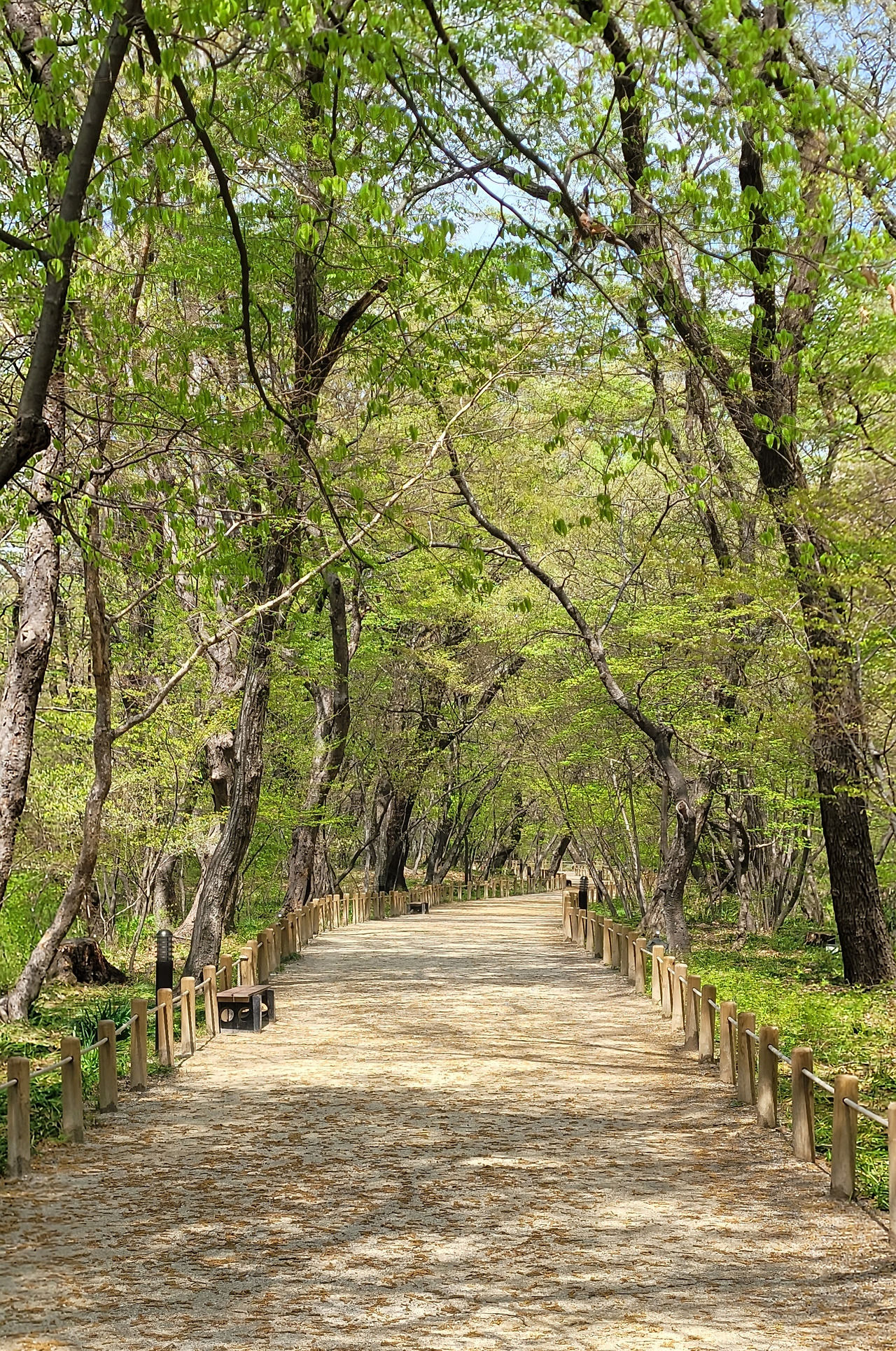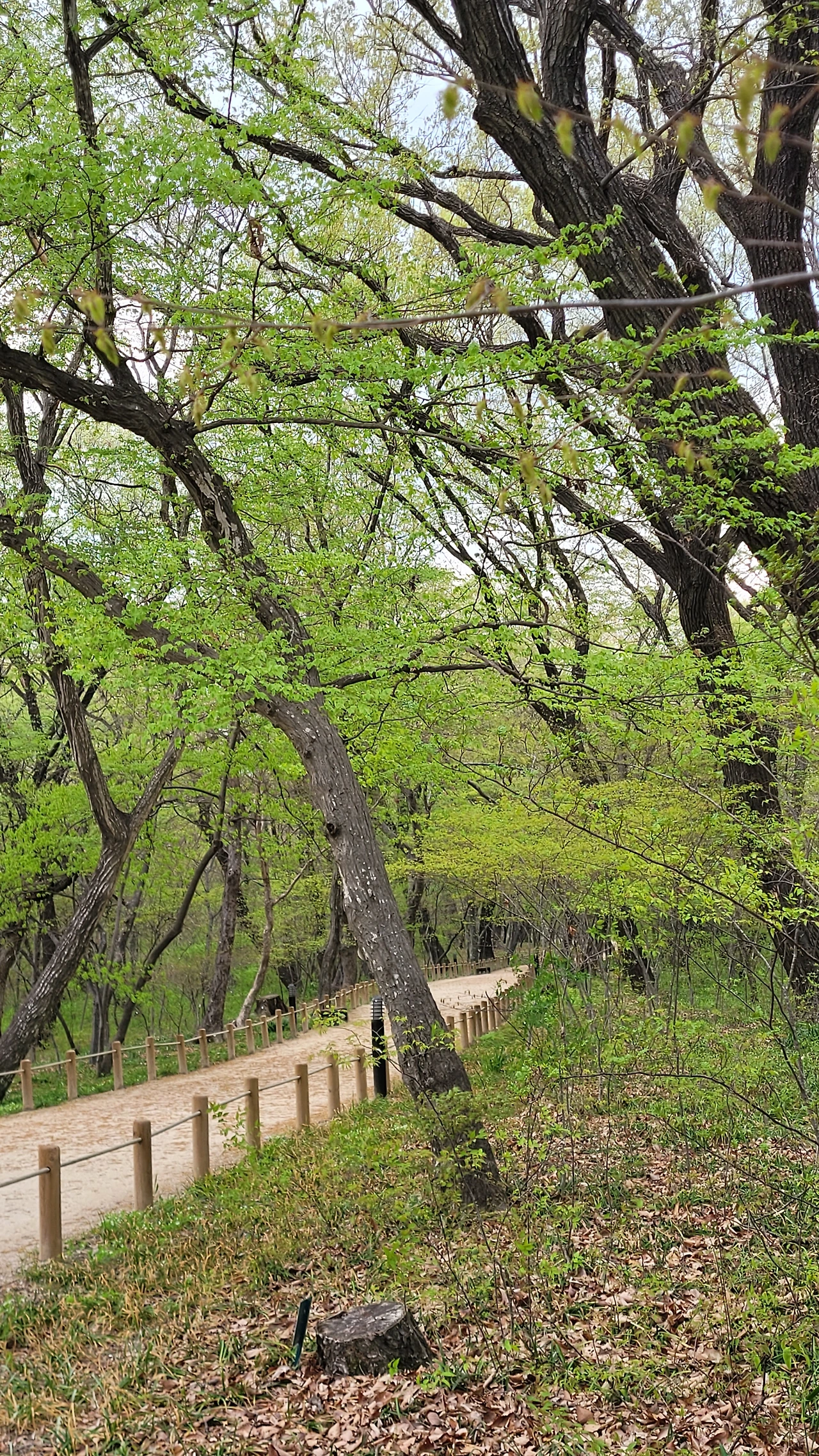 숲에는 아름드리 고목들이 빽빽하게 자라고 있어 숲이 울창했다. 활엽수 위주로 새싹이 자라나 지금은 하늘이 잘 보이지만 녹음이 우거지면 숲 터널이 될 것 같았다. 수종은 갈참나무 같은 참나무 종류에 개서어나무, 느티나무가 주류를 이루었다. 유구한 역사를 지녀 좀 더 큰 고목들이 있을 줄 알았는데 생각보다 그러질 못한 것이 조금은 안타까웠다. 길가에는 꽃무릇이 자란다. 가을이면 한꺼번에 붉은 꽃을 피워 장관을 이룬다고 한다.