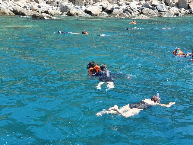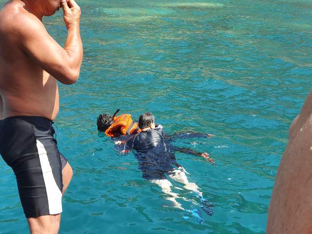 대고 구명조끼와 물안경을 쓰고 바닷속을