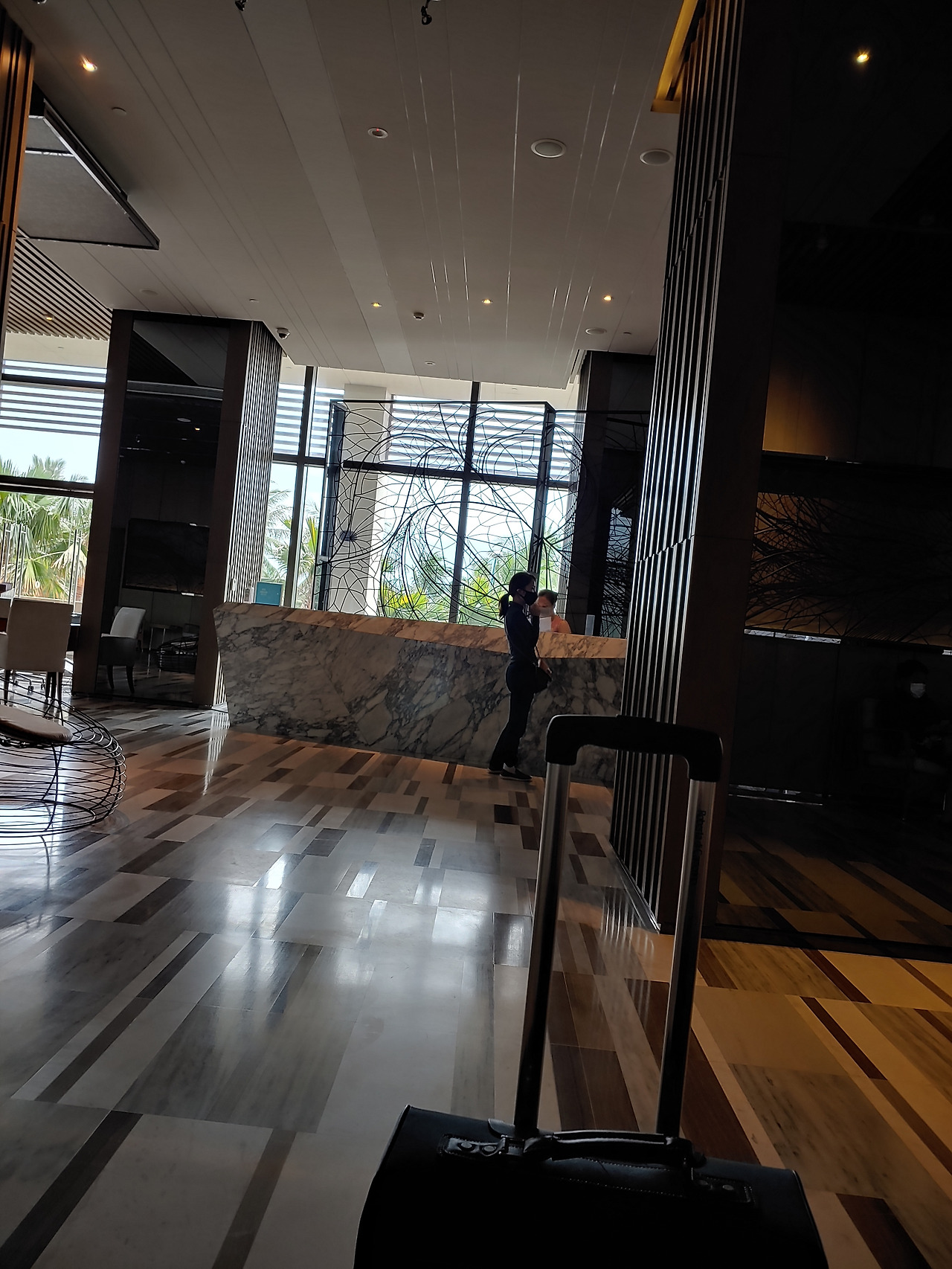 딸이 체크 아웃을 하는 동안 호텔 로비를 둘러본다