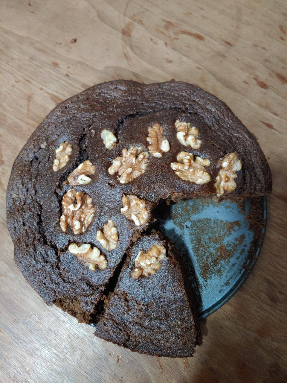 달걀 두 개와 통밀가루, 약간의 단맛을 위해 설탕 2스푼을 넣고 맨 위에 호두를 장식하여 에어 프라이기에 25분간 구웠다.